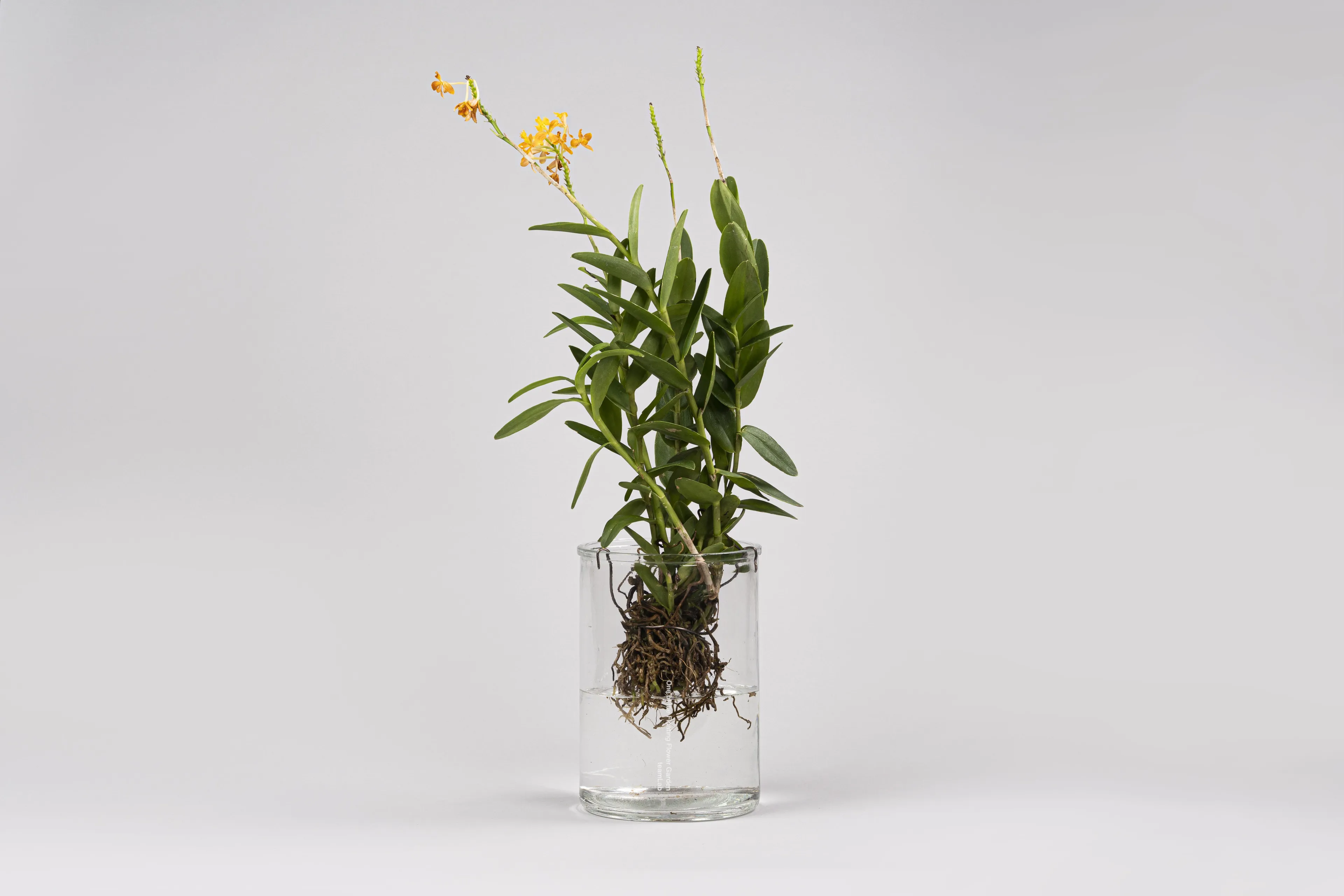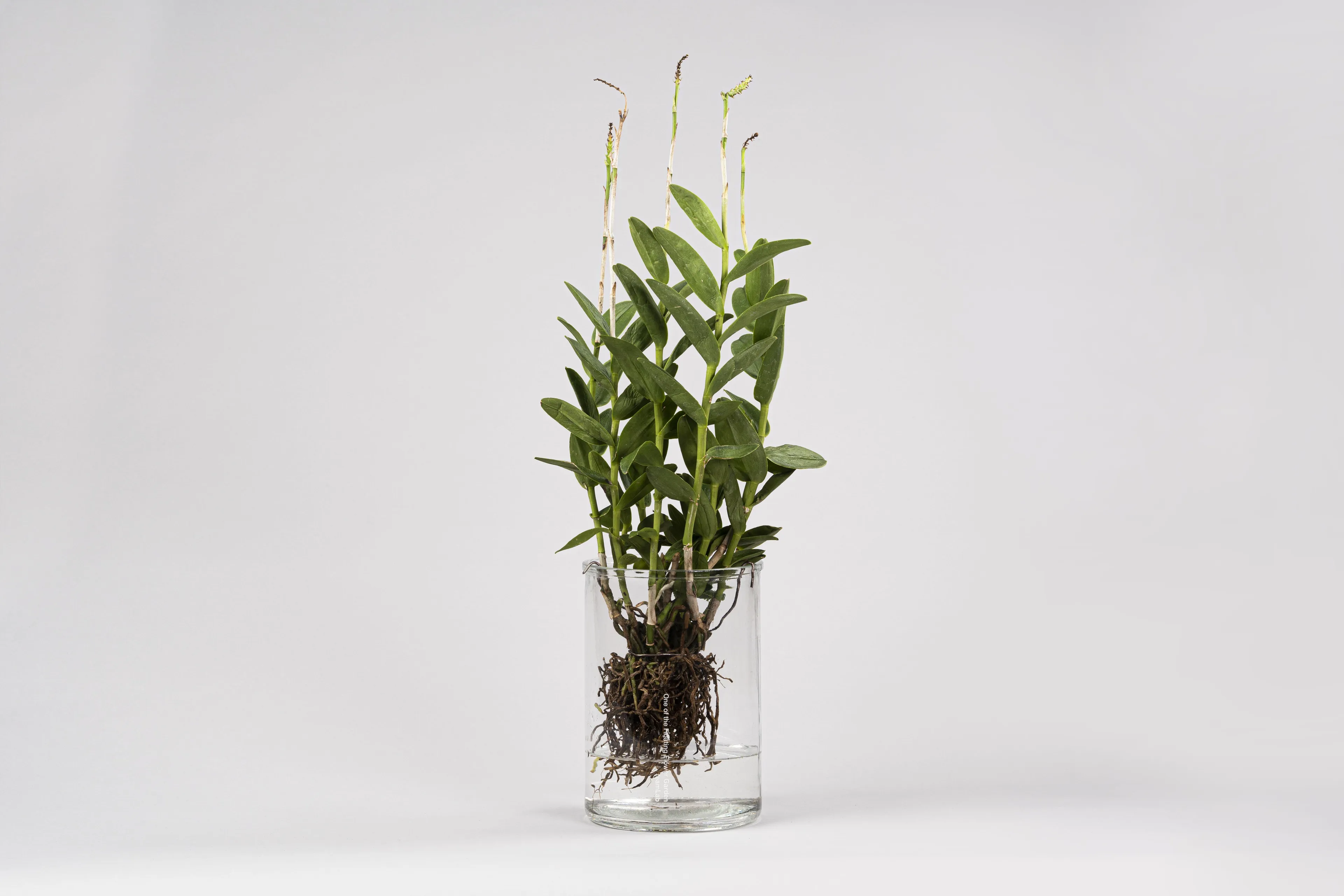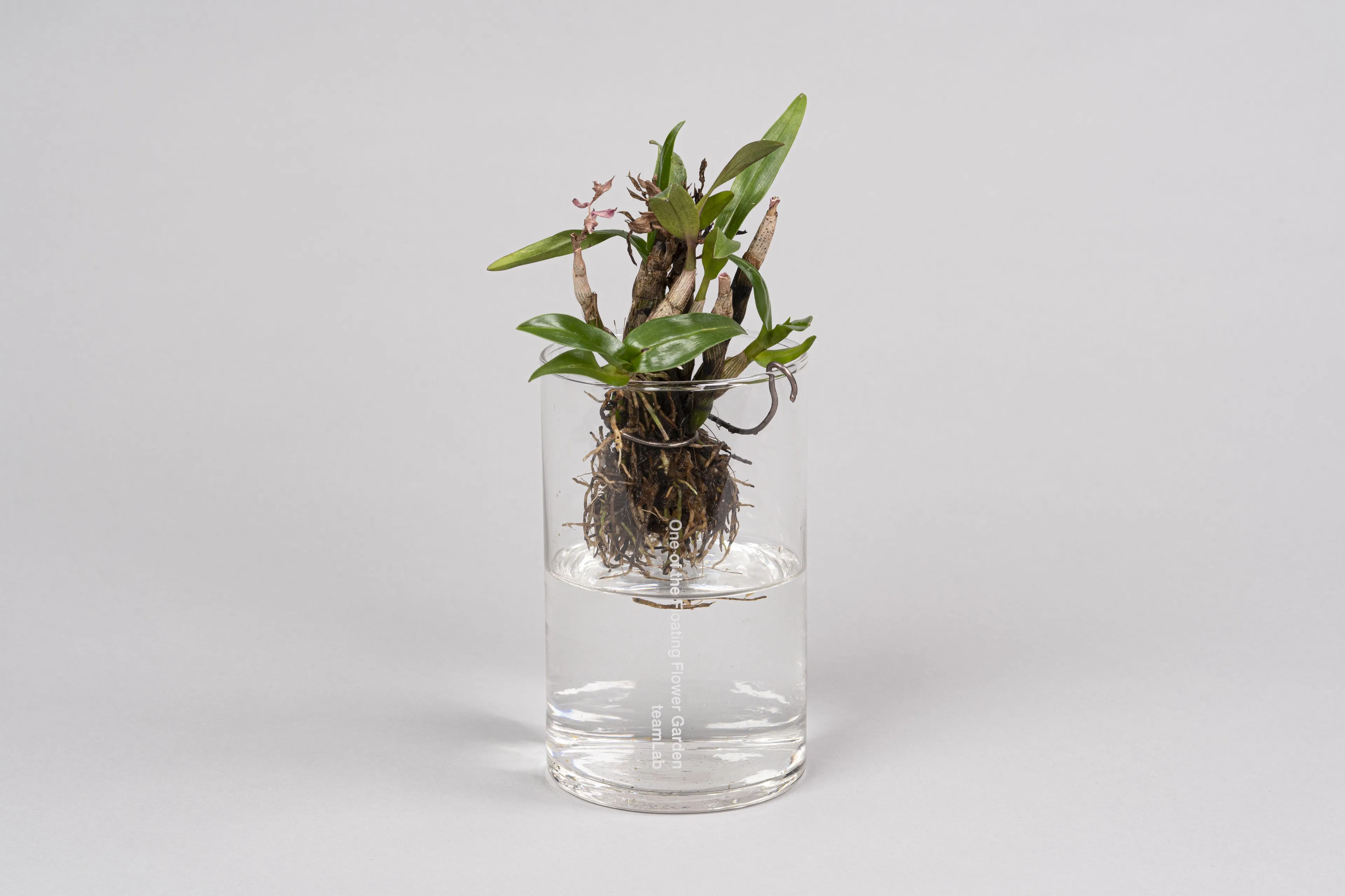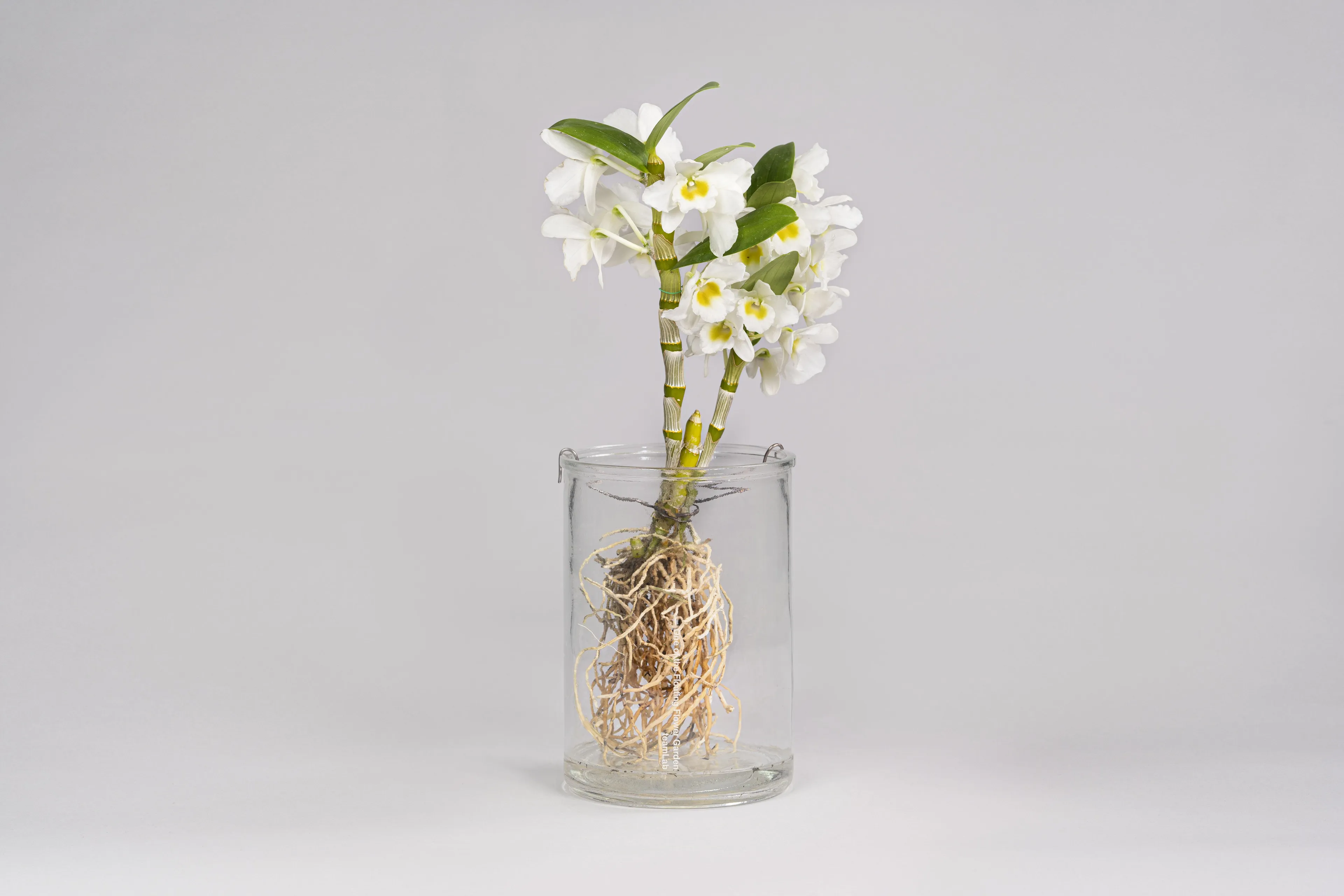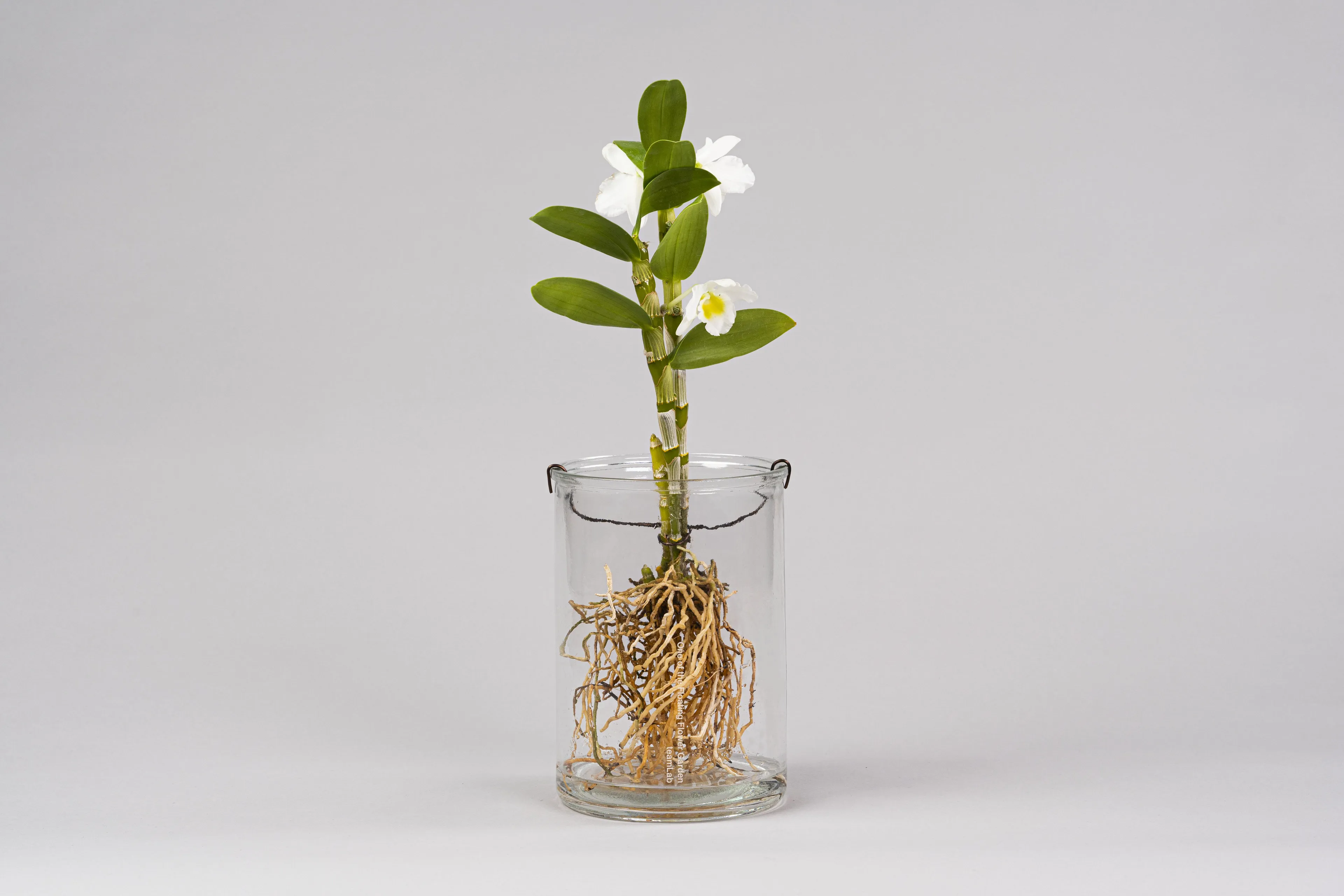 Place one of the orchids from Floating Flower Garden in this glass vase to appreciate it in its entirety including its roots, filled with the power of life.