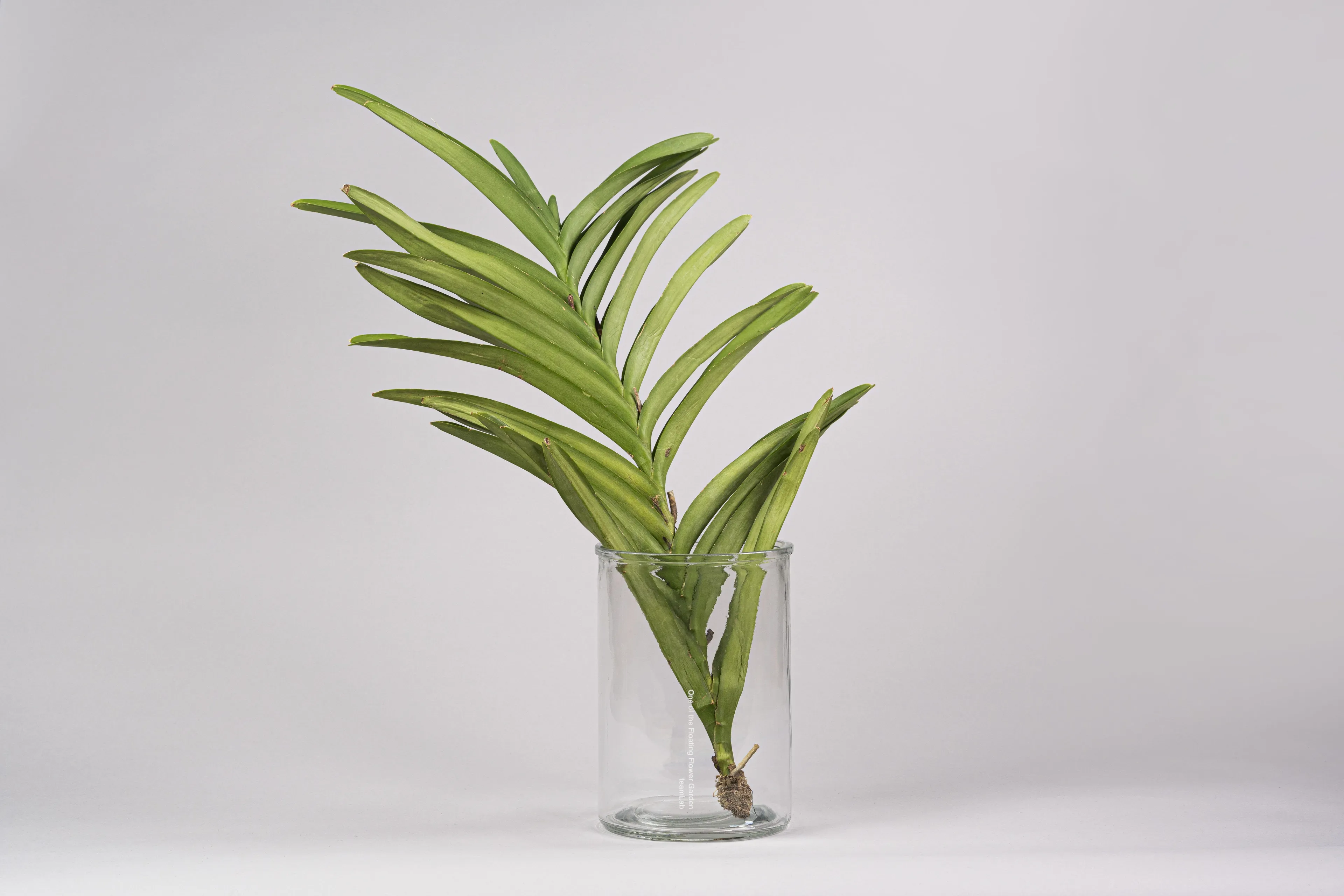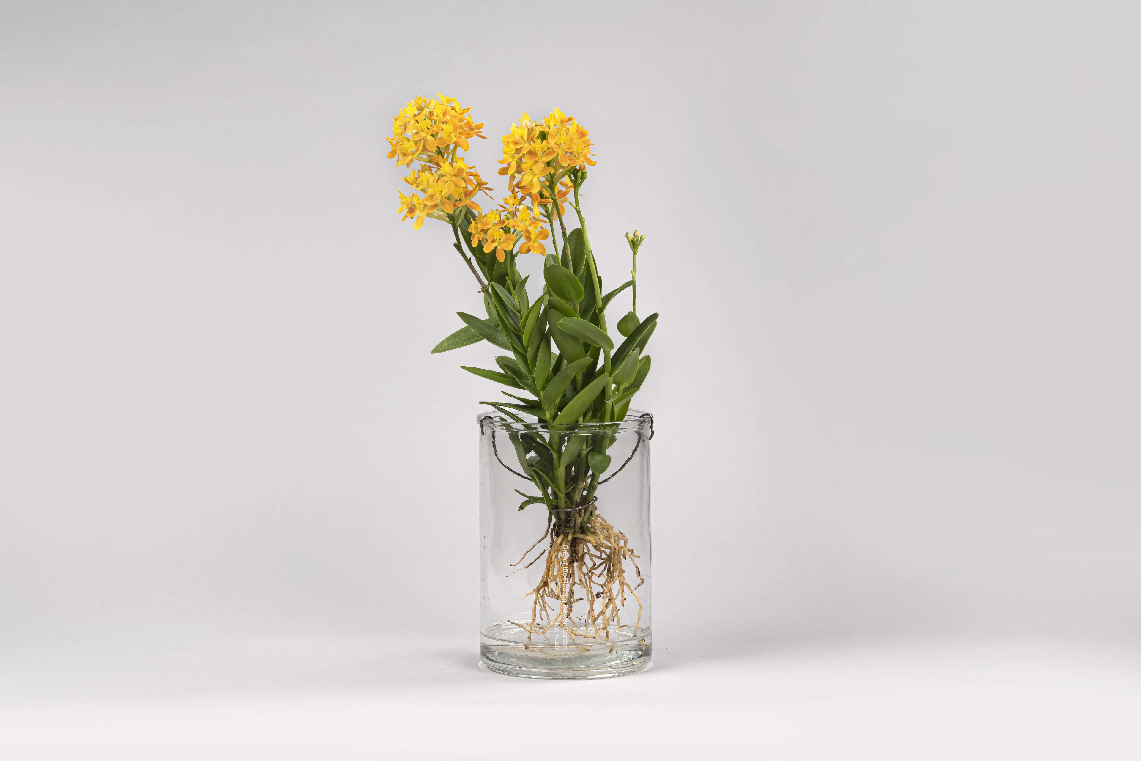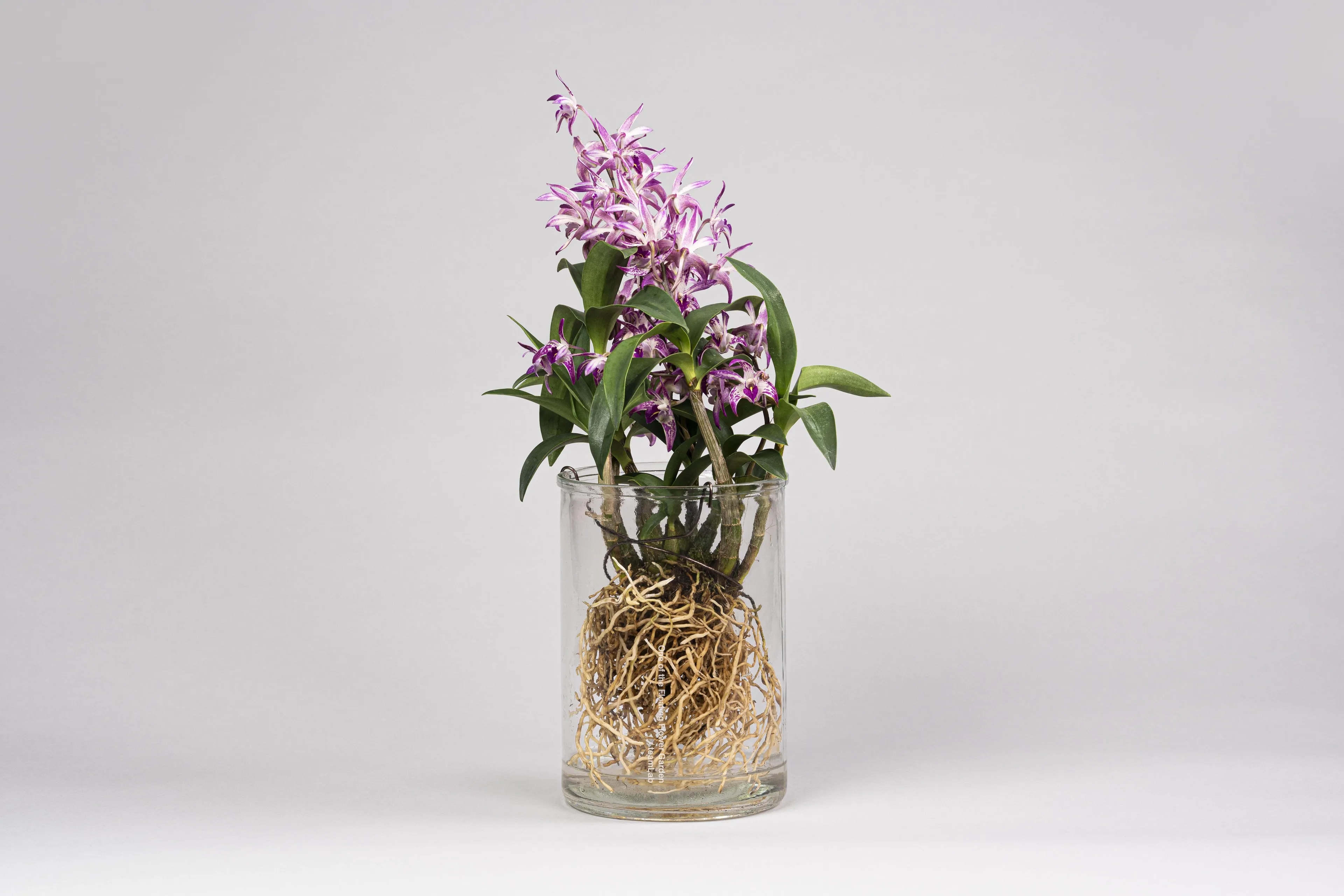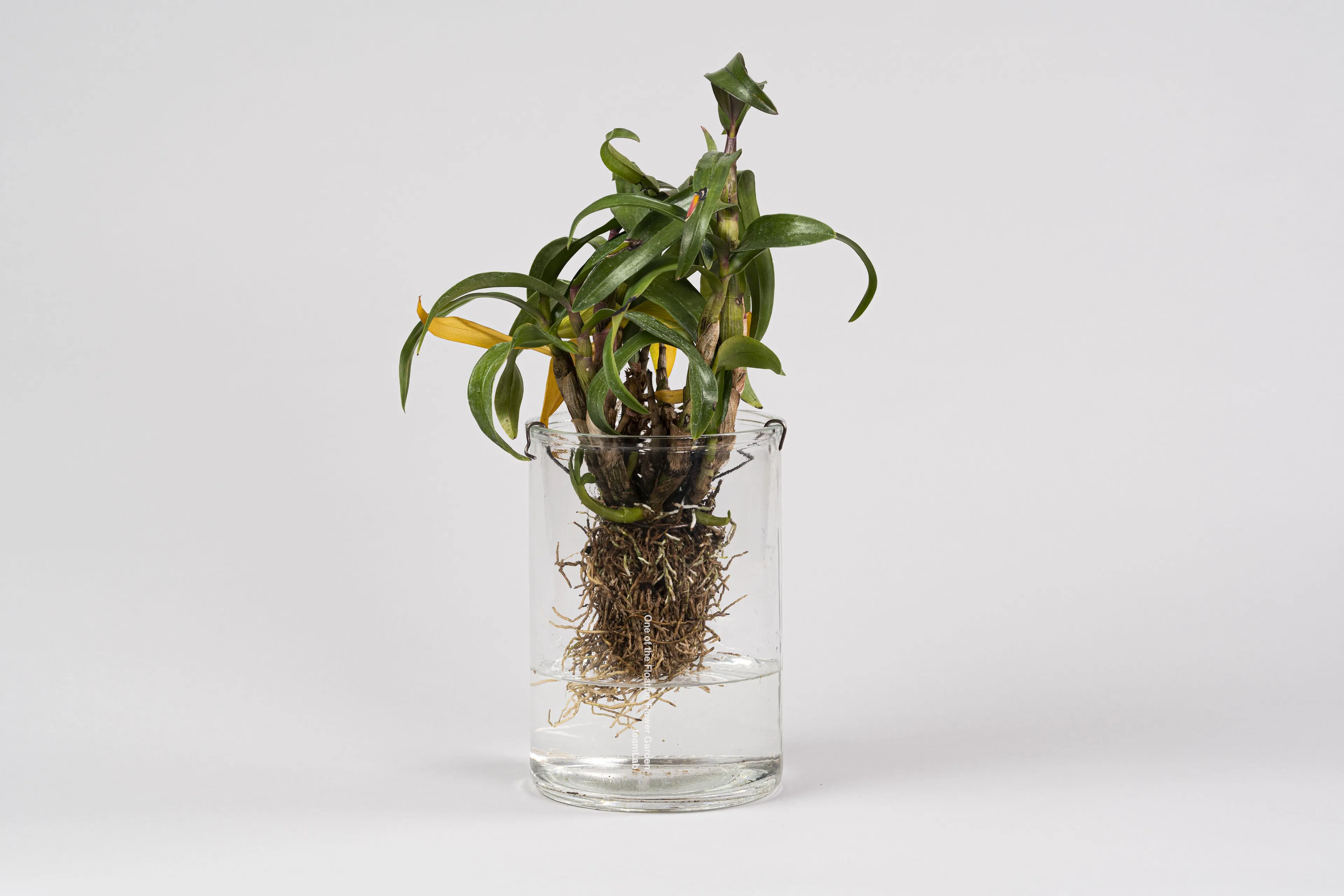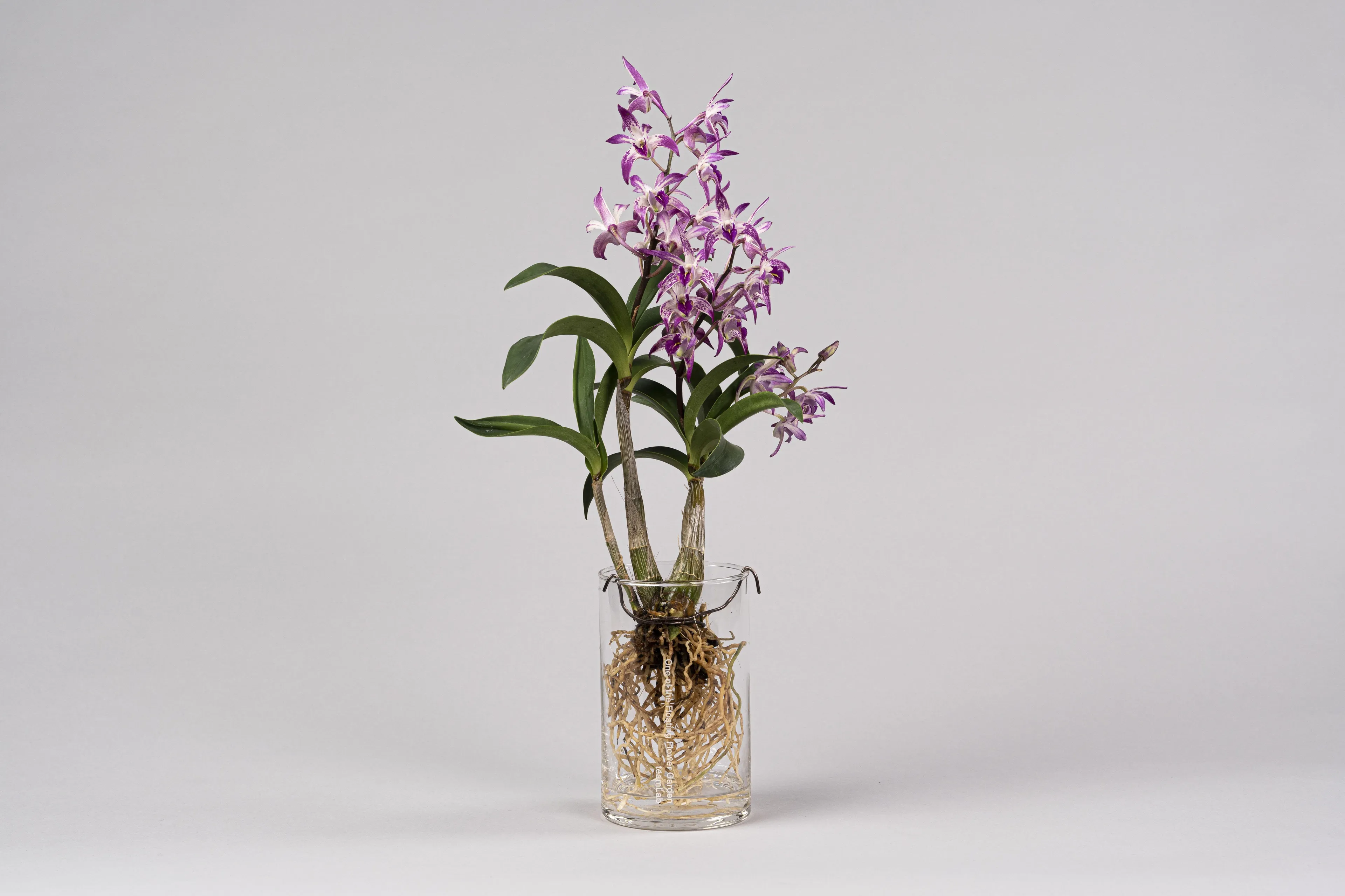 Place one of the orchids from Floating Flower Garden in this glass vase to appreciate it in its entirety including its roots, filled with the power of life.