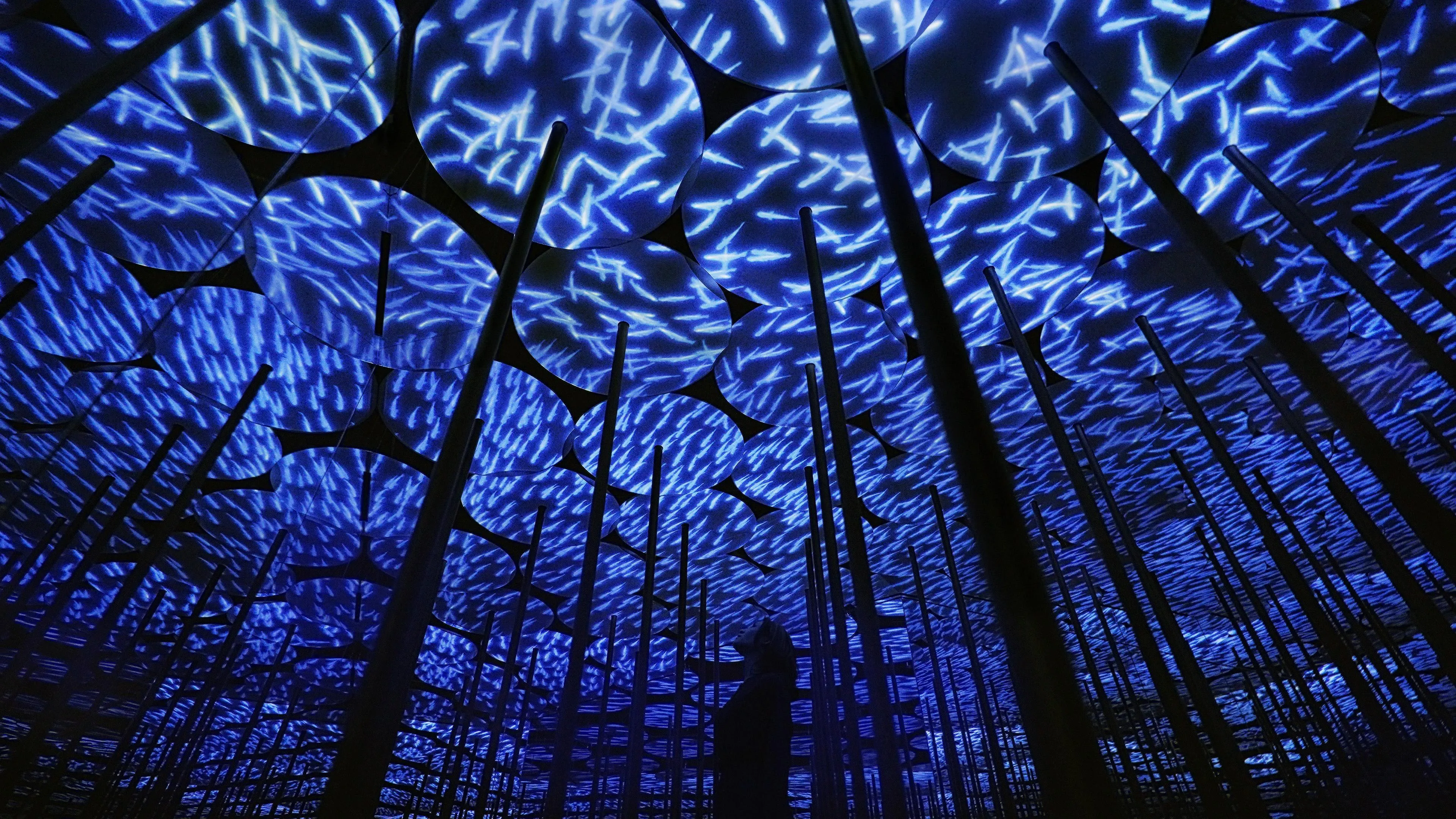 The shoal of fish rendered in light swim freely around the space. People who enter this space are assigned a certain color, and when a fish passes by a person, it takes on the same color.