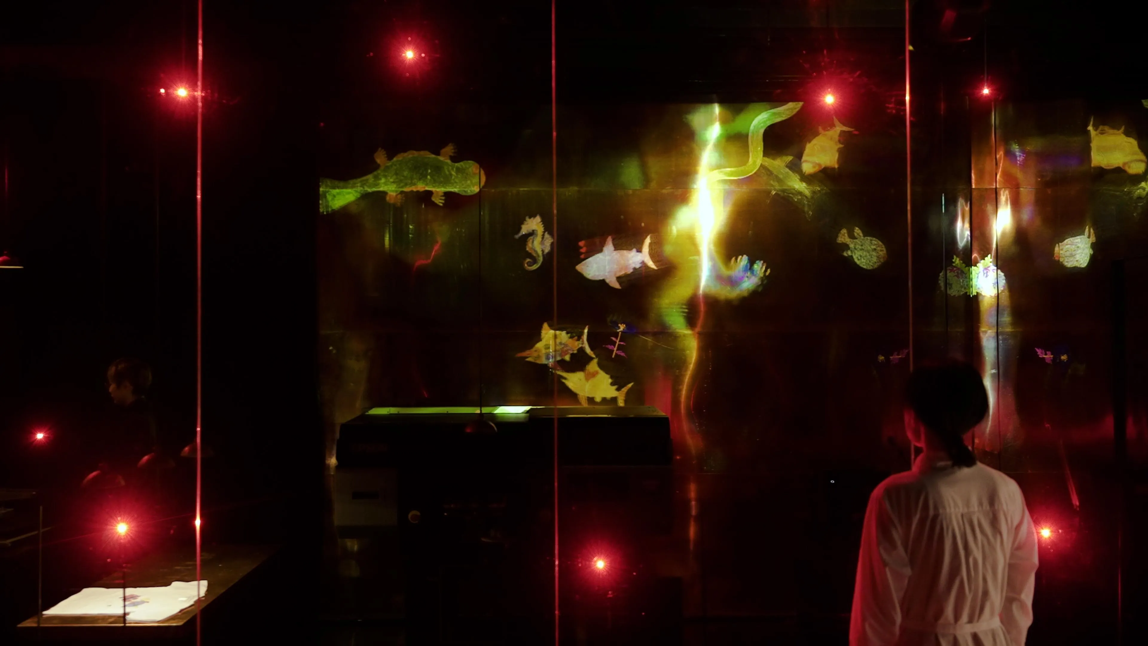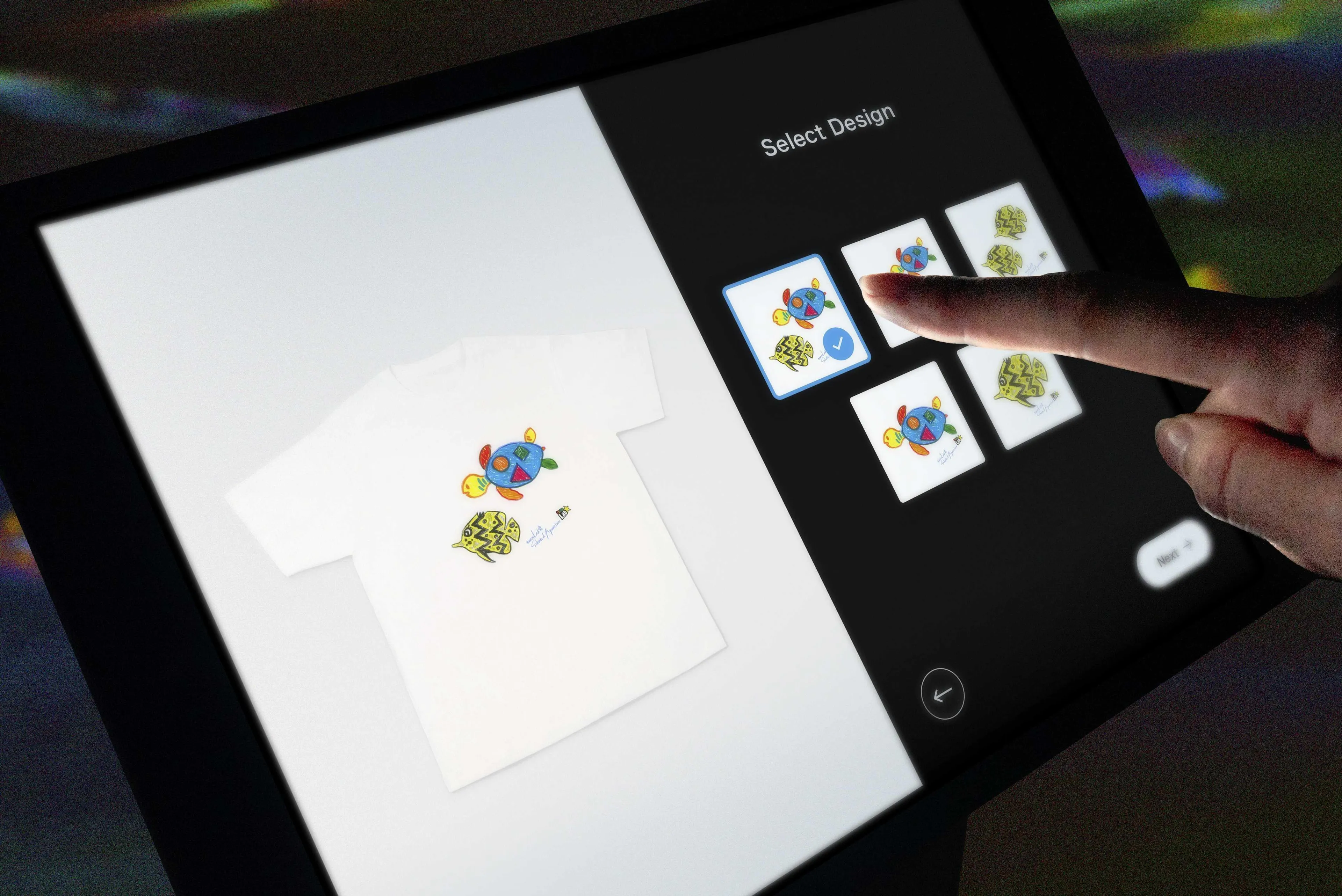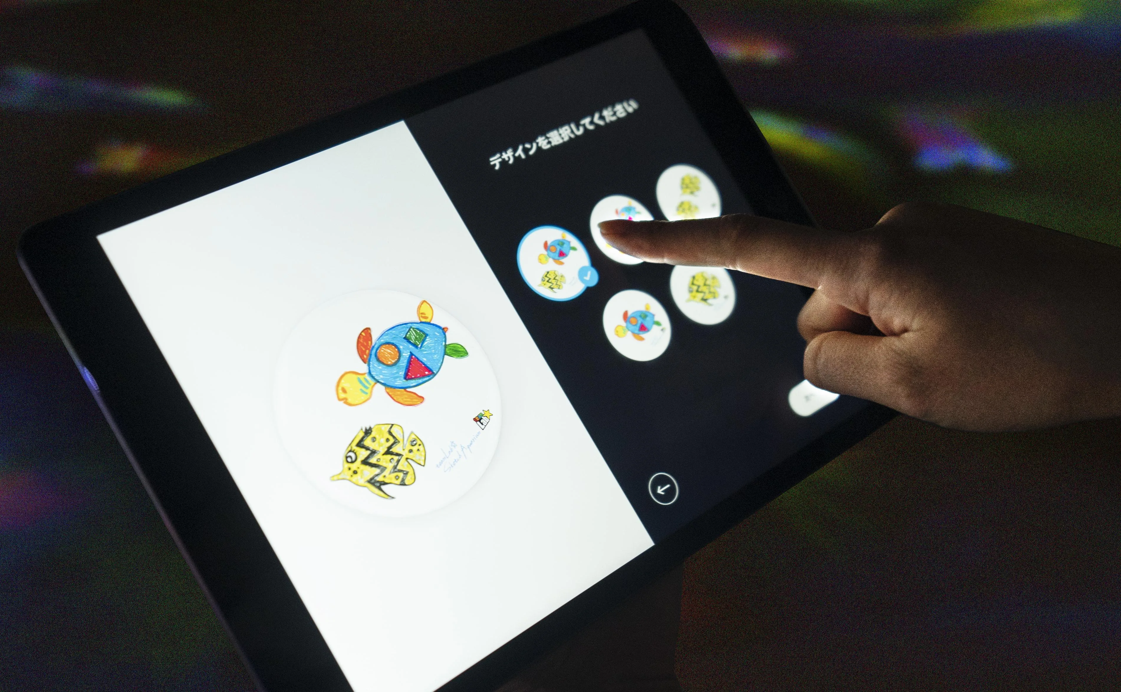 This is a factory where the fish and creatures that you draw can be made into an original item (tin badge, T-shirt, or tote bag) and taken home.