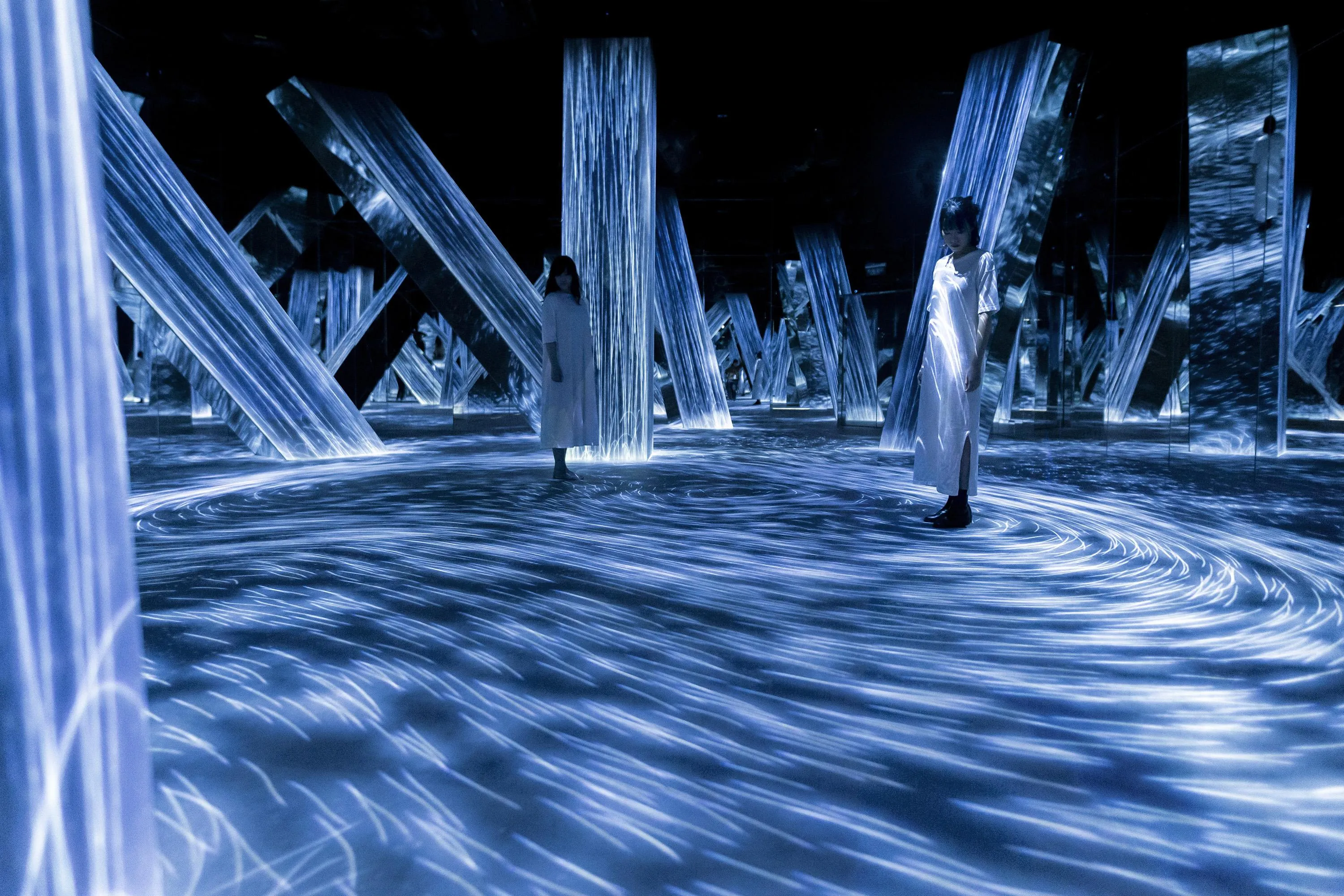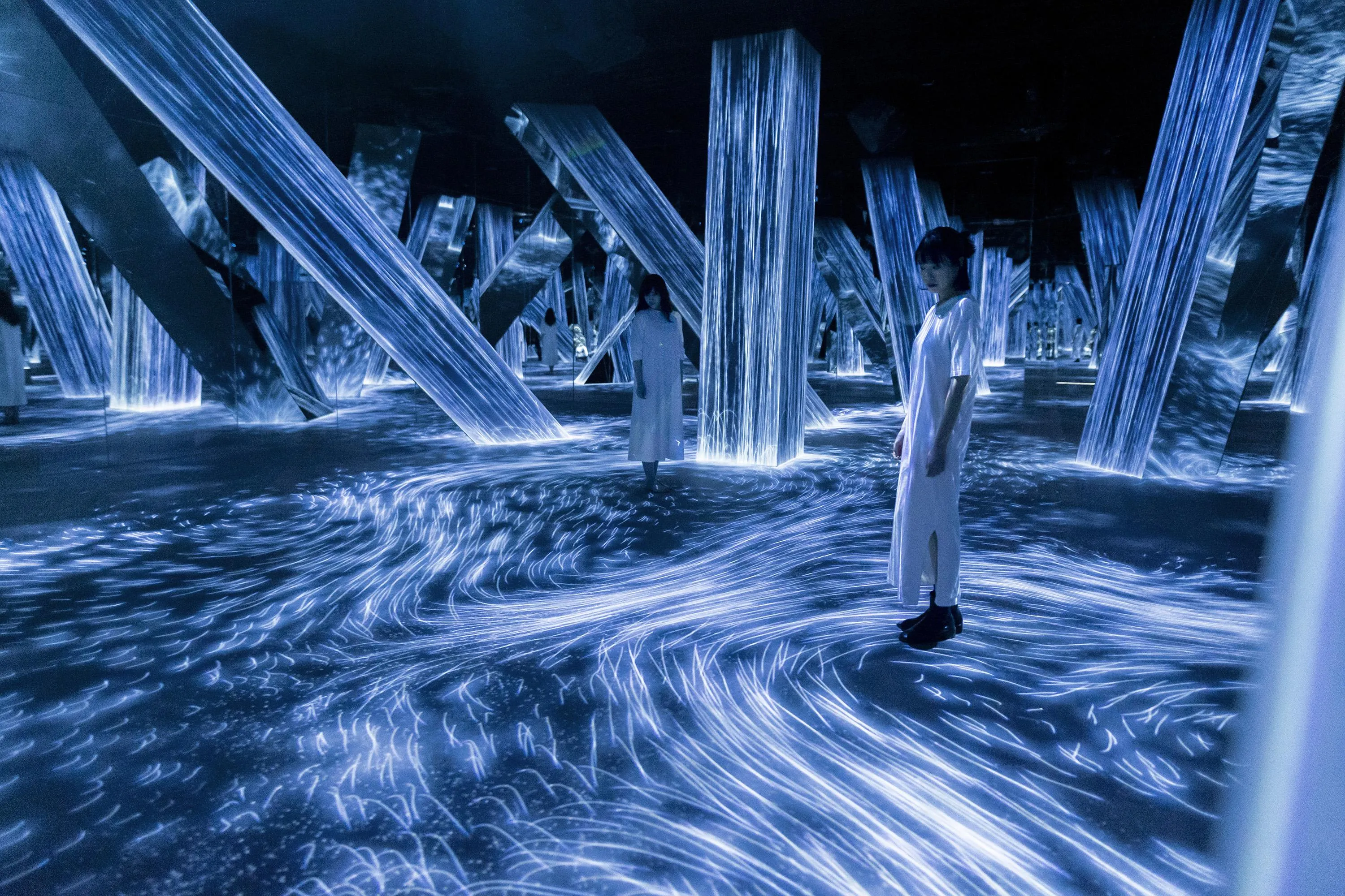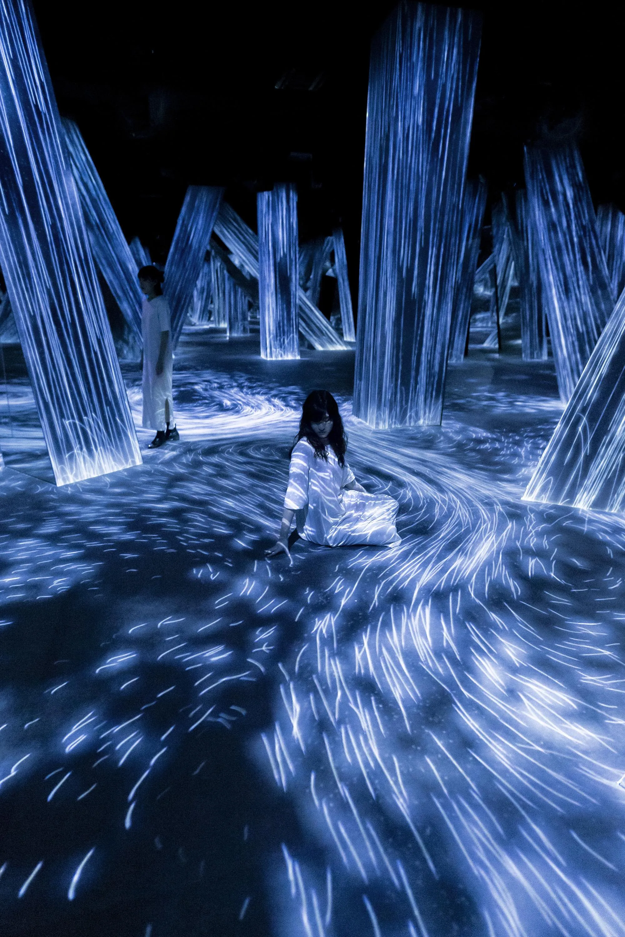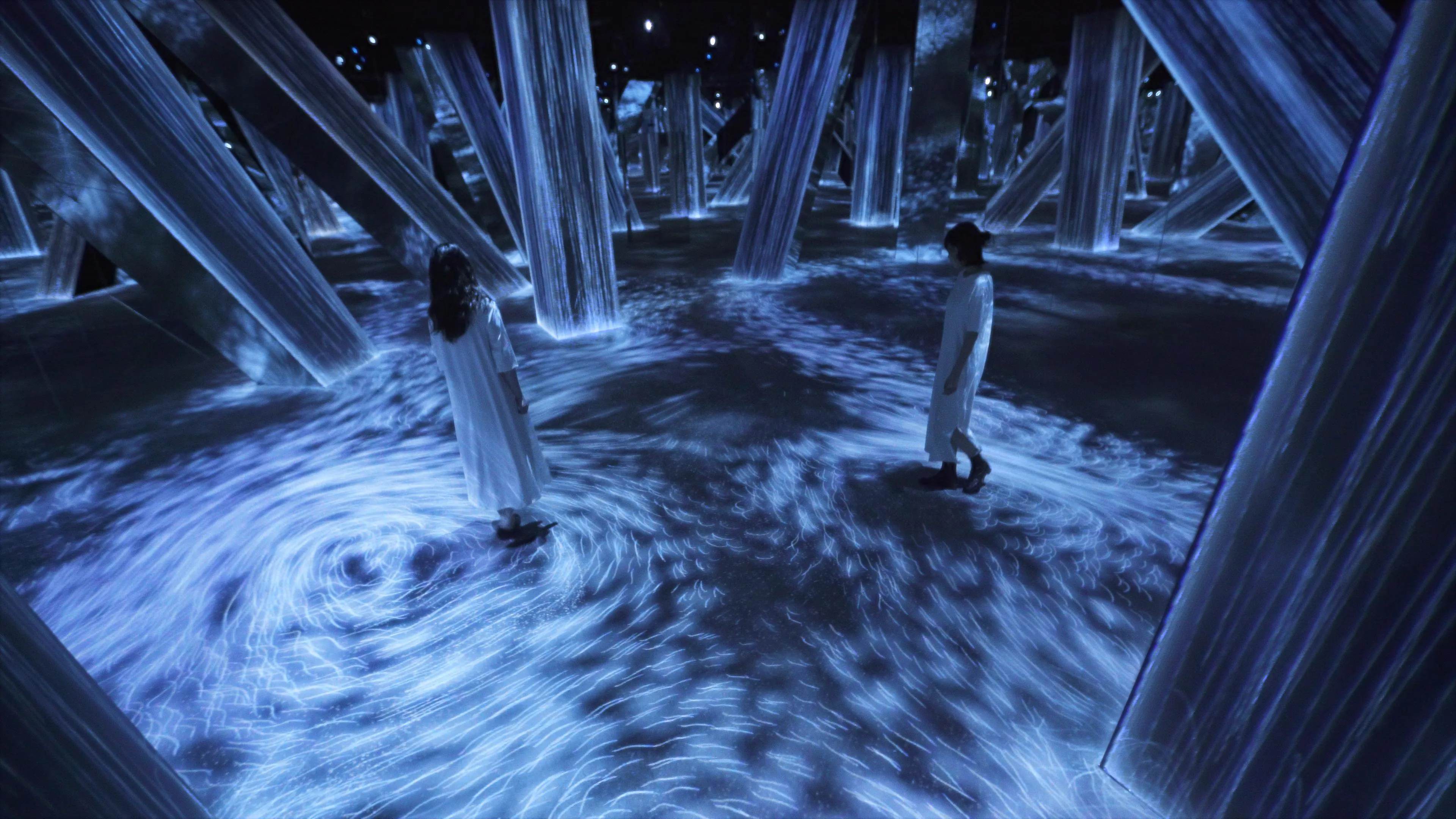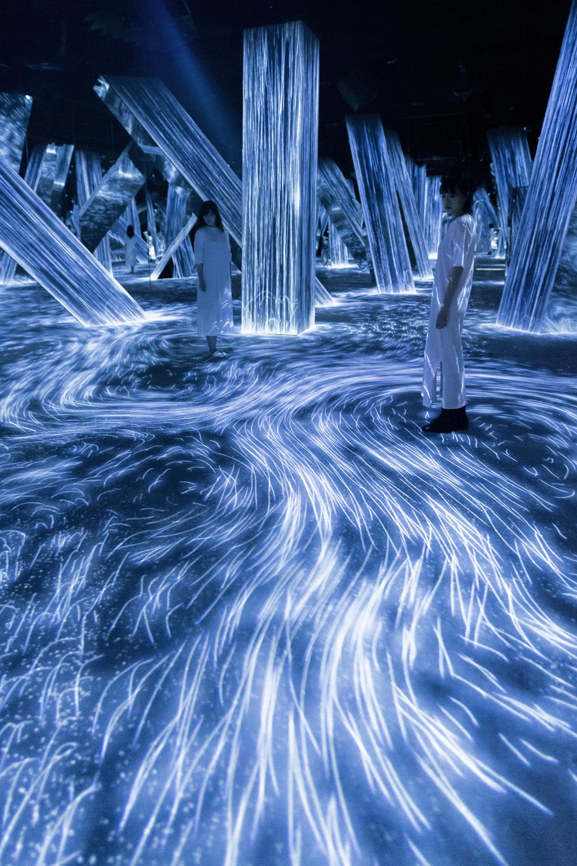 Flow in the artwork is expressed as a continuum of numerous particles, and the interaction between the particles is calculated. Lines are drawn according to the trails of the particles. The cumulation of lines that represent the work are then “flattened” in line with what teamLab considers to be ultrasubjective space.