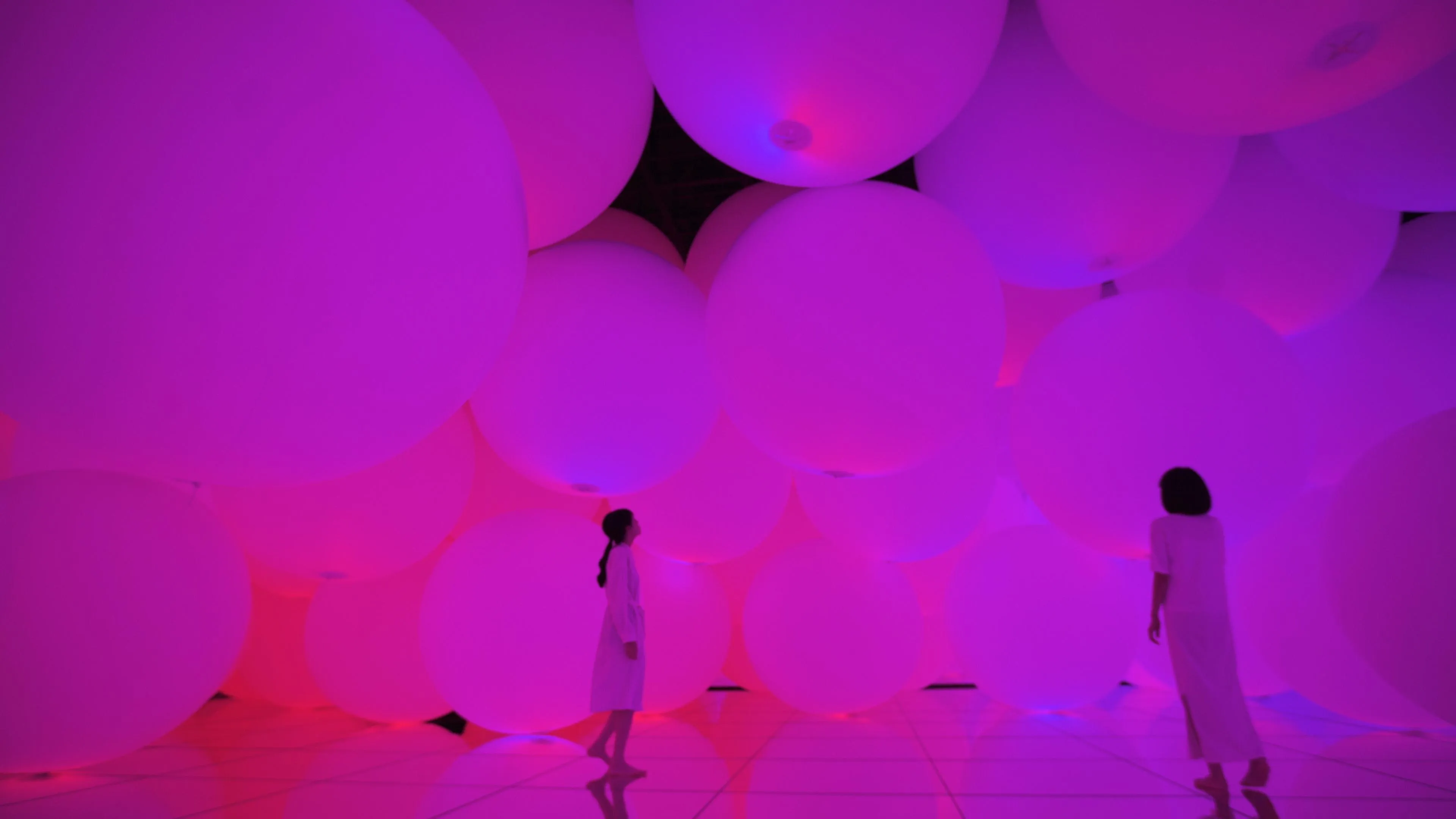 teamLab 正在尝试着刷新色彩的表达方式与概念,以创造出前所未有的全新色彩。 “固化光色”(61种)和“液化光色”(57种),是以全新的色彩表达方式在摸索着前所未有的崭新色彩。 《呼应的小宇宙群 ── 固化光色》,《呼应的小宇宙群 ── 液化光色》 “动的平衡色”,与迄今为止的色彩概念不同,当你凝视时,色彩会持续变化并跃动,但当你从远处望时,色彩却完全不发生变化。也就是说,从最微处来看,色彩就会有时间的概念,从整体来看时,色彩就不再有时间的概念。 《共鸣的茶──動的平衡色》 “平面化的色彩”,是指将艺术品或空间的立体感消除,使艺术品或空间平面化。立体的空间变成了色彩的平面,而后将身体沉浸于这个色彩的平面当中。 《拥有自我意识的变化空间,扩张的立体存在 ── 被平面化的3种颜色与暧昧的9种色彩》,《自由飘浮,悬浮──被平面化的赤与青,与暧昧的紫