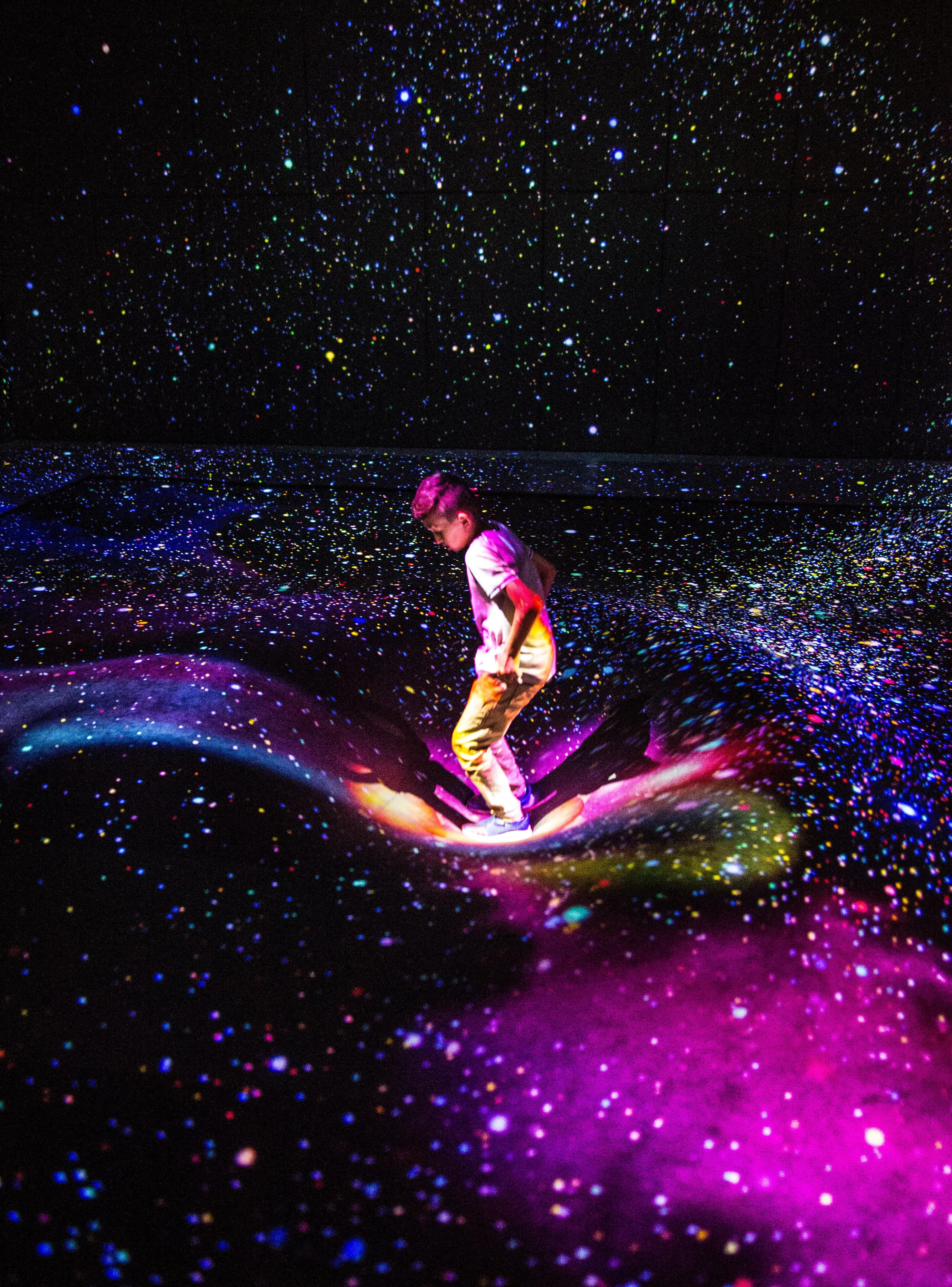 The space is filled with spheres of free floating light. People move through the spheres and enter the space. When people move through or strike them, the spheres change color, and that color resonates out. The spheres around that sphere change color tone and in turn resonate out the color in three-dimensions to nearby spheres.