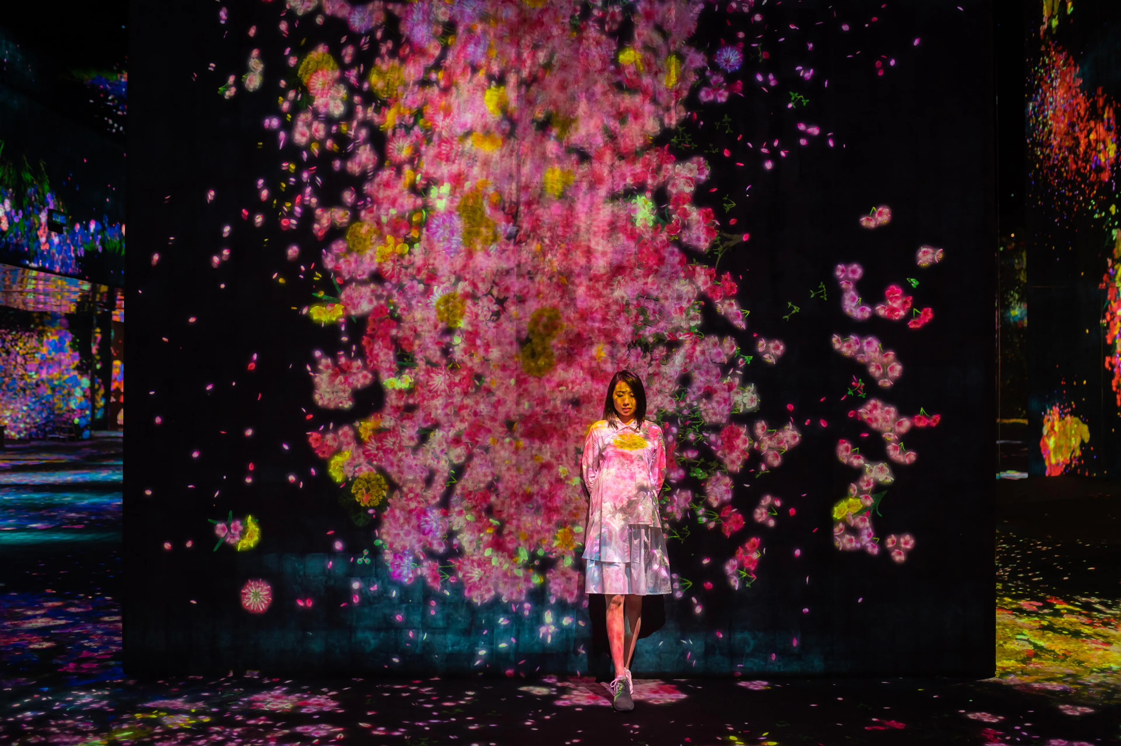 When the spheres change color, the space itself shifts between a collection of spheres forming a three-dimensional space and a flat color wall.