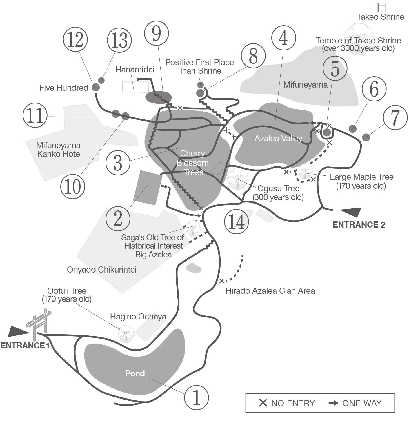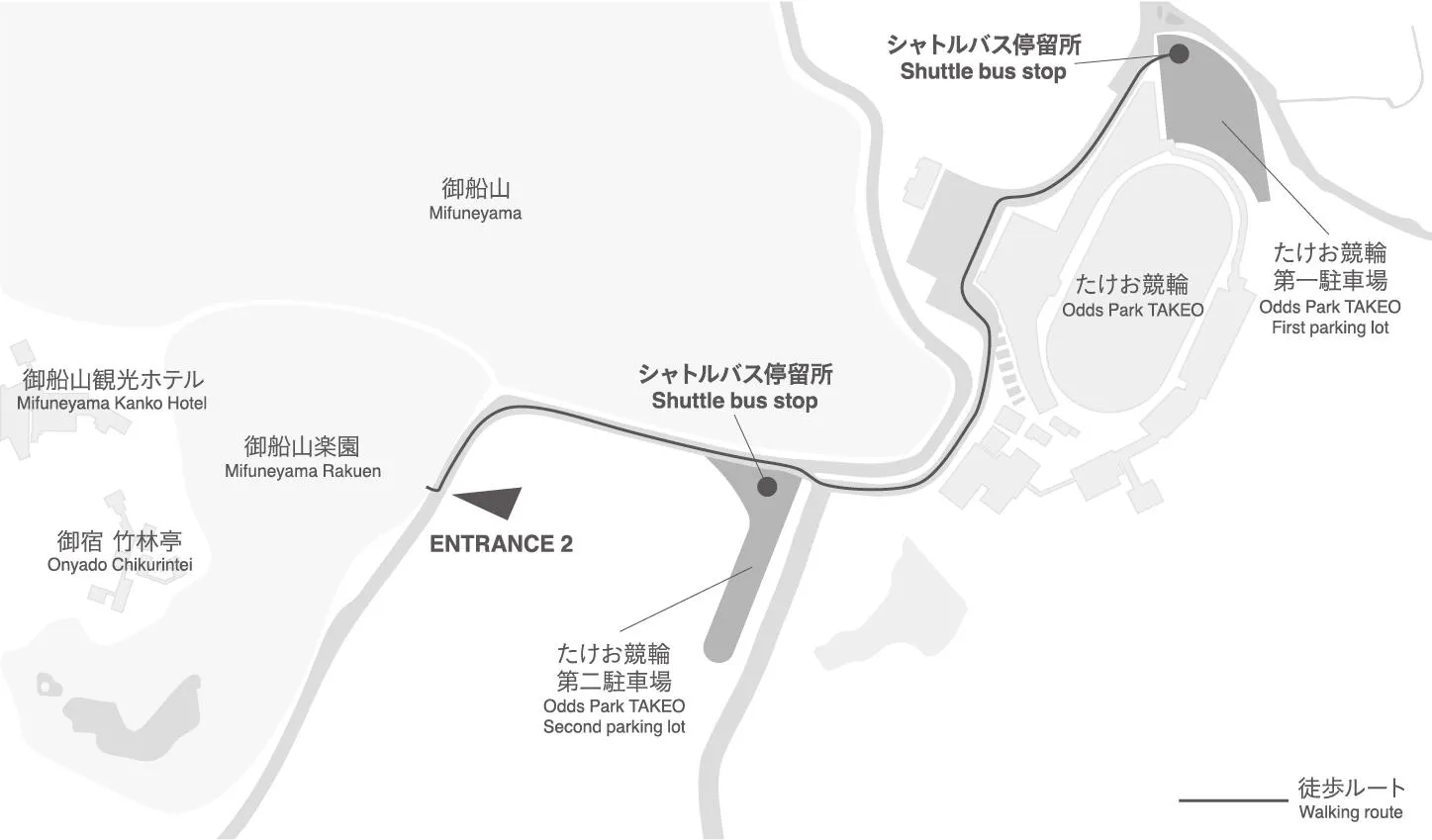 Free shuttle bus available between Takeo Keirin and Mifuneyama Rakuen Park Entrance 1. It will not stop at Mifuneyama Rakuen Park Entrance 2.
