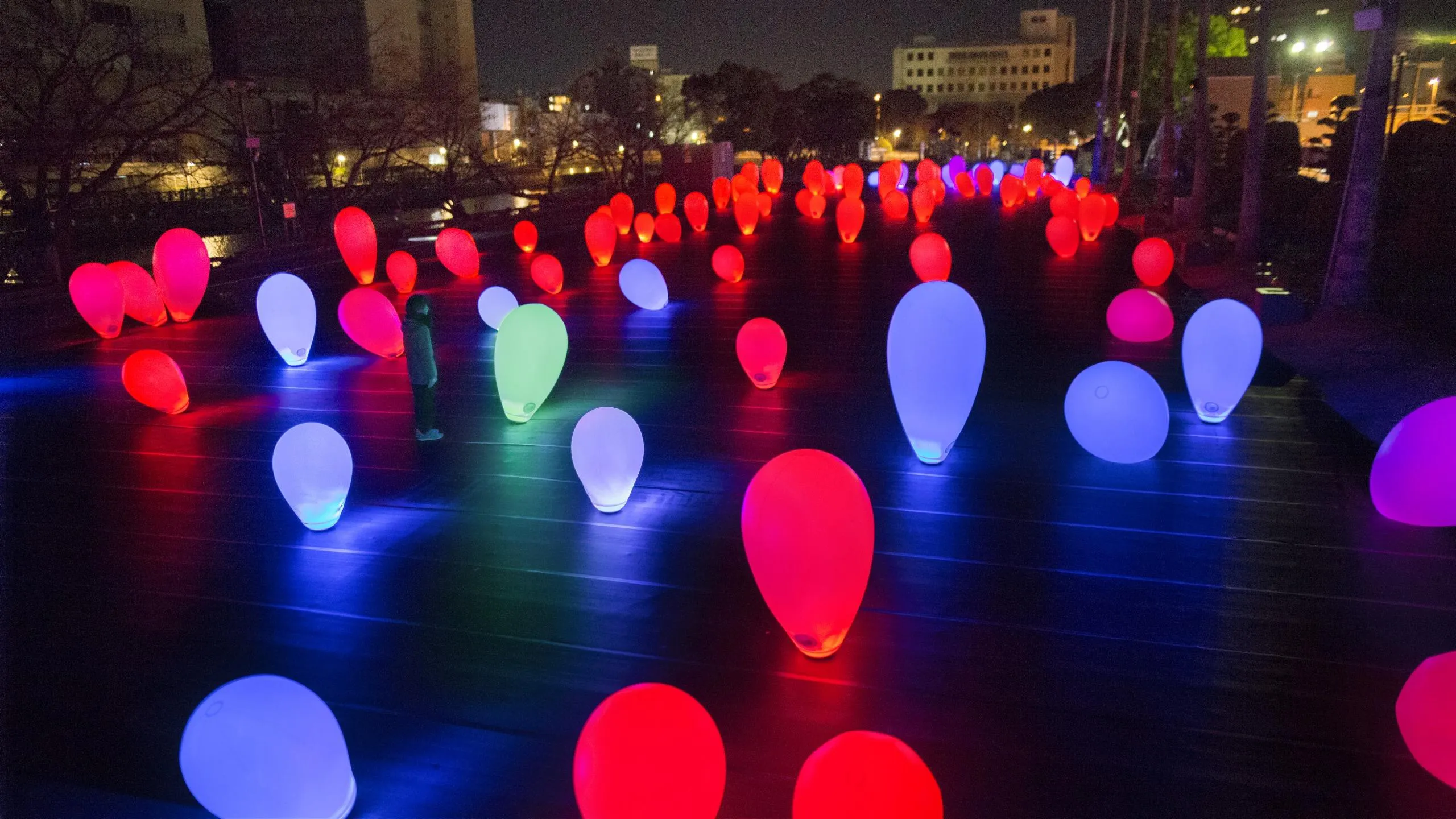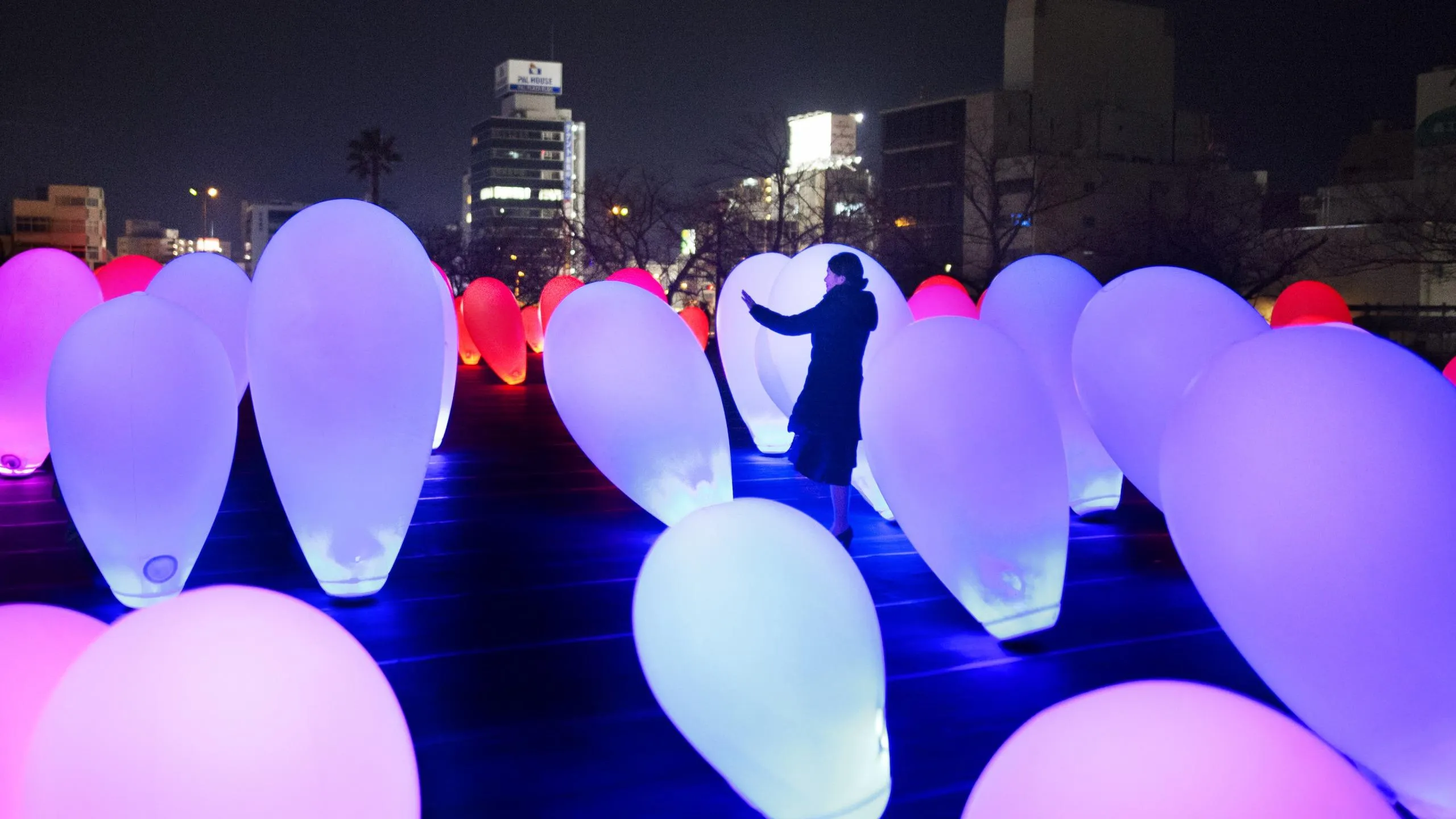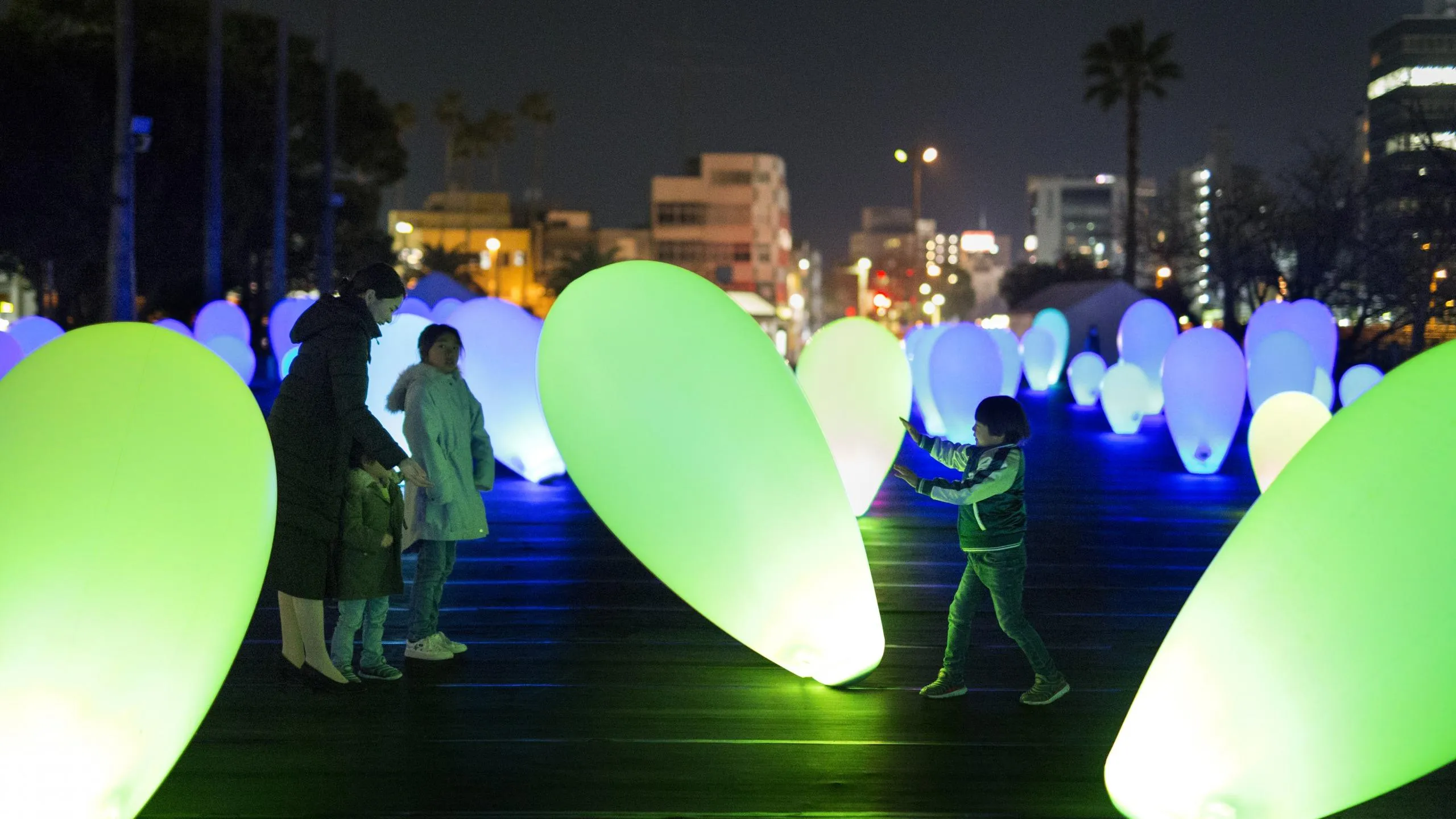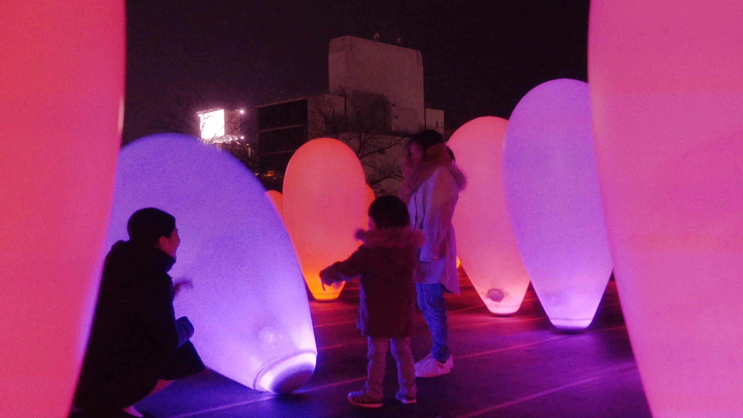 When the objects are pushed by people, the color of their light changes, and they emit a unique sound tone. The color and the sound then resonates out to the objects around them. The resonating light is transmitted to the next object one after another, spreading the color tone in the same way continuously.
