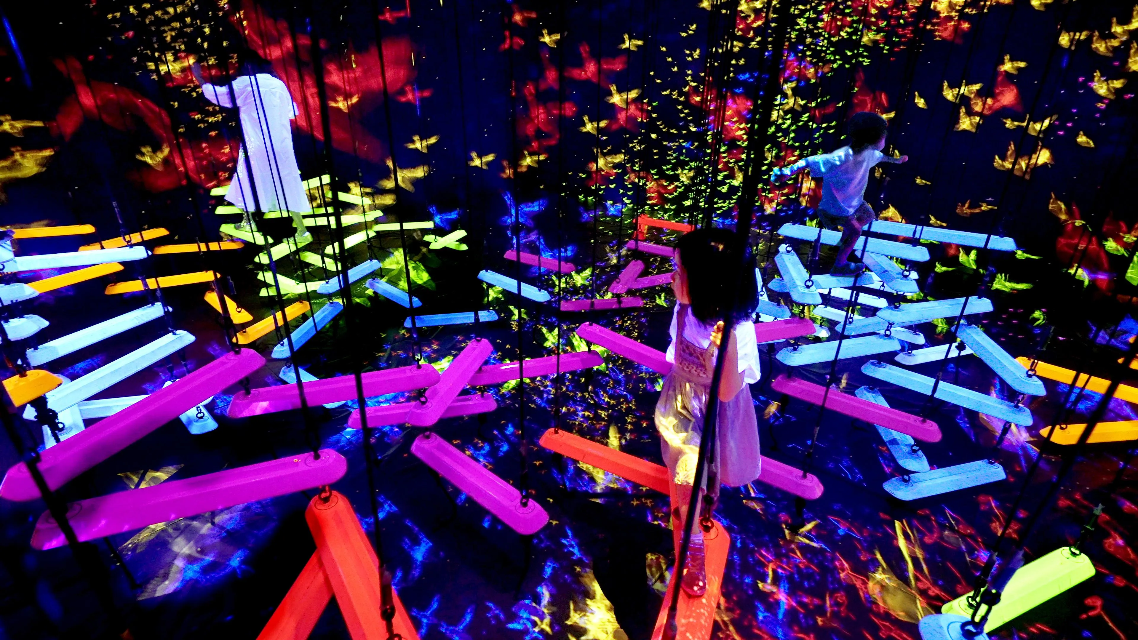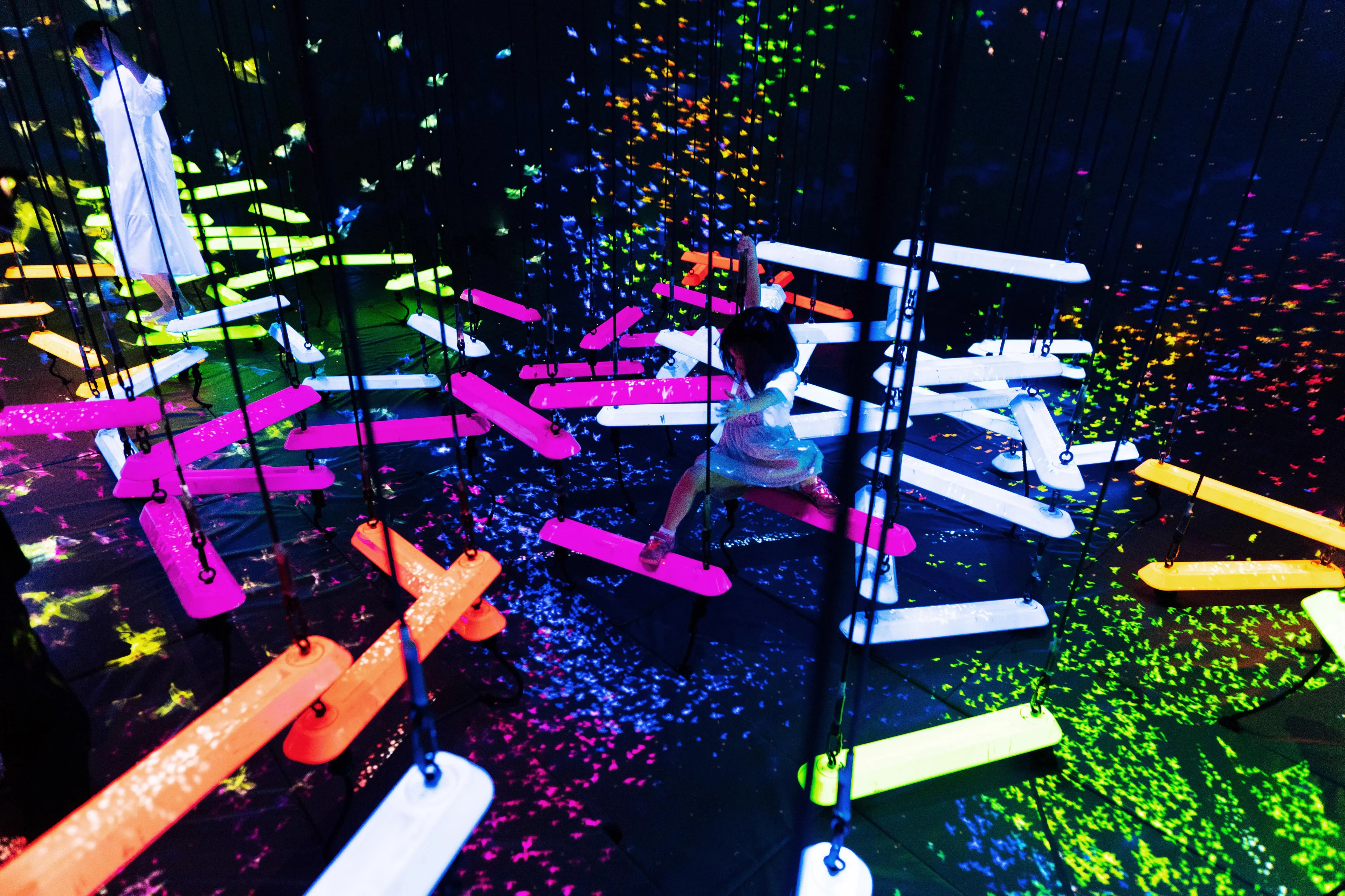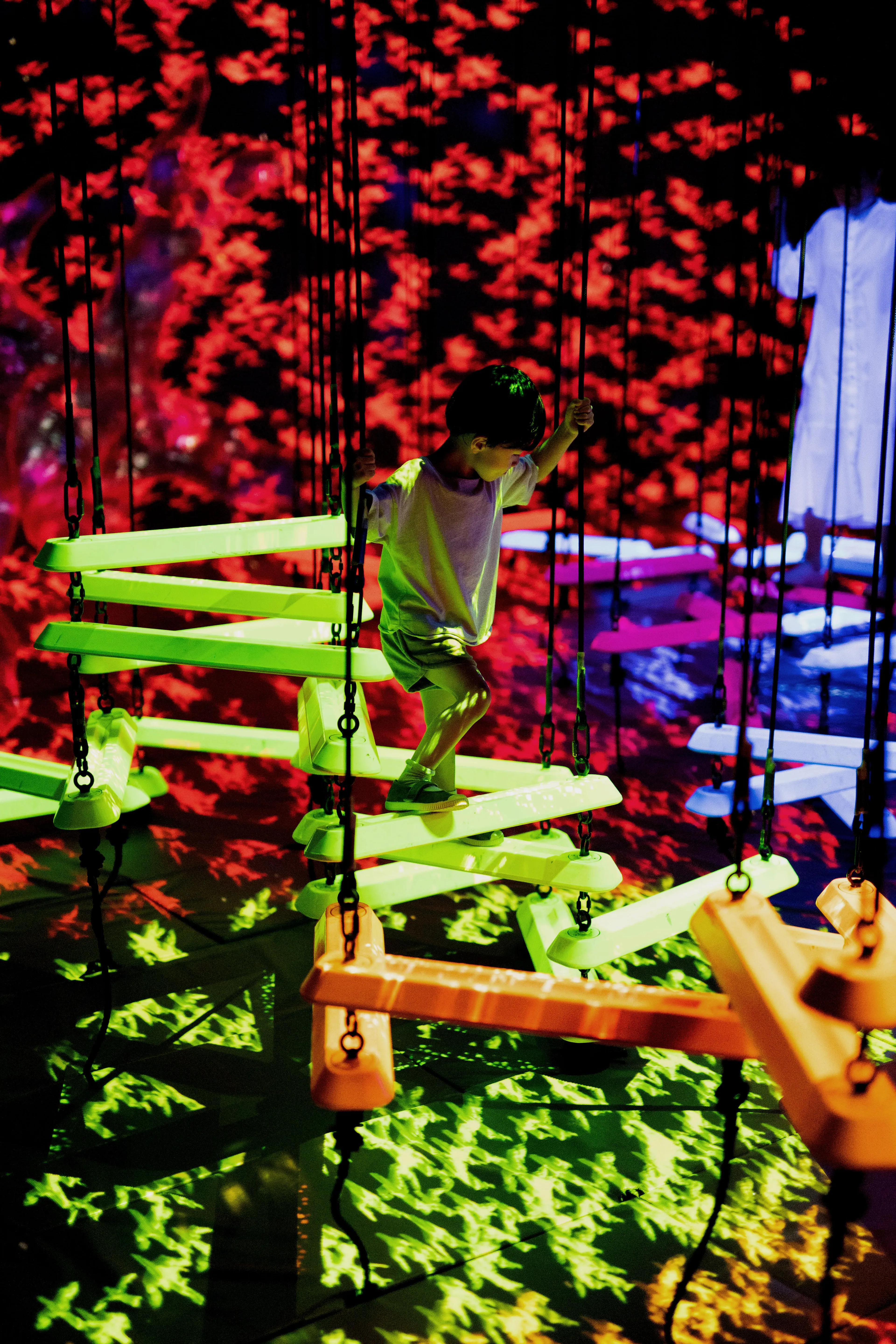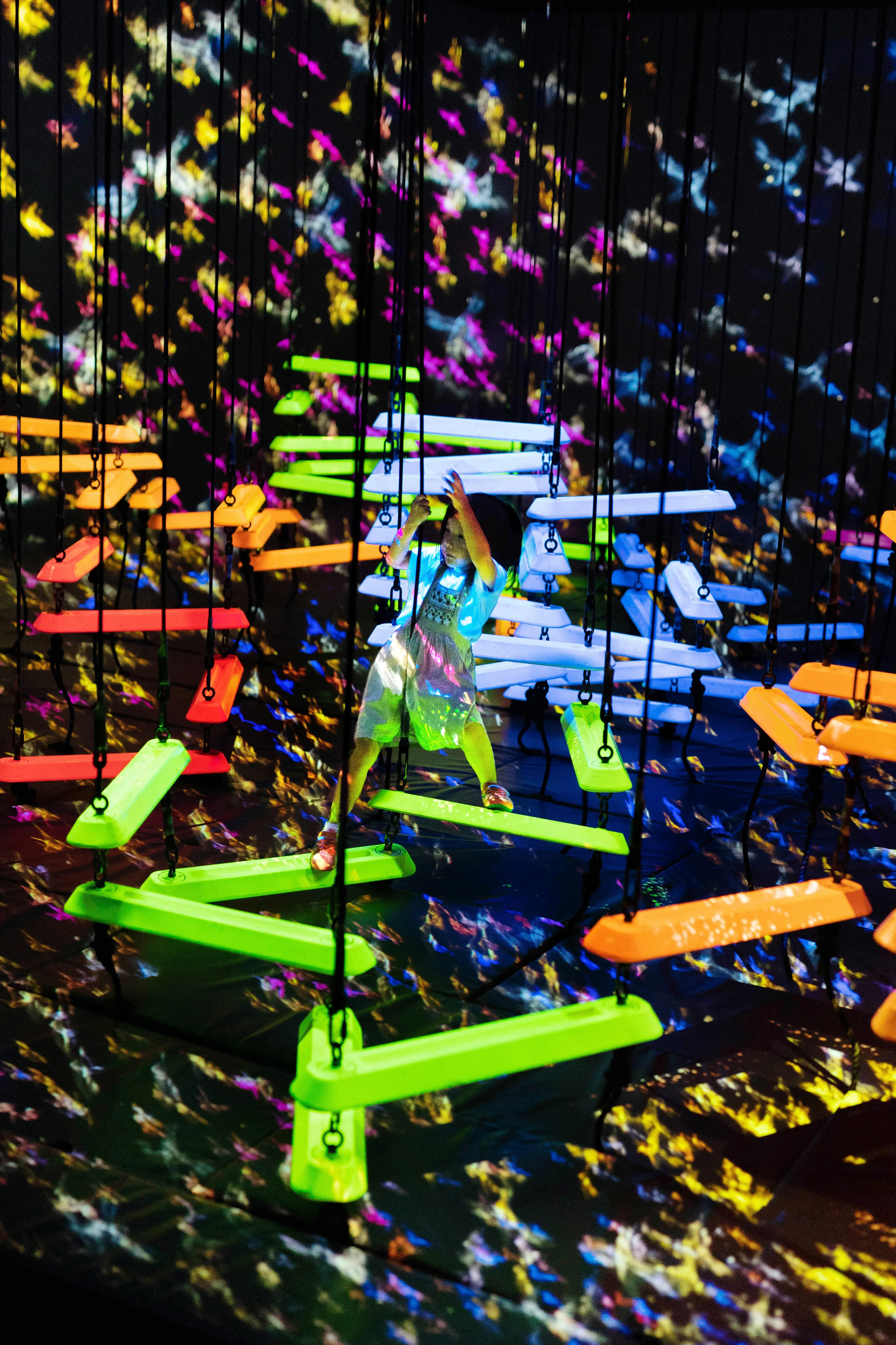 Aerial Climbing is a space where horizontal bars of varying colors are suspended by ropes and float three-dimensionally in the air. People use these bars to navigate the space in mid-air through three dimensions, trying not to fall. As the bars are linked, the movement caused on a bar by a person will affect the bars on which other people are standing. The arrangement of the bars vary depending on the selected route, so people’s experiences will differ depending on the various ways the bars are linked.