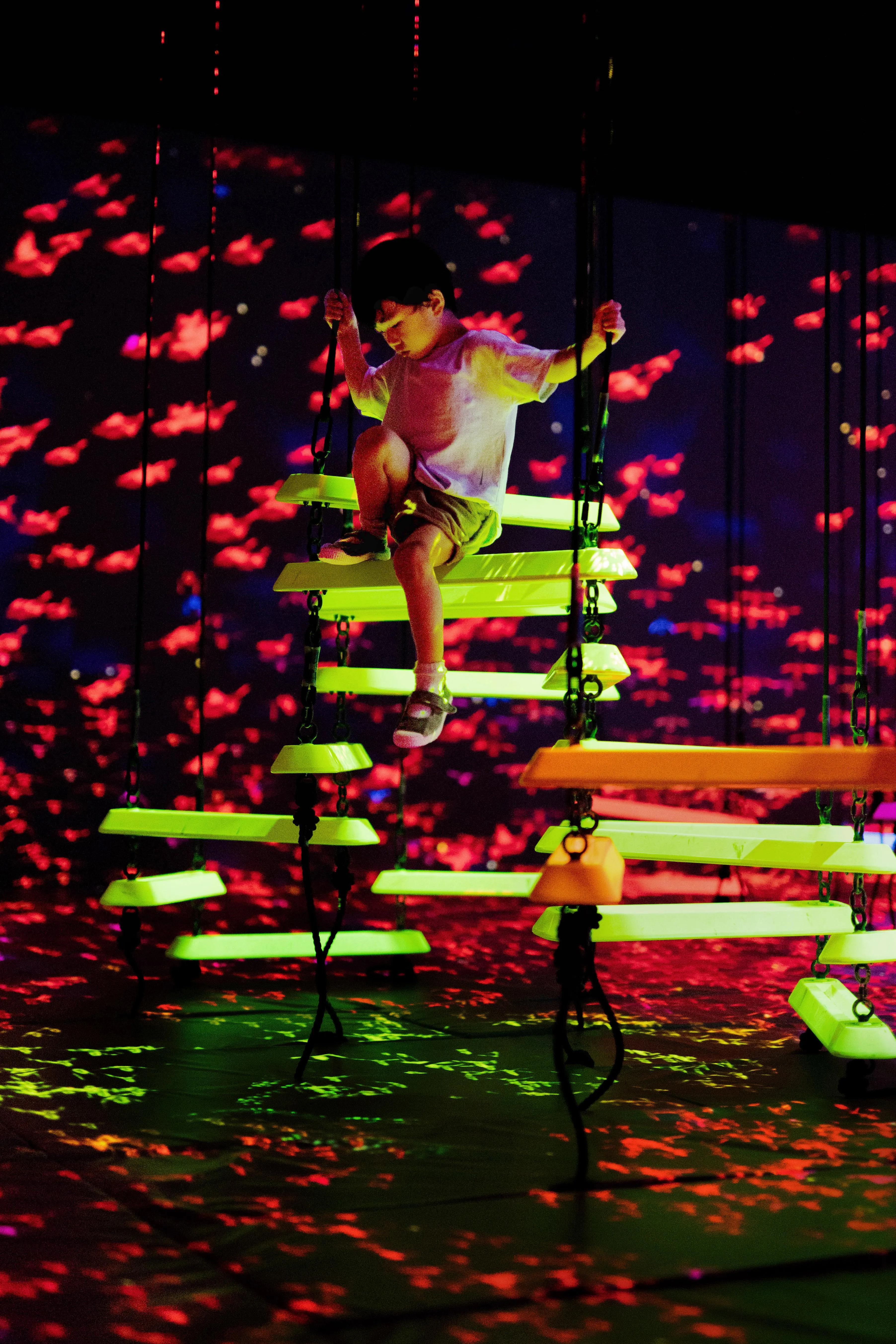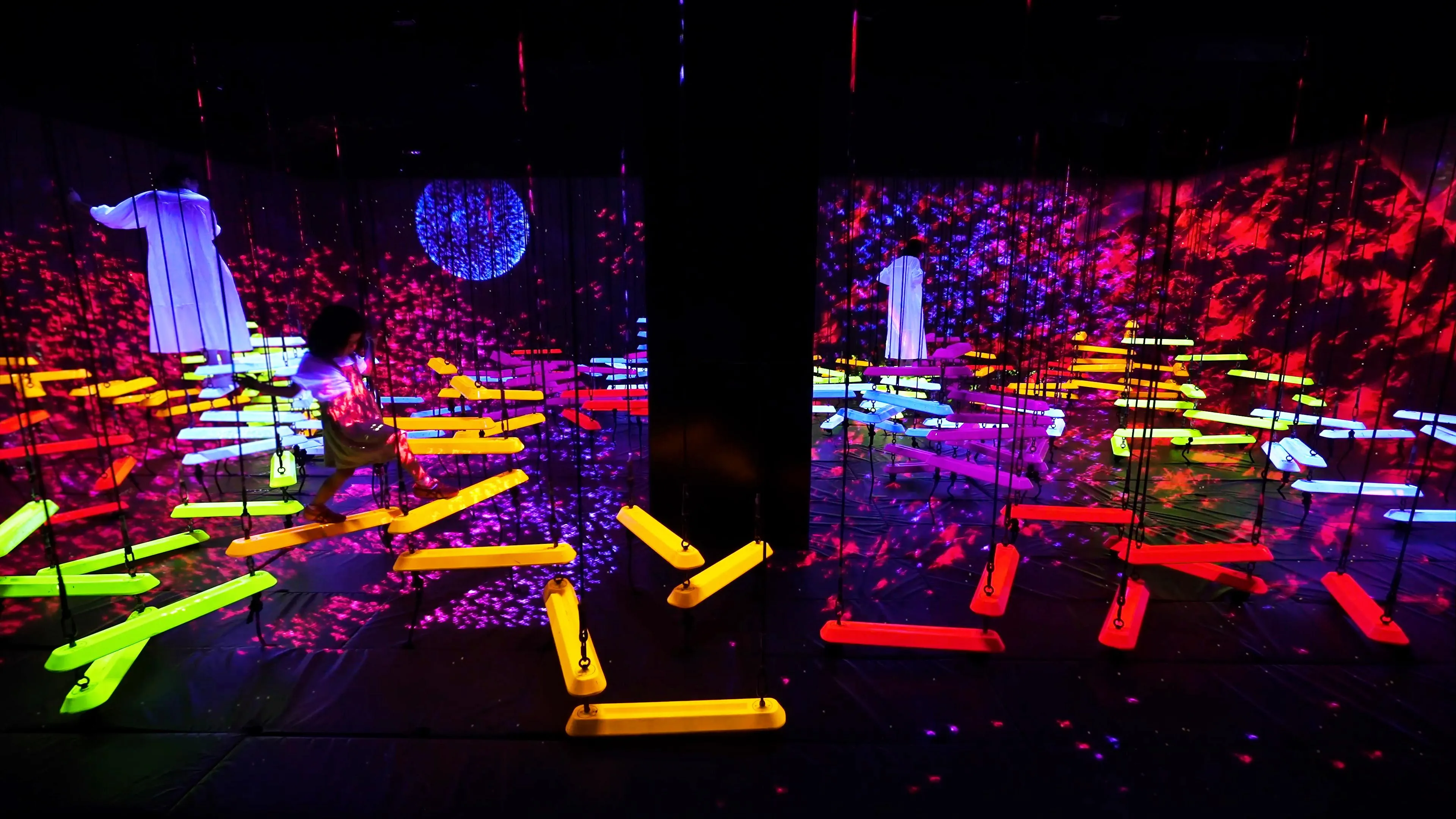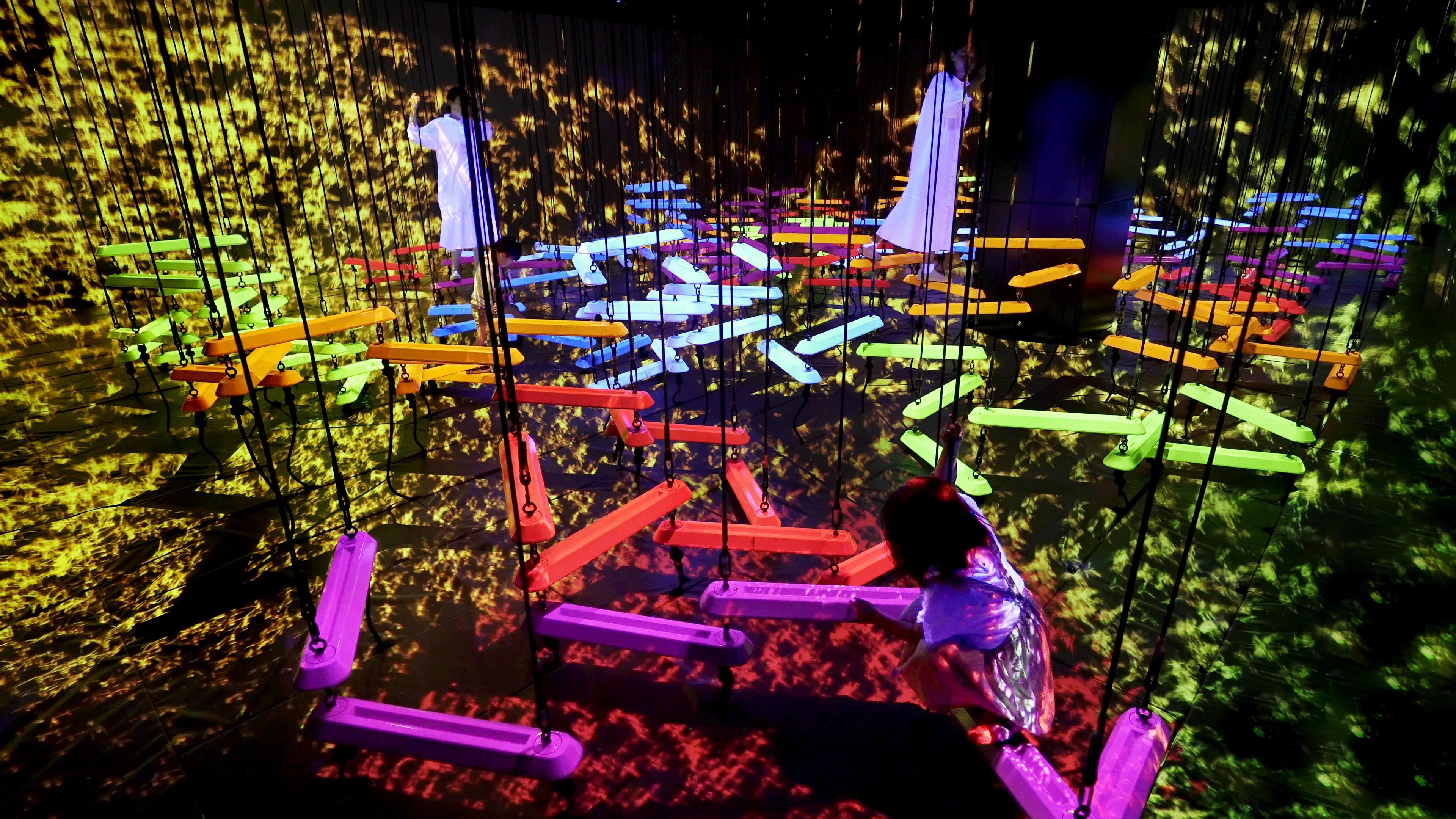 When people climb onto the bars, they shine brightly and produce a sound specific to its color. The more people climb onto bars of different colors, the more sounds will be played at the same time.