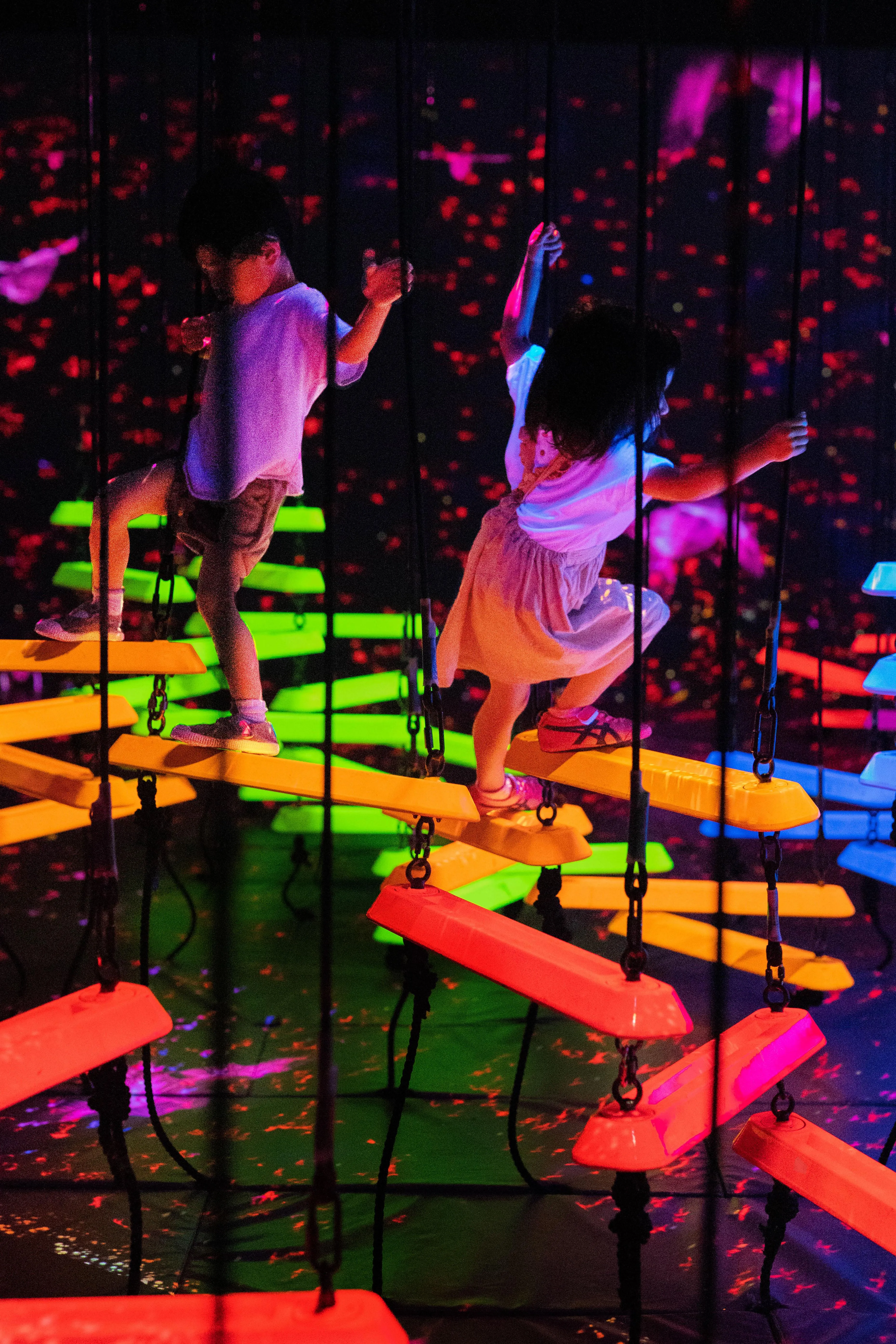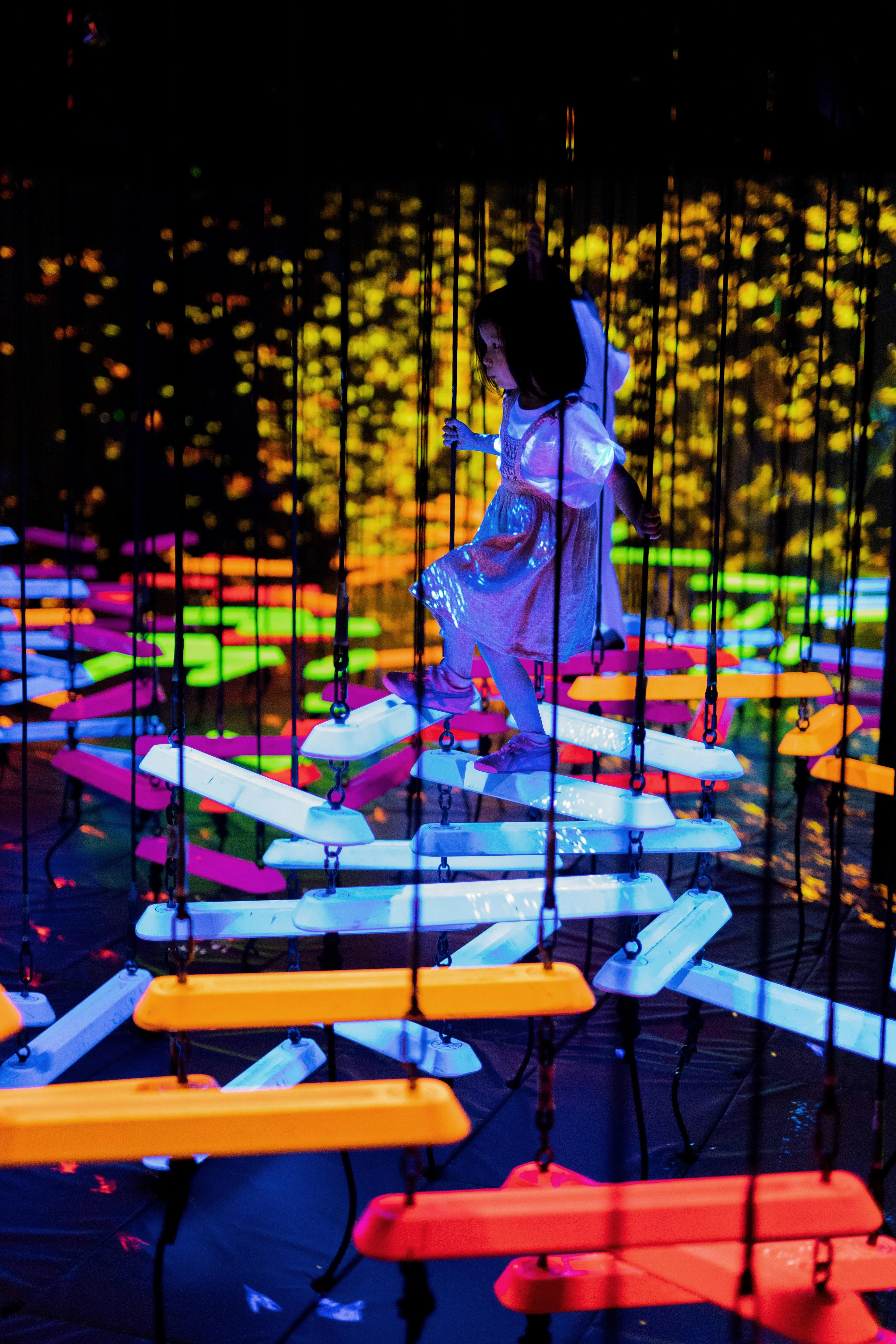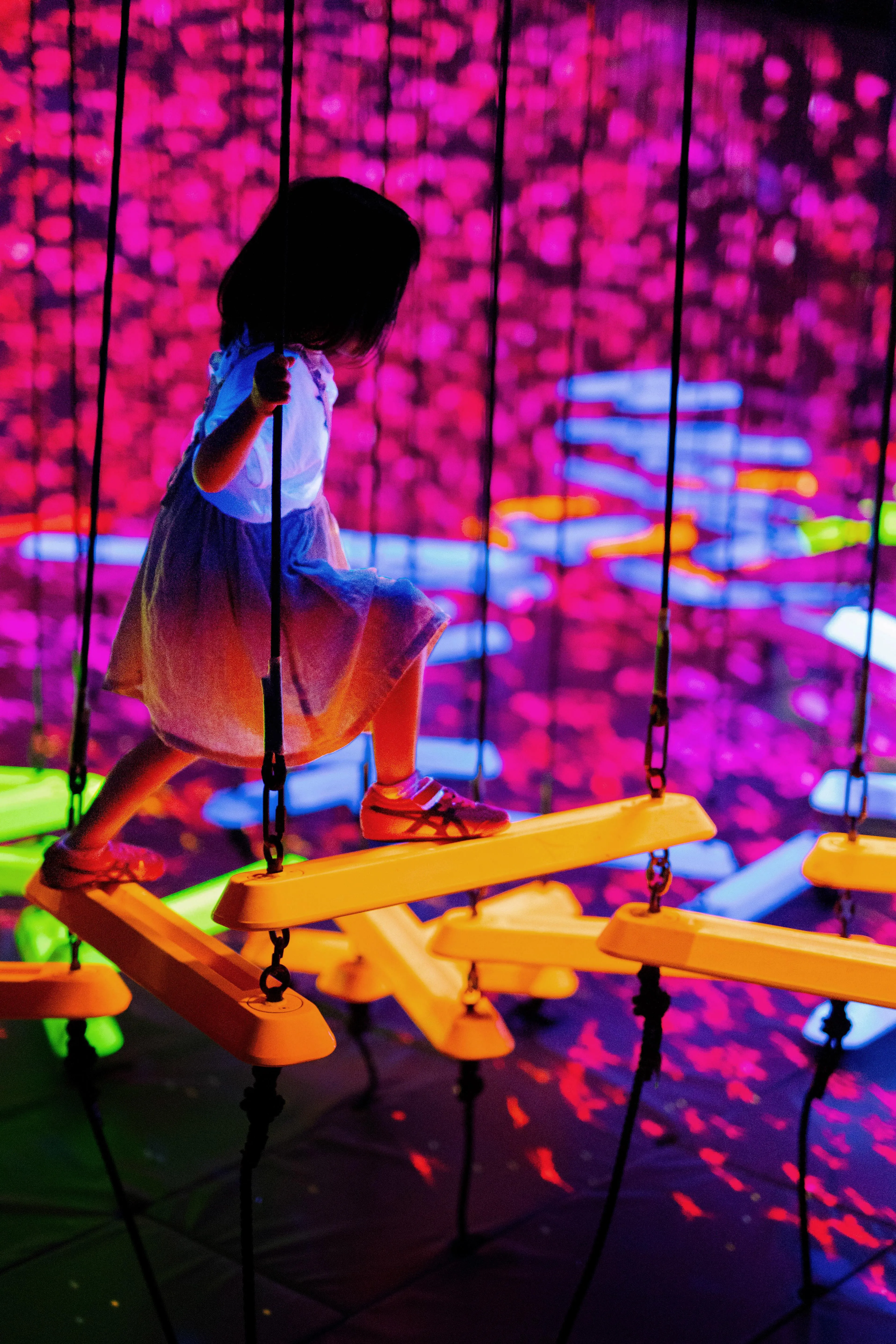 When people climb onto the bars, they shine brightly and produce a sound specific to its color. The more people climb onto bars of different colors, the more sounds will be played at the same time.
