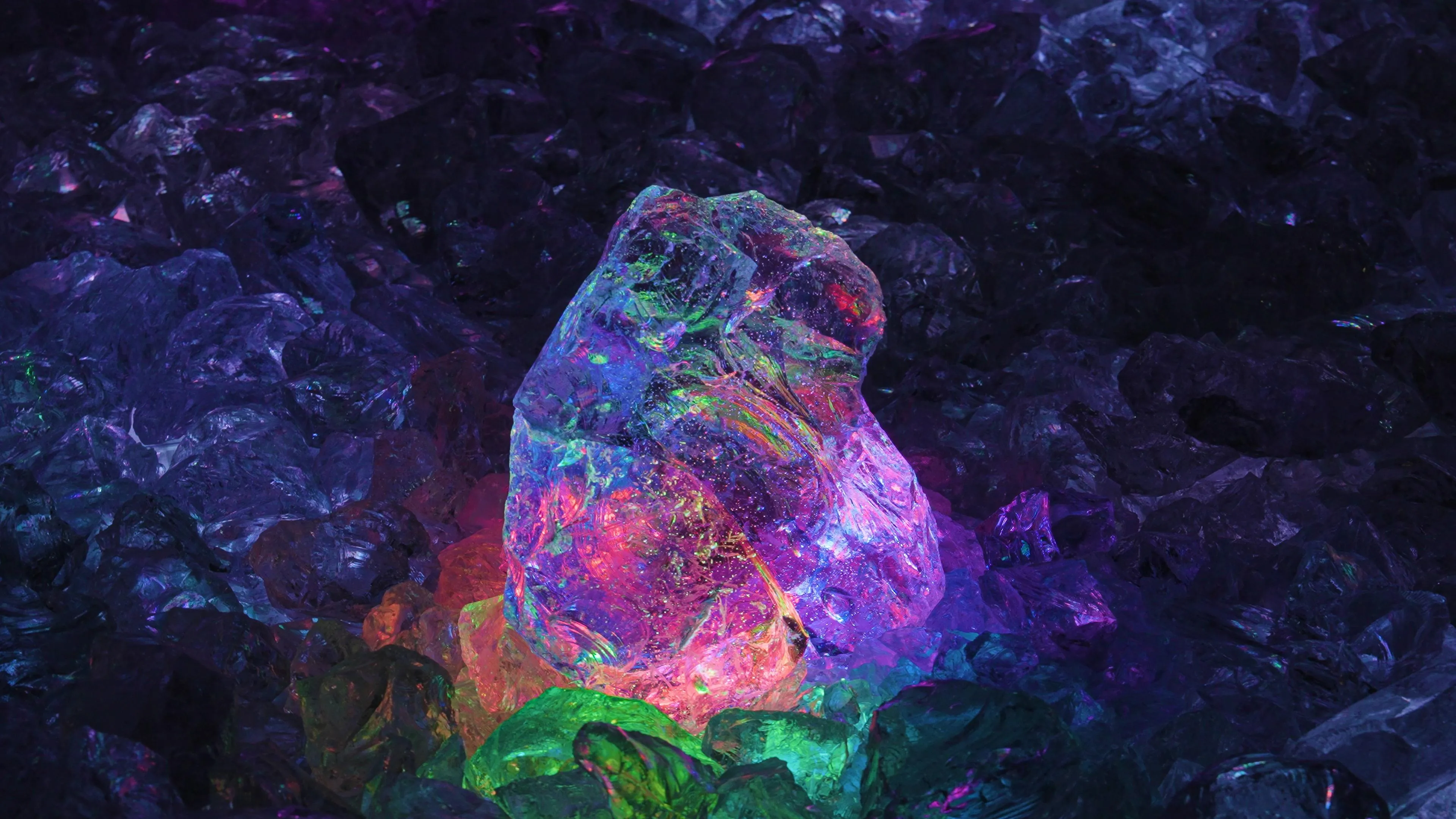 The artwork is created using glass rocks collected from the crushed glass that remains in the melting furnaces of a glass factory.