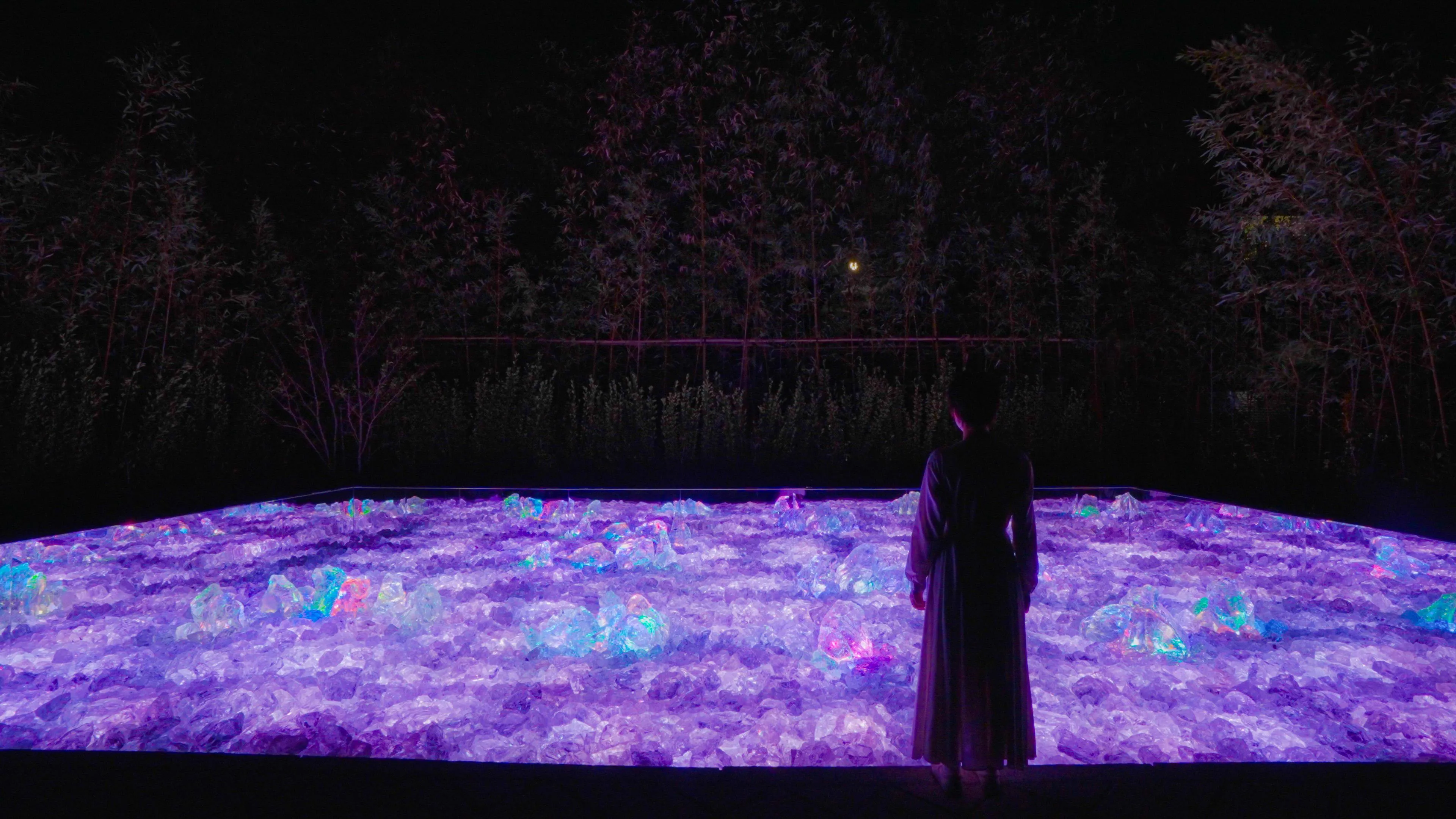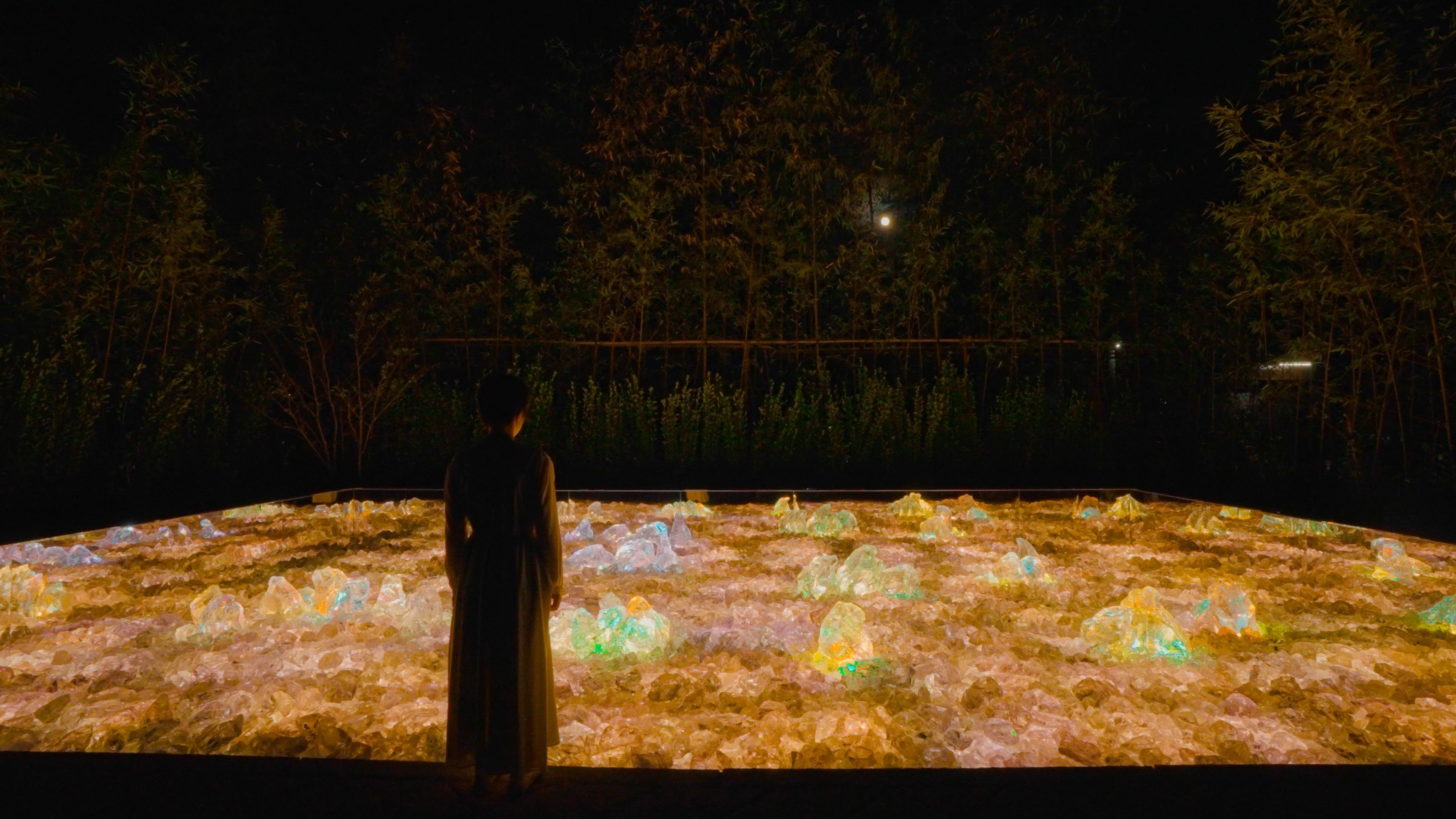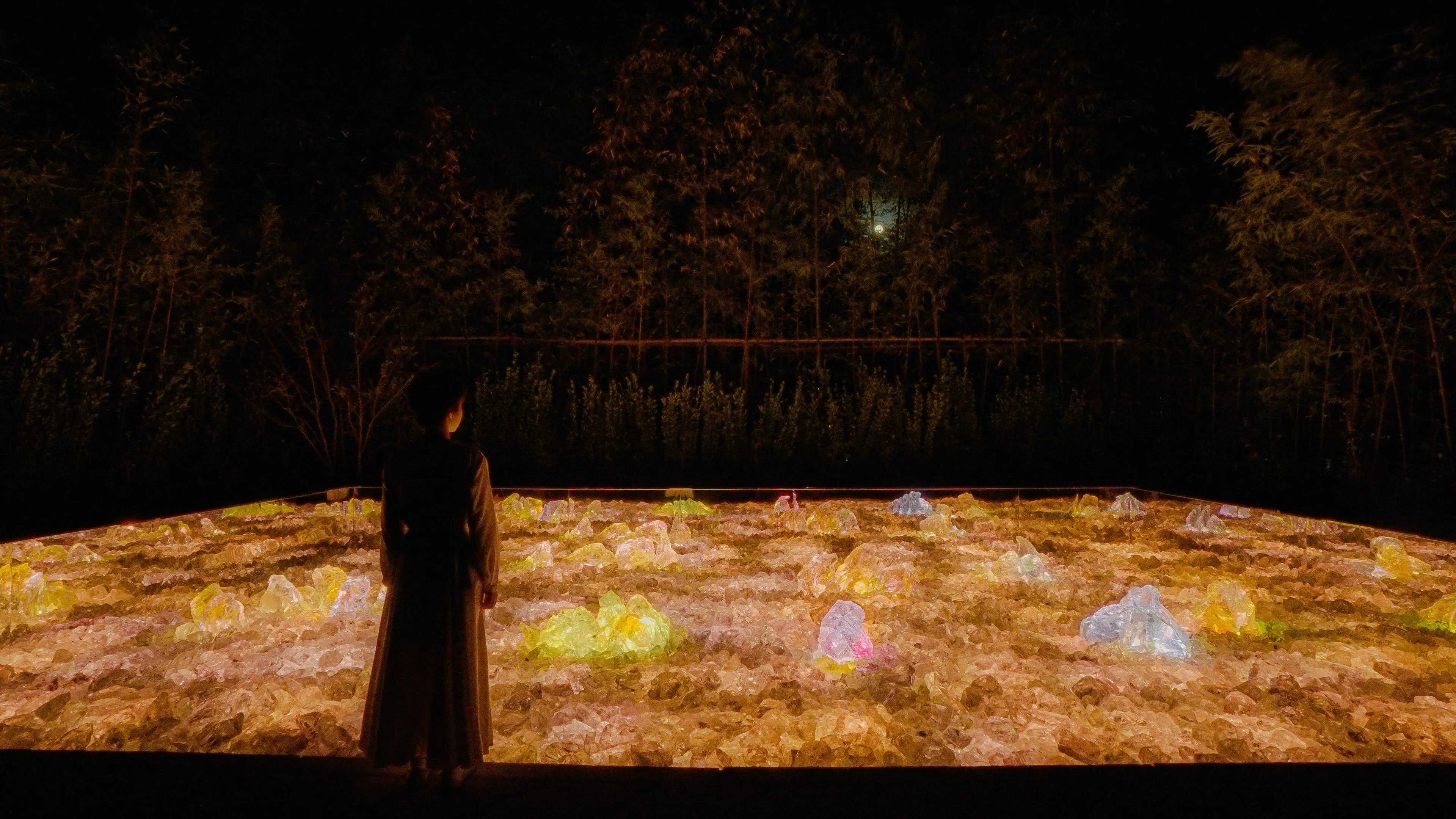 At night, the light inside the rocks solidifies and melts into each other. The garden changes depending on people's actions.