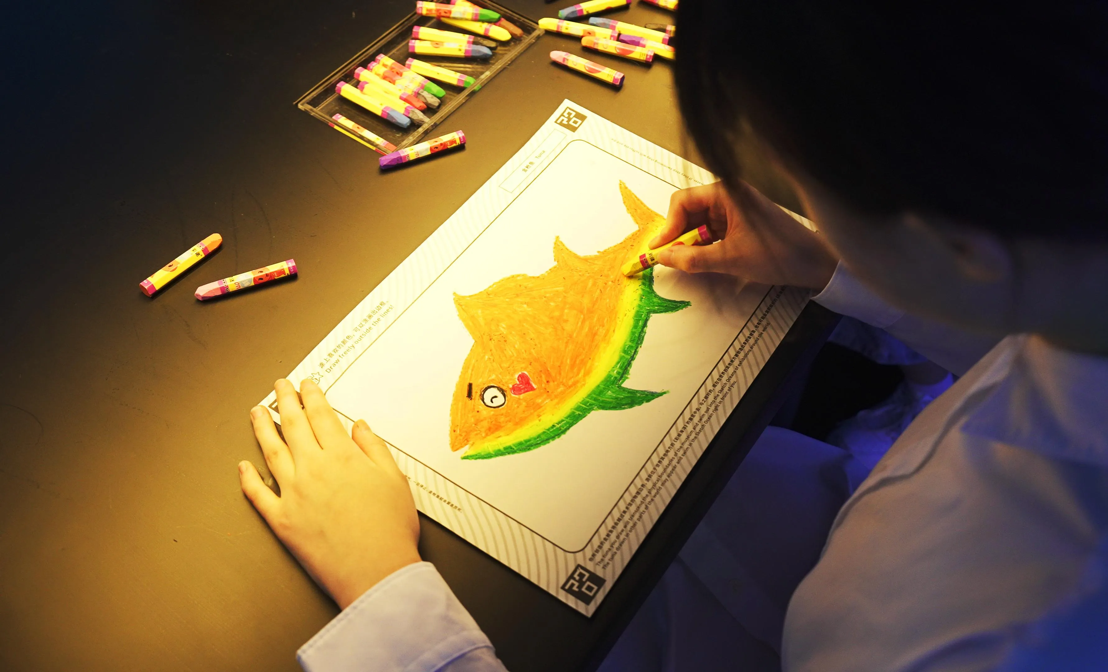 Color in a fish on the paper provided and see the picture you have colored come to life, swimming out into the ocean in front of you together with fish drawn by other people. If you touch the fish, they will swim away. You can also feed the fish by touching the food bags.