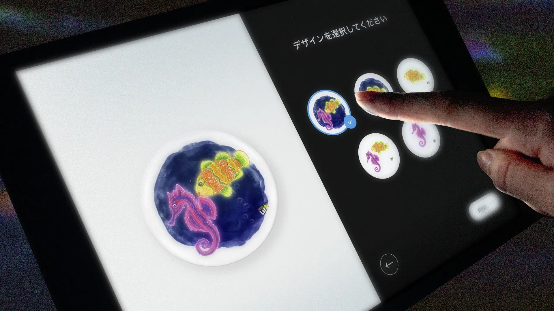 A factory where the fish that you draw can be made into an original item (tin badge, hand towel, T-shirt, tote bag or papercraft) and taken home.