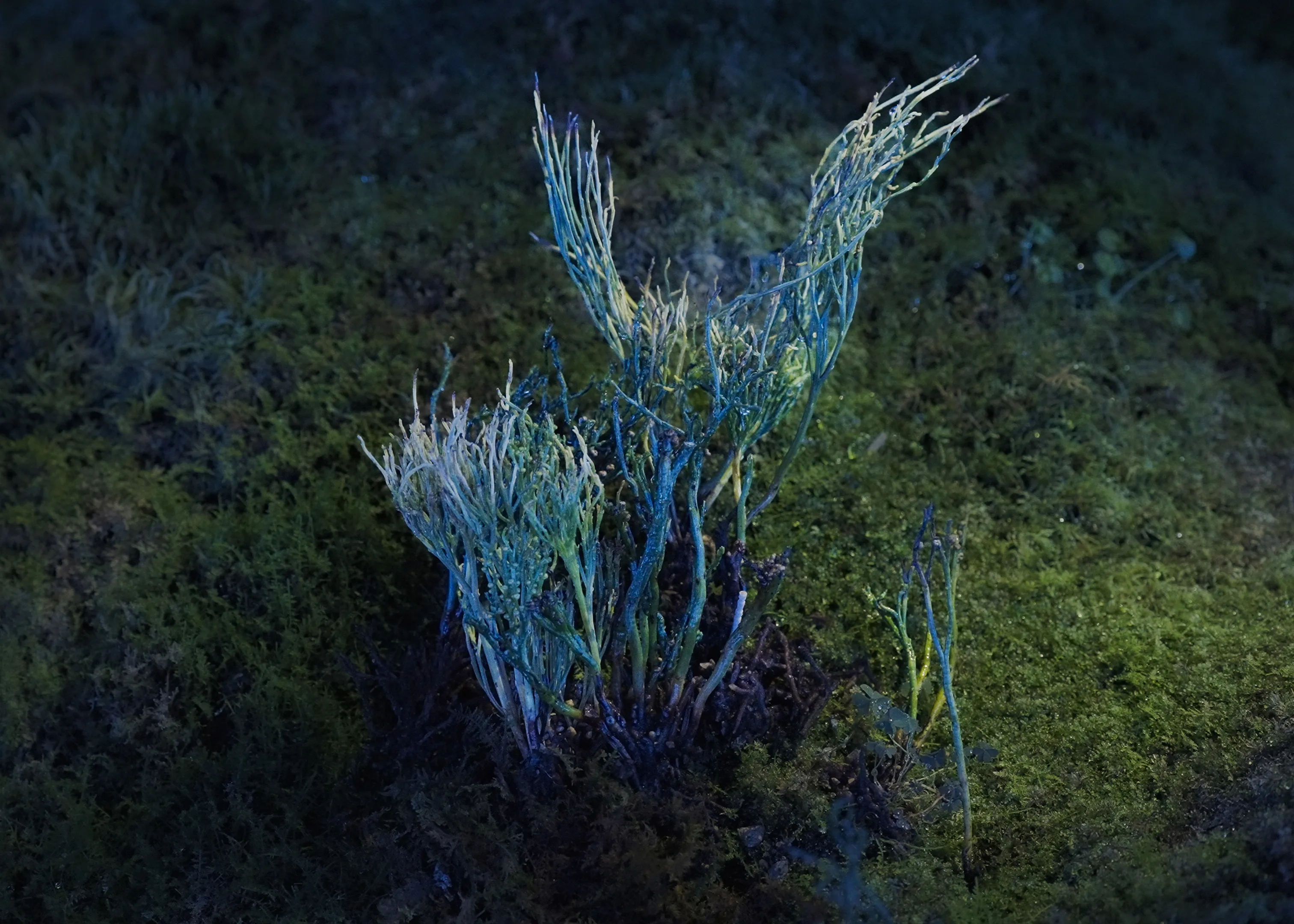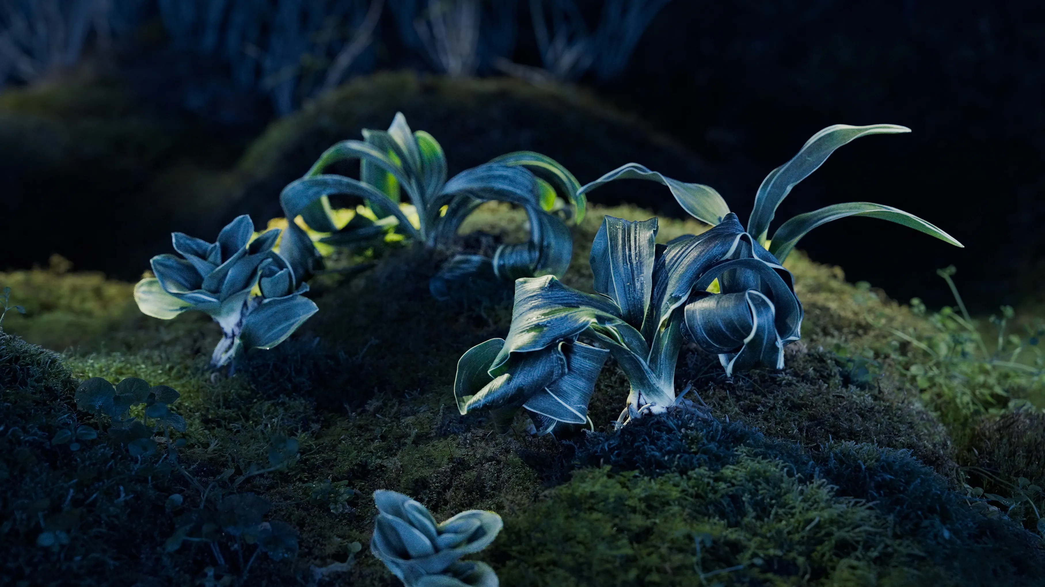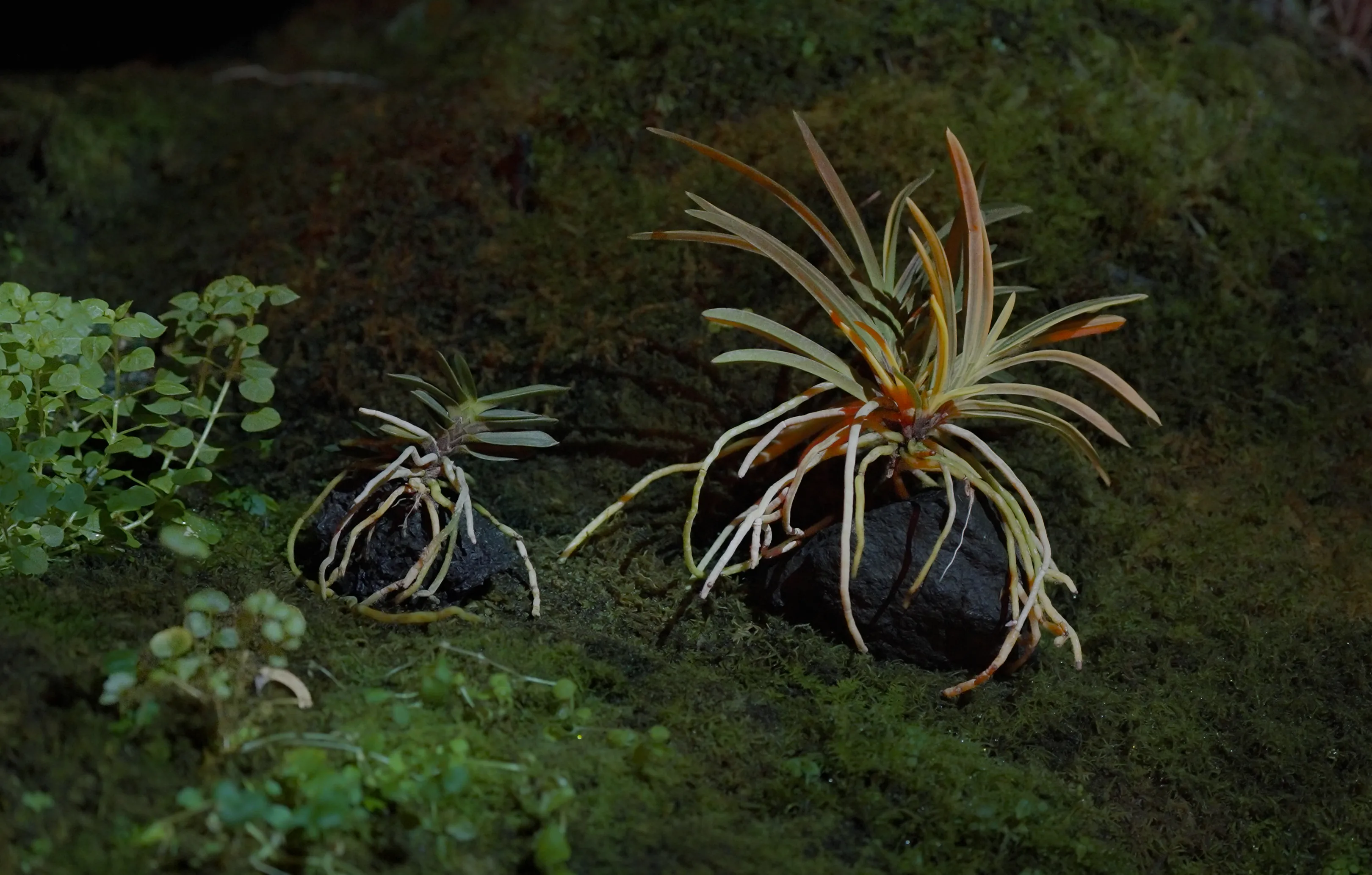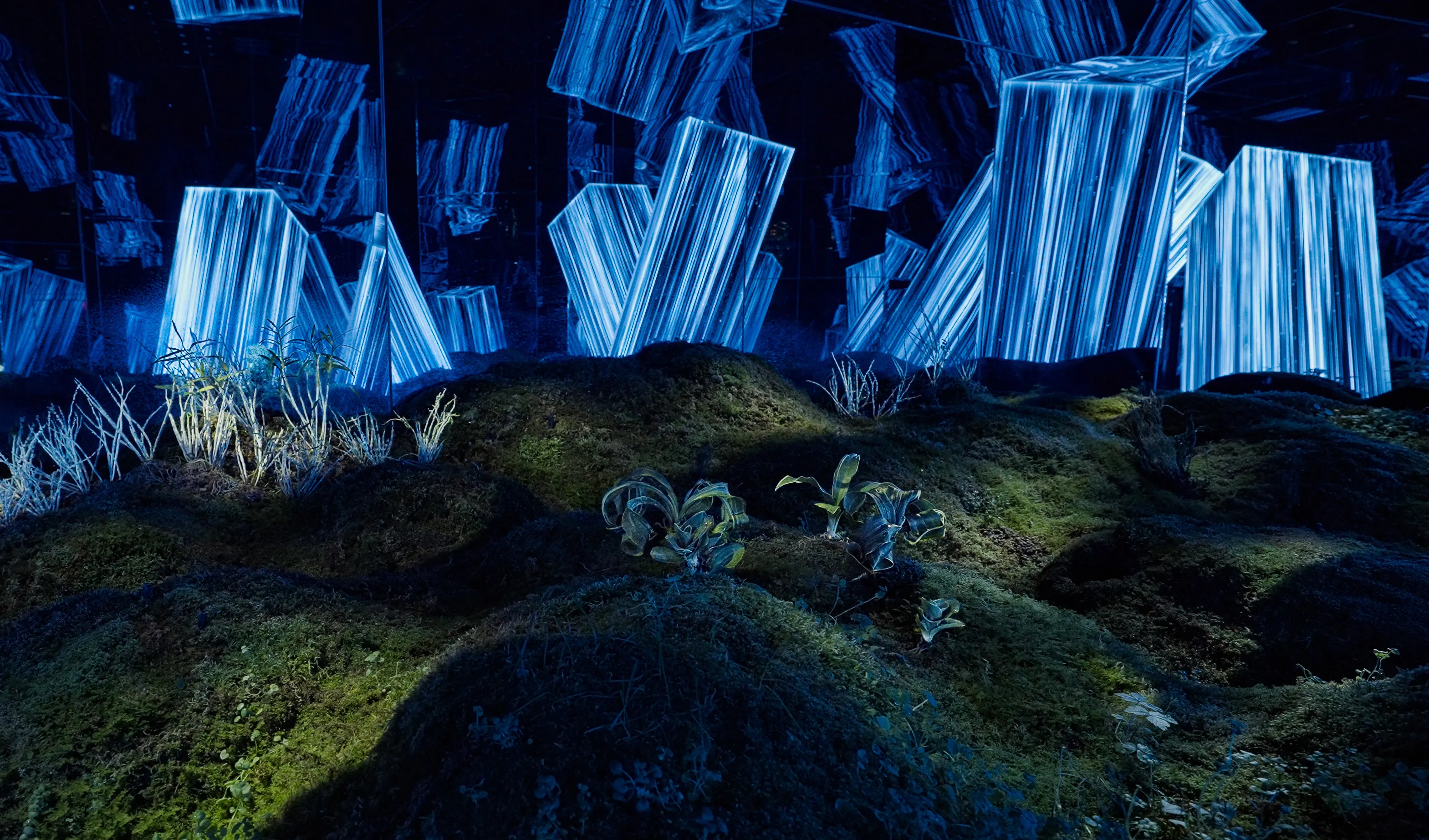 Living moss spreads across this space. The moss mountains shine brightly in response to the diurnal motion of the sun, and at times, Ephemeral Crystallized Rain pours down. The moss mountains are dotted with classical horticultural plants such as Rohdea Japonica, Dendrobium, Whisk Fern, and Spikemoss.