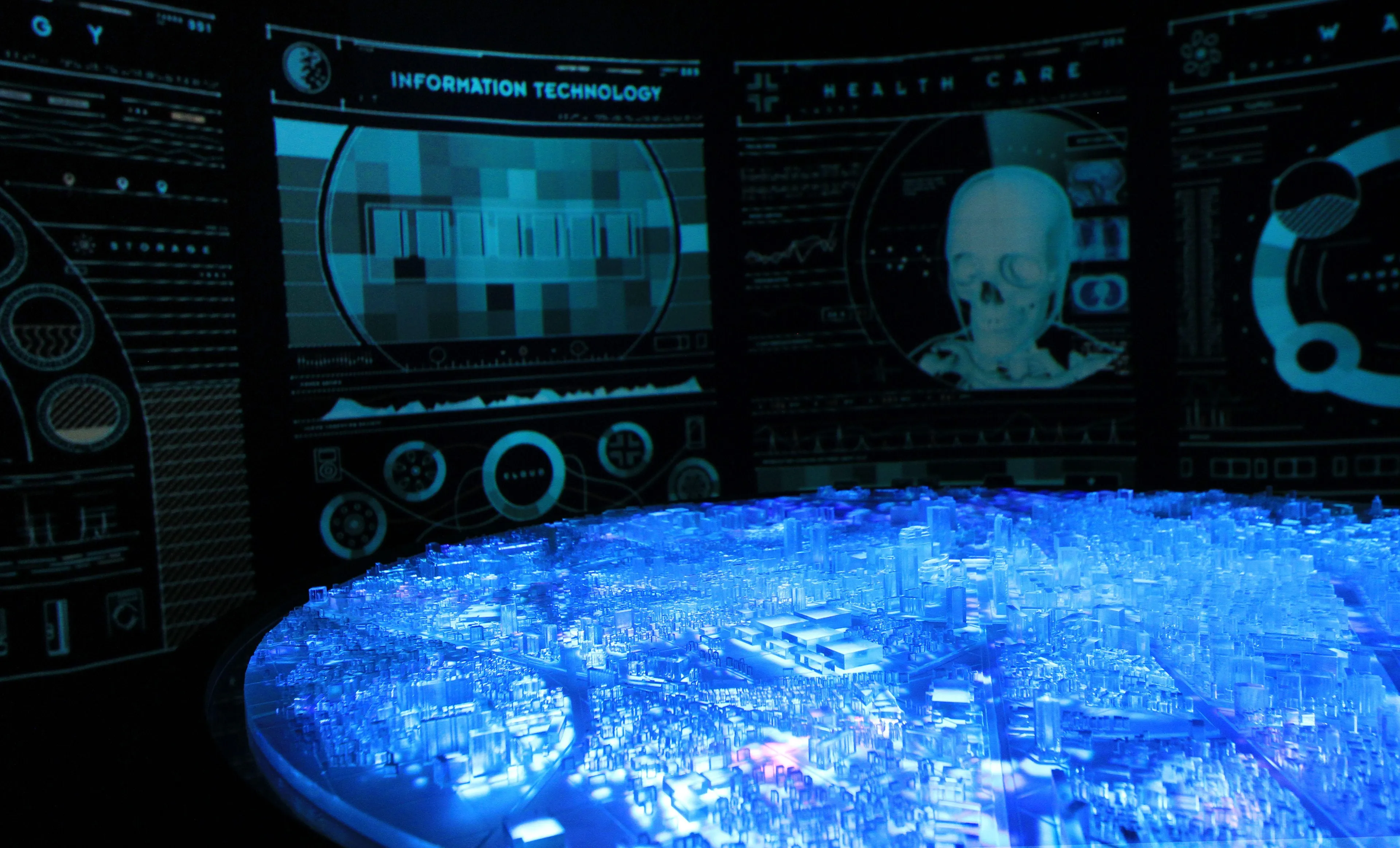 The Kawasaki City of the future, output in transparent resin with a 3D printer, and an enormous circular space.