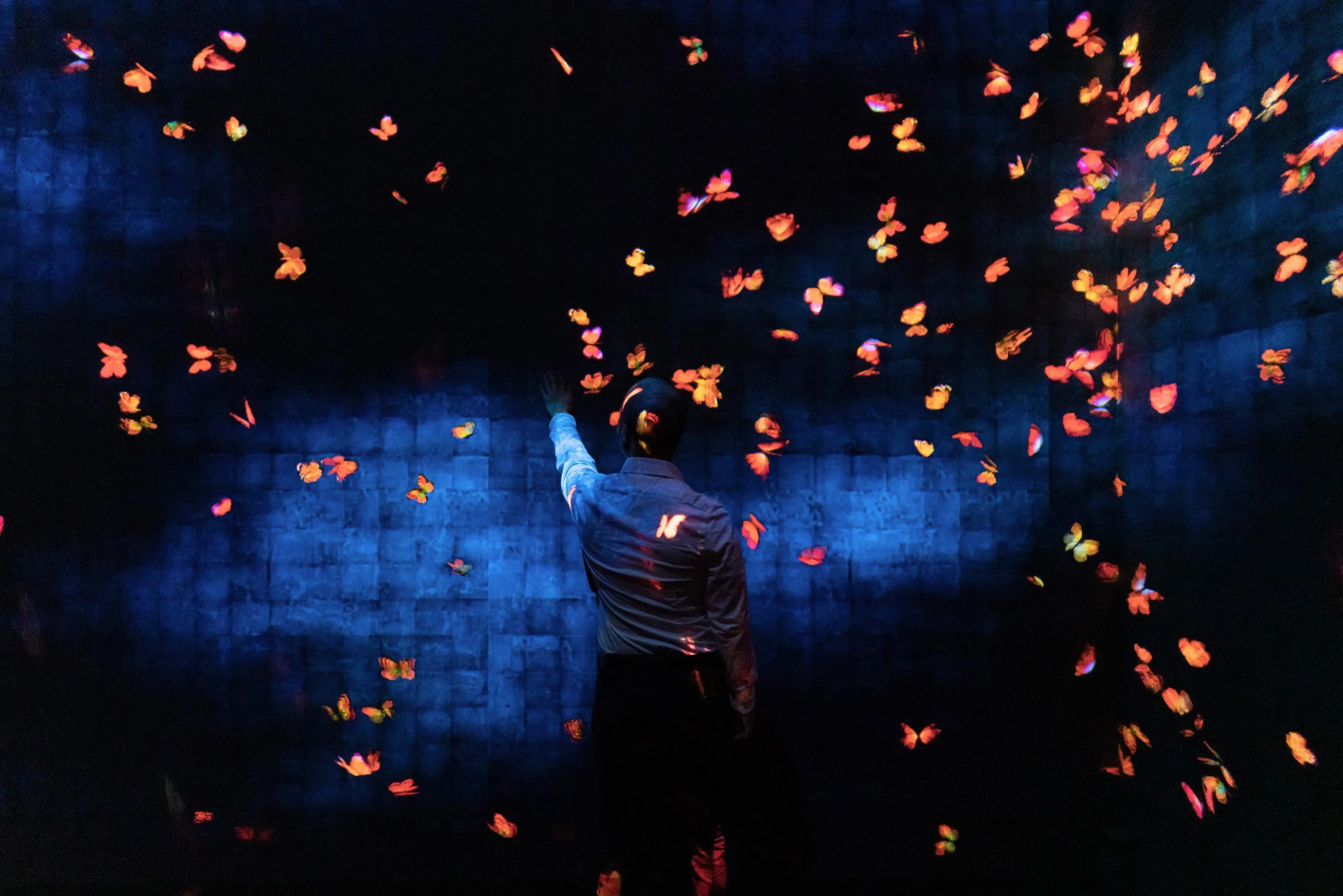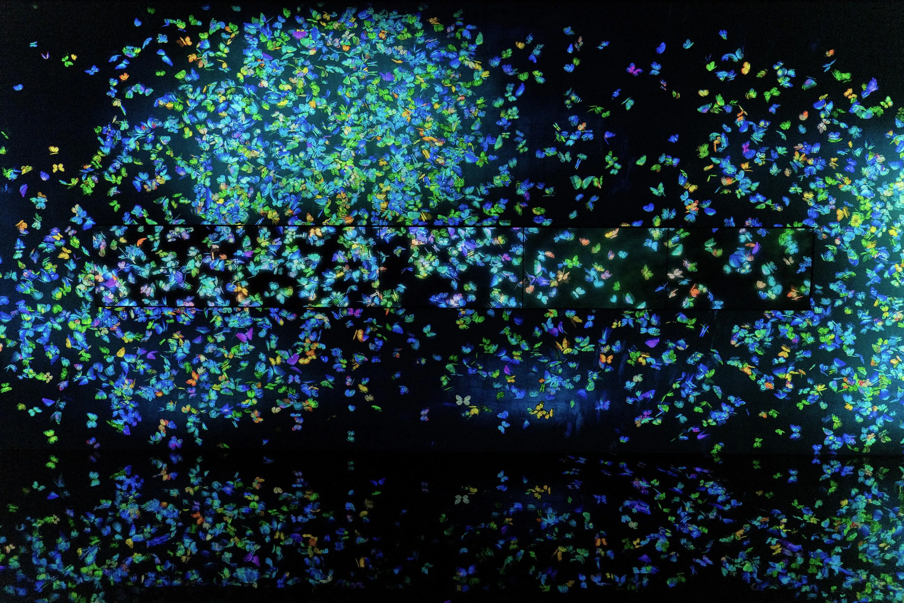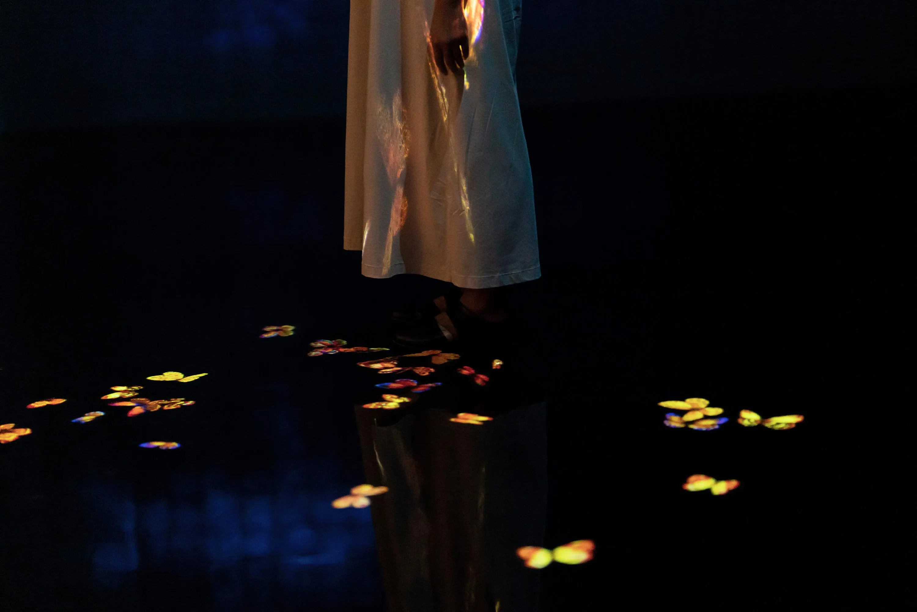 When no one is in the space, it is completely dark and nothing exists. When people enter the space and stand still, butterflies are born from their feet where they stand, or from their hands where they touch the wall. When people touch the butterflies themselves, the butterflies die.