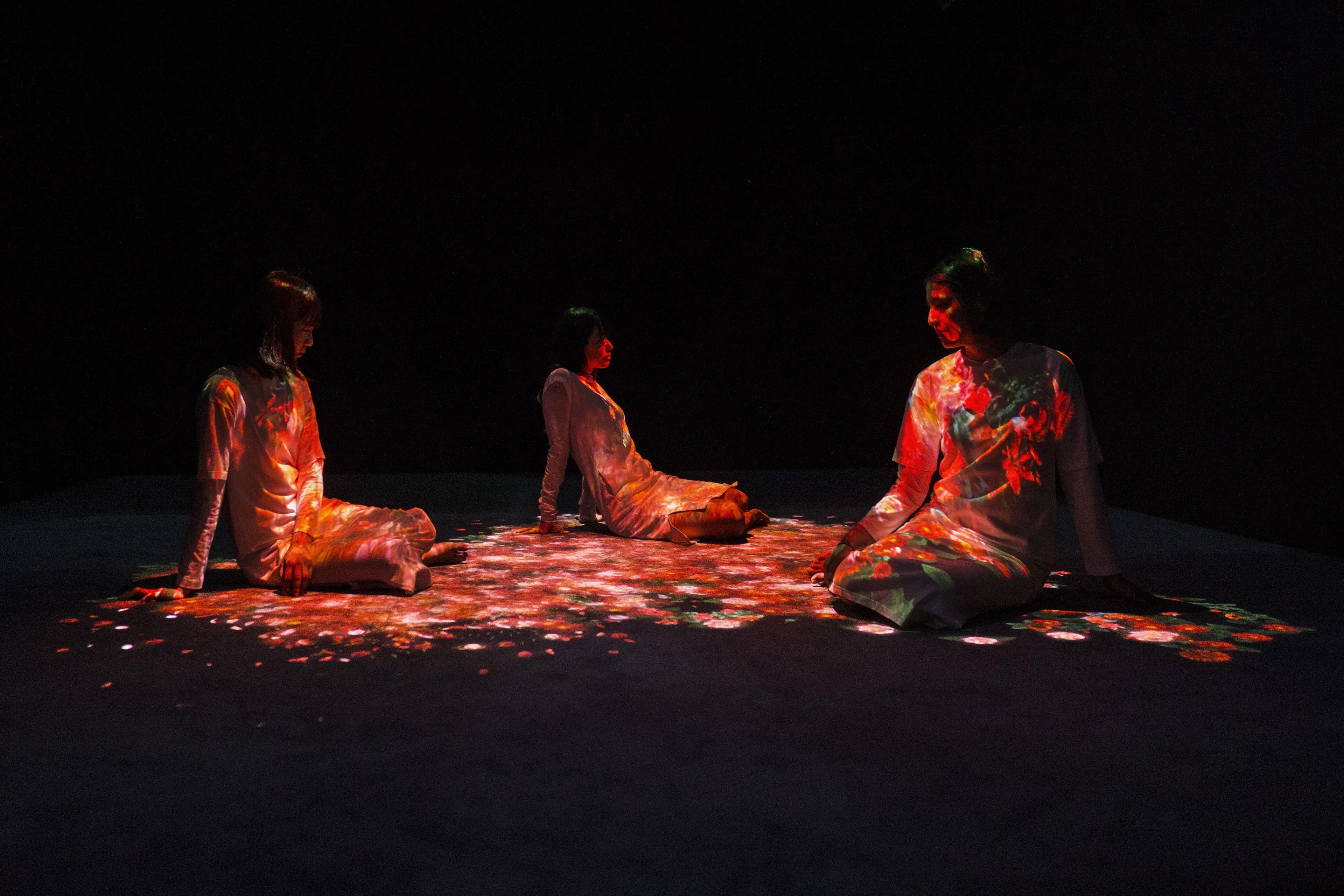 Without people this installation is a dark space. When people enter the room and stand still flowers blossom on the people and before long the flowers spread out below their feet. When those flowers come close to another person they spread in that direction and connect.