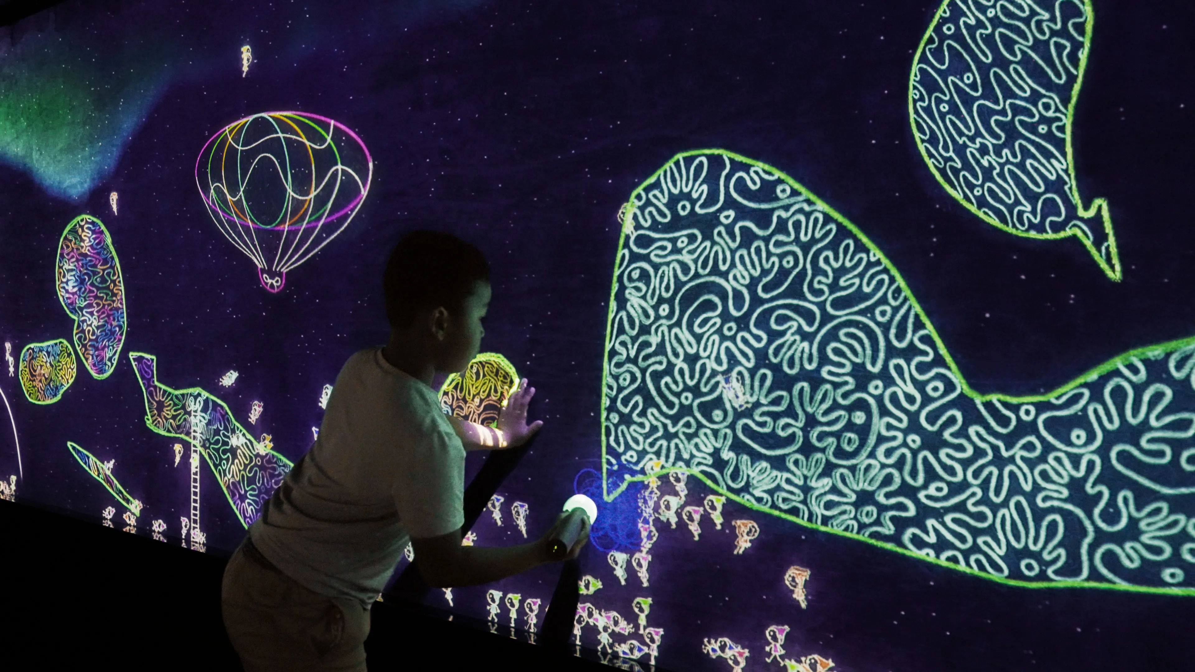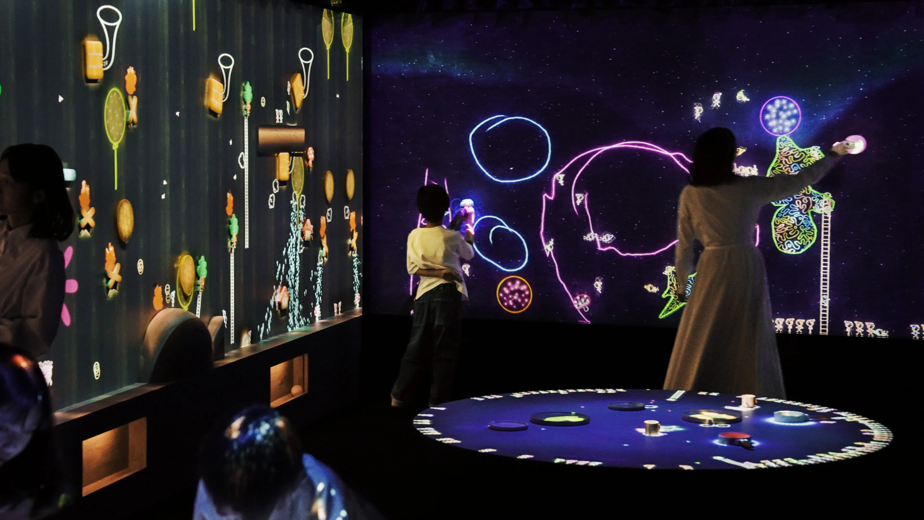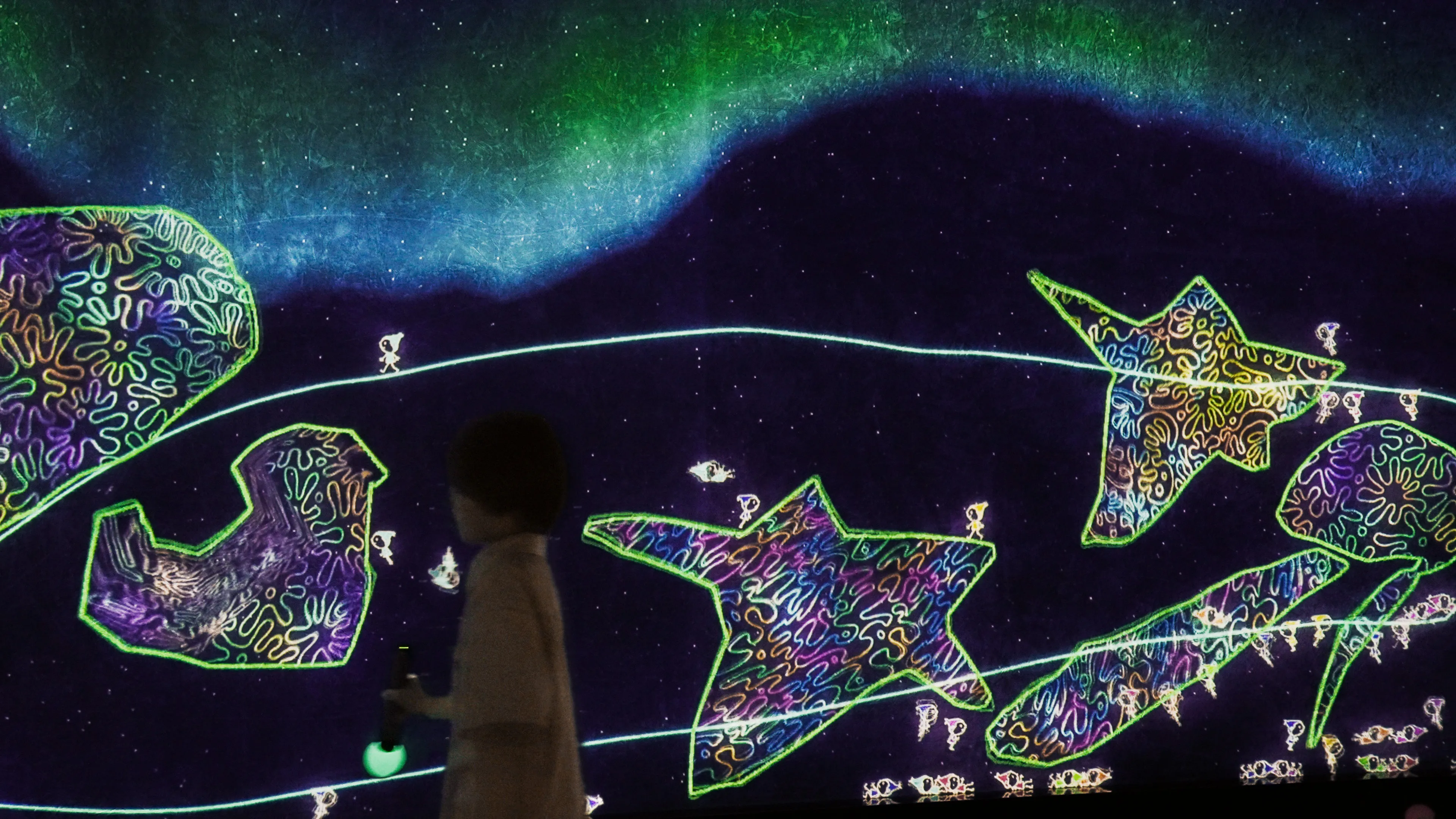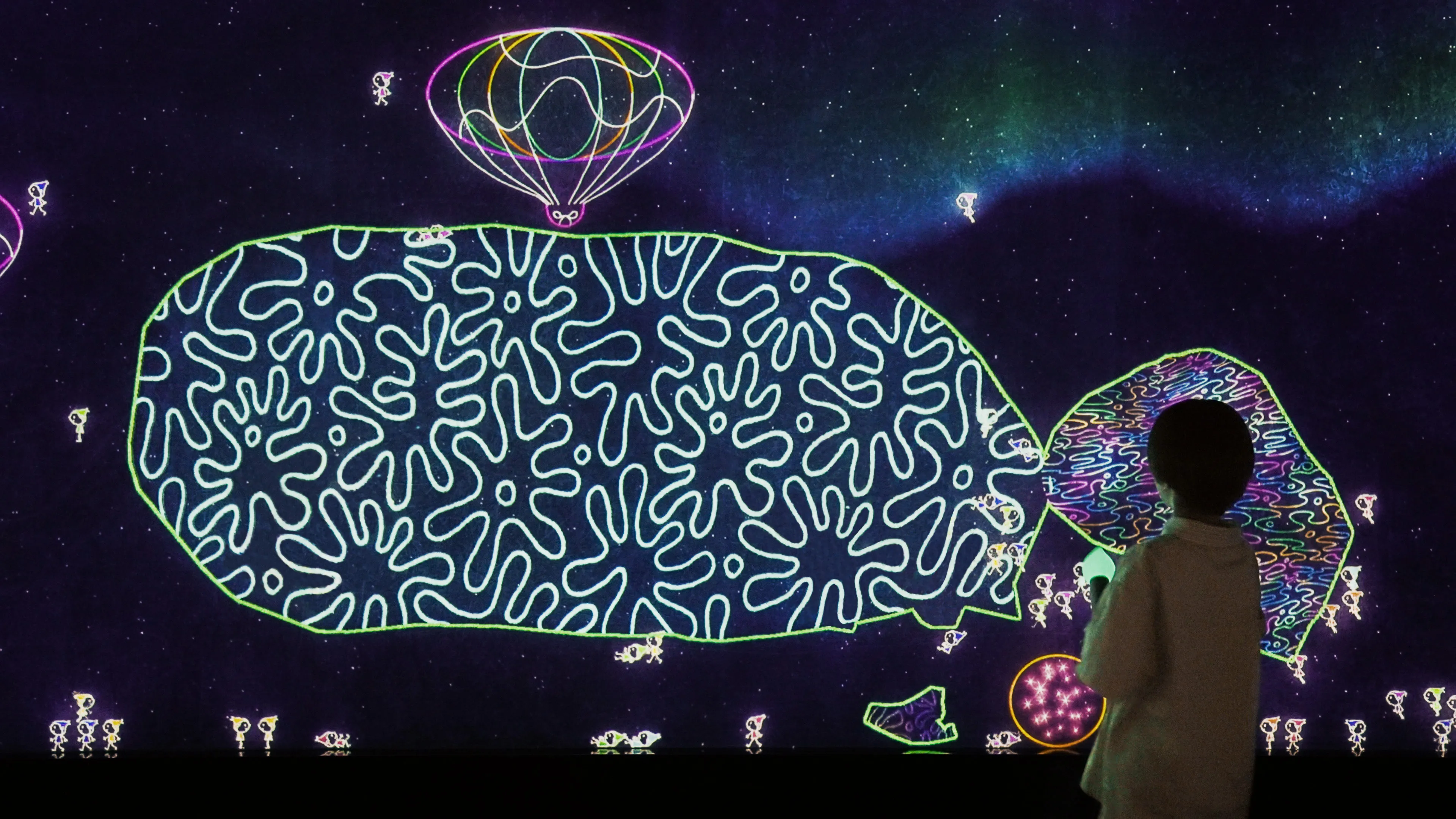 You can create a picture by drawing lines with a light pen or creating shapes with a light stamp. Each line has a special power depending on its color, and influences the little people’s world. The shapes created by the light stamps appear in the little people’s world and start to move.
