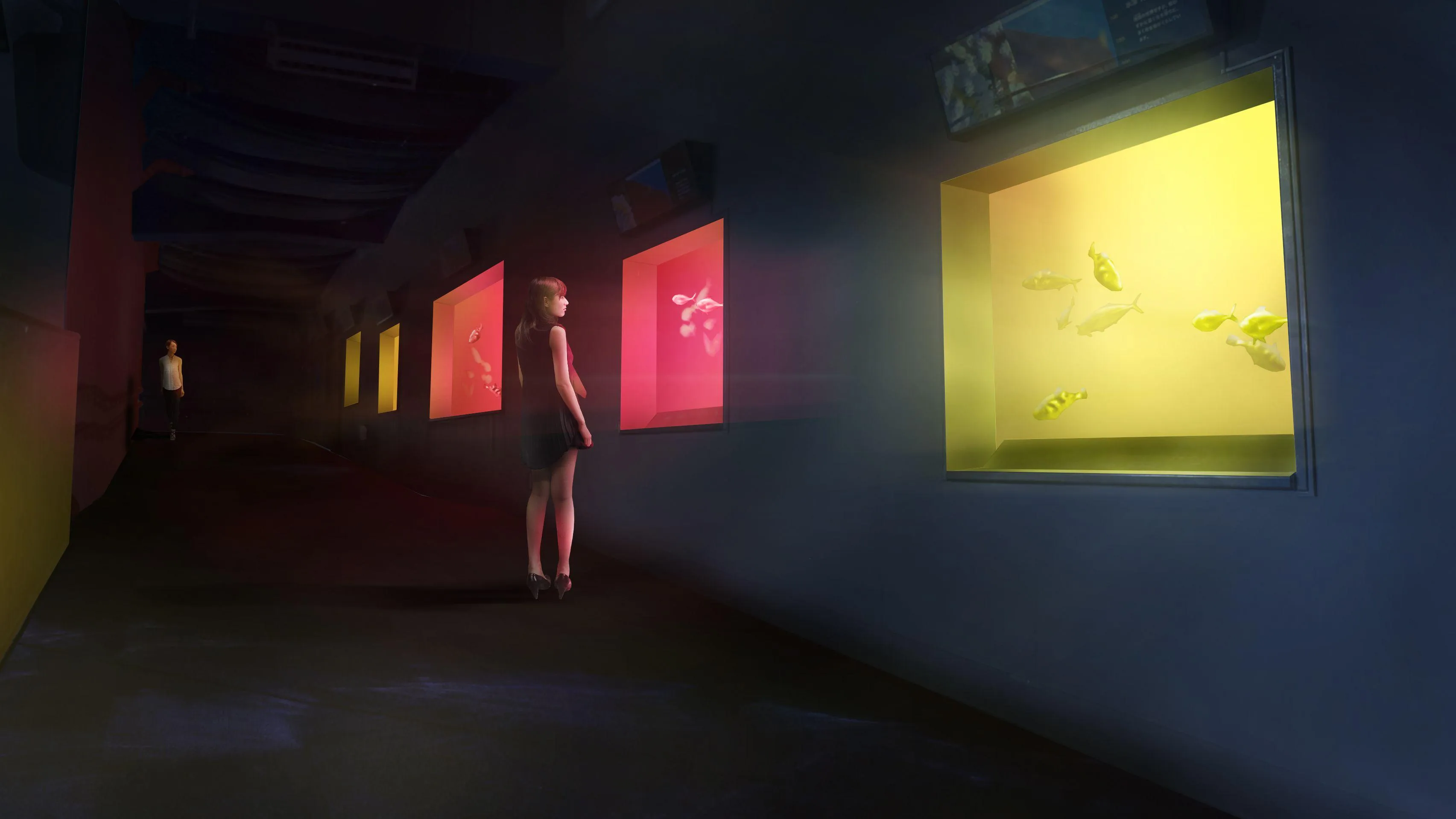 When visitors approach the glass of a tank, the color of the tank's lighting changes, and the tank emits a musical tone unique to the color of the light. The tanks also resonate with other tanks nearby, changing to display the same colors and produce the same tones, creating a chain reaction.