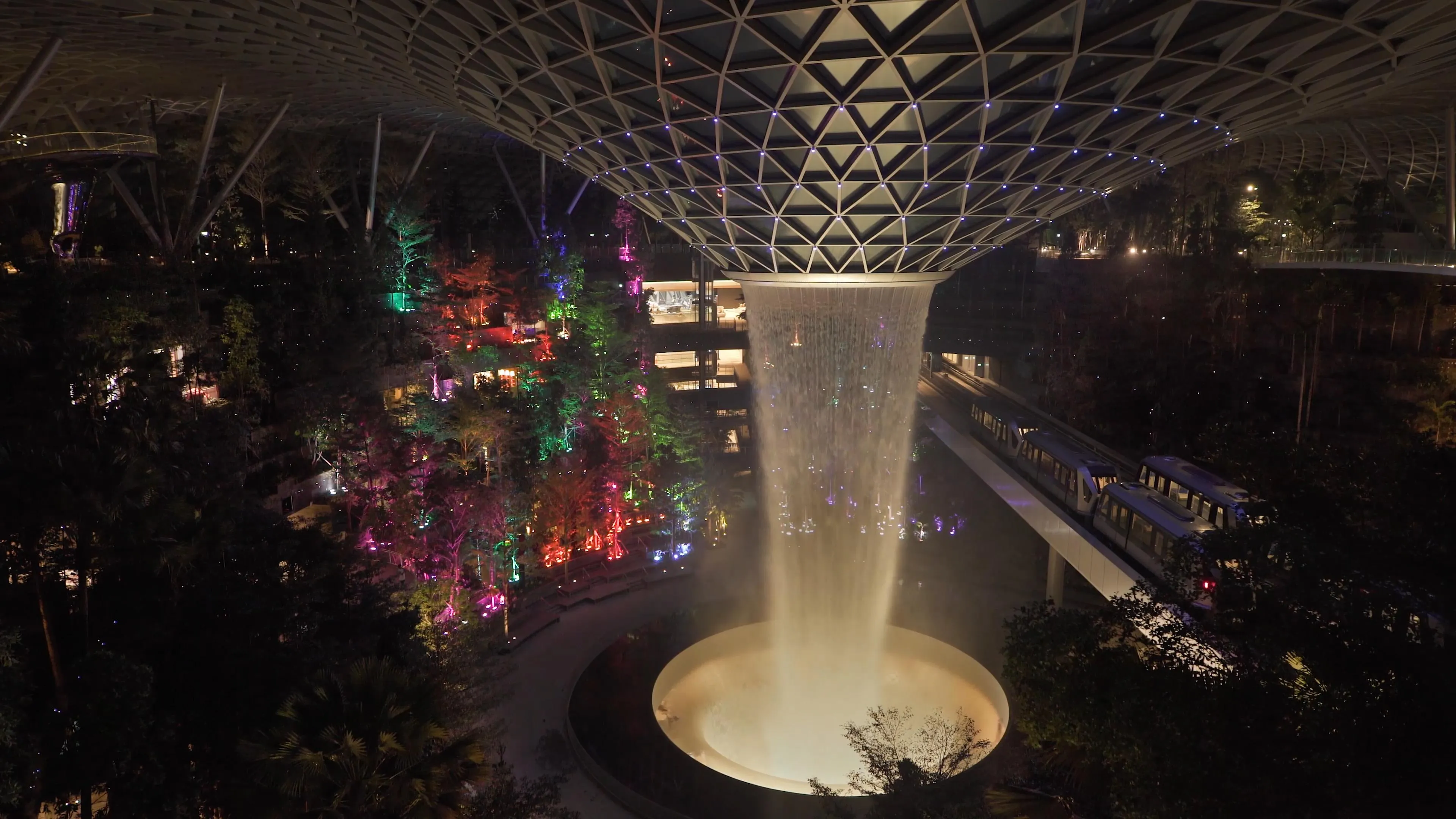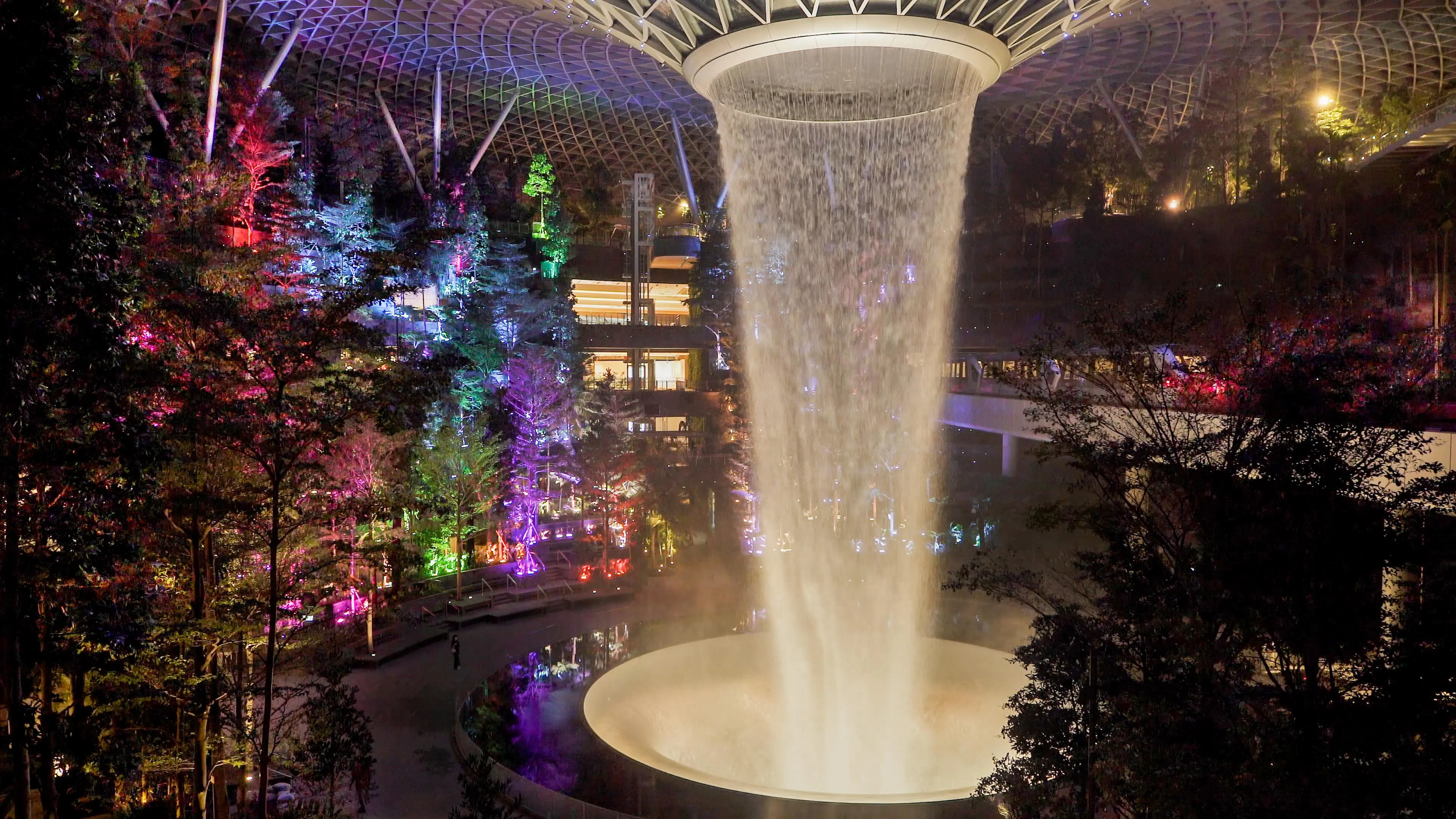 The trees of the Shiseido Forest Valley at Jewel Changi Airport shine brightly. Each tree’s light is autonomous, shining brightly and then fading as if it’s breathing.