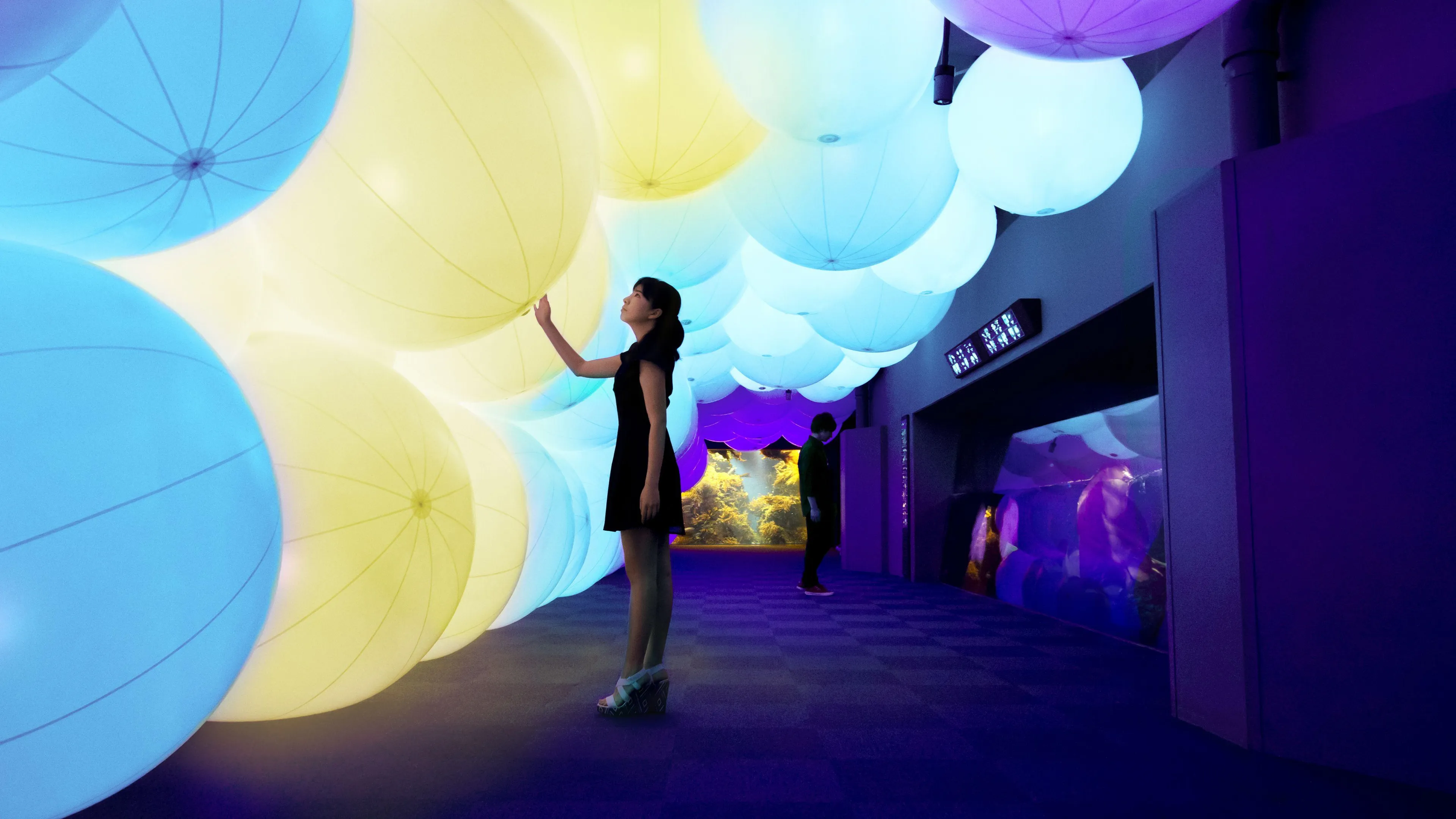 The night aquarium space is filled with spheres of light.