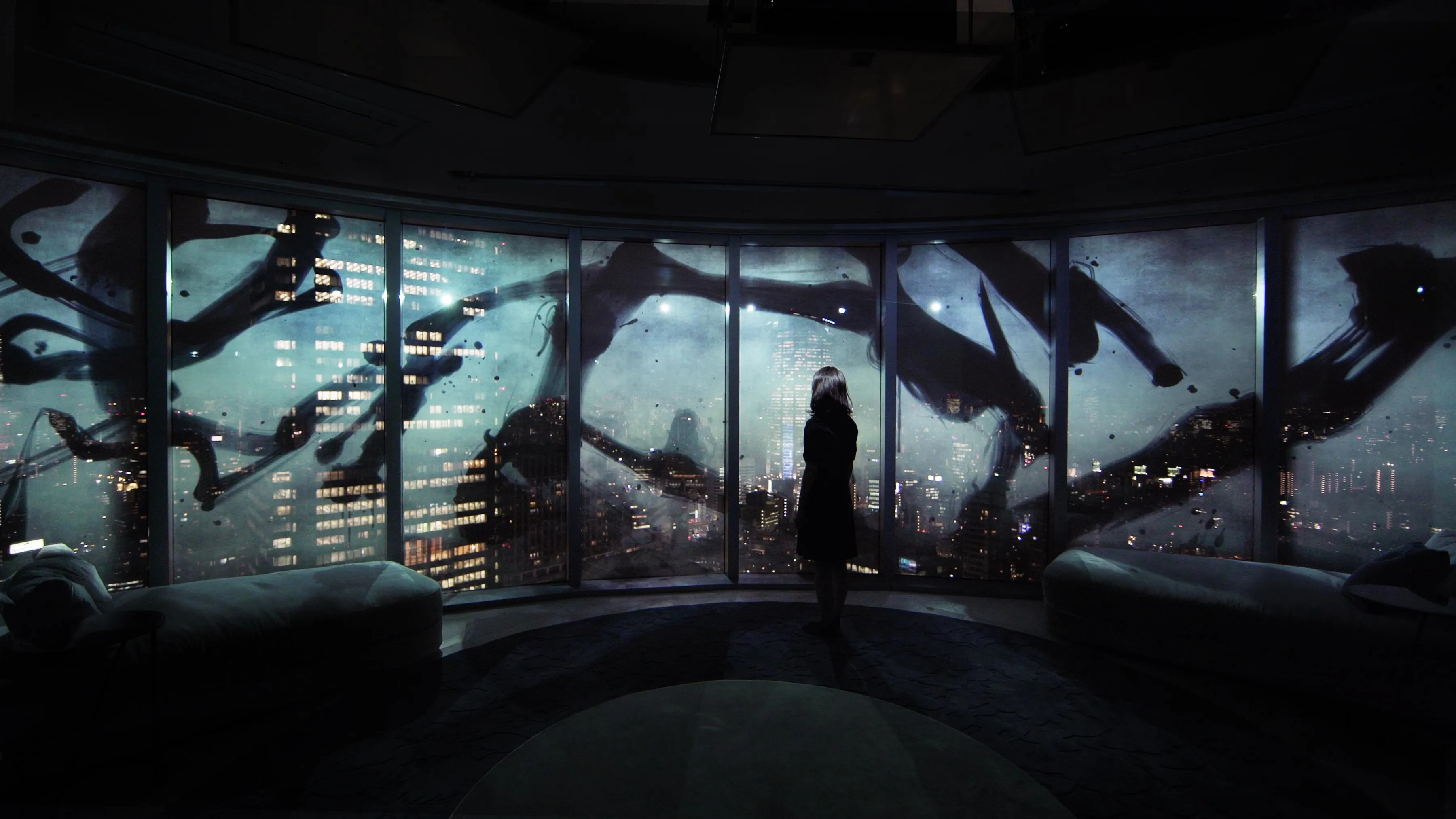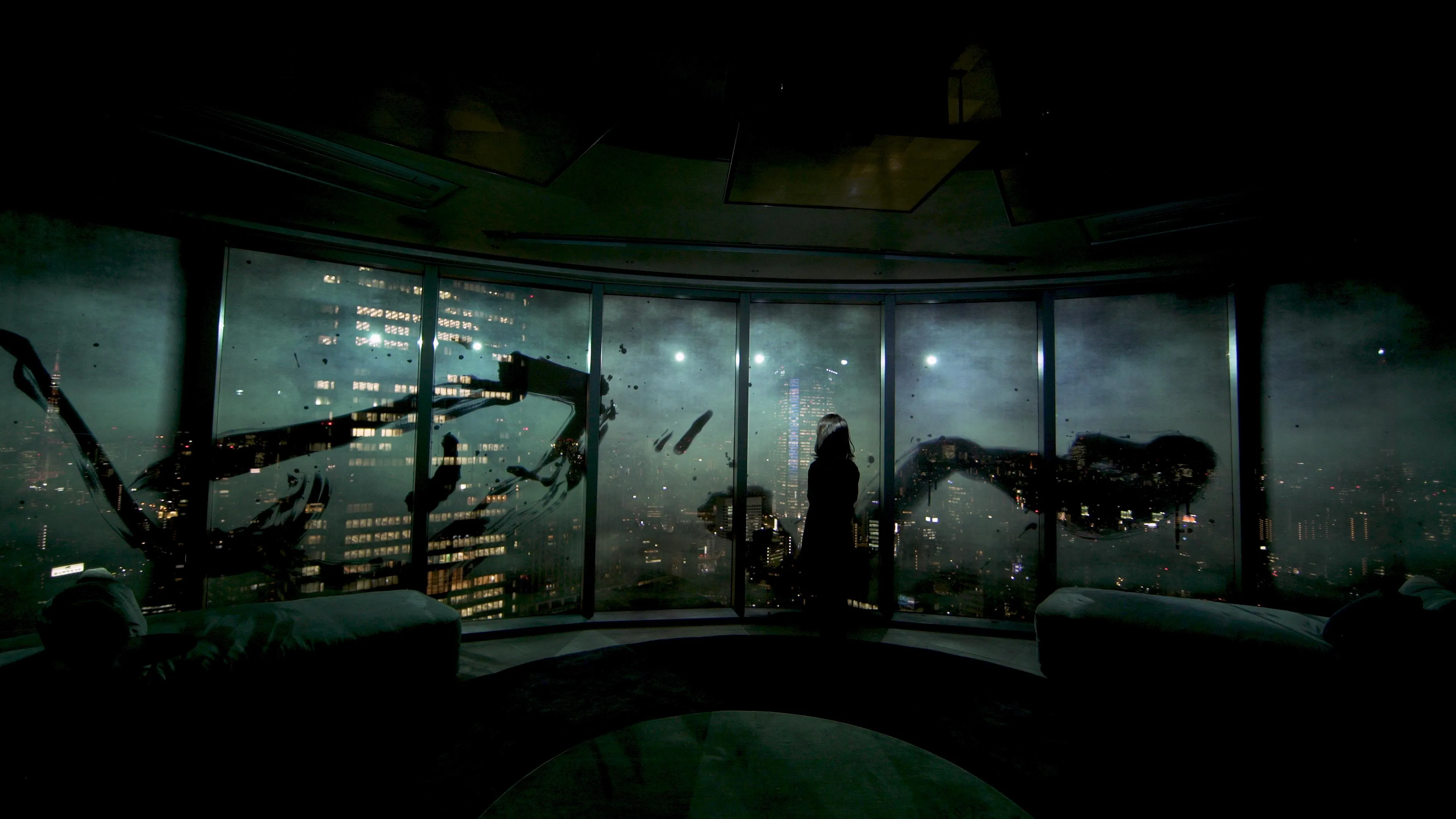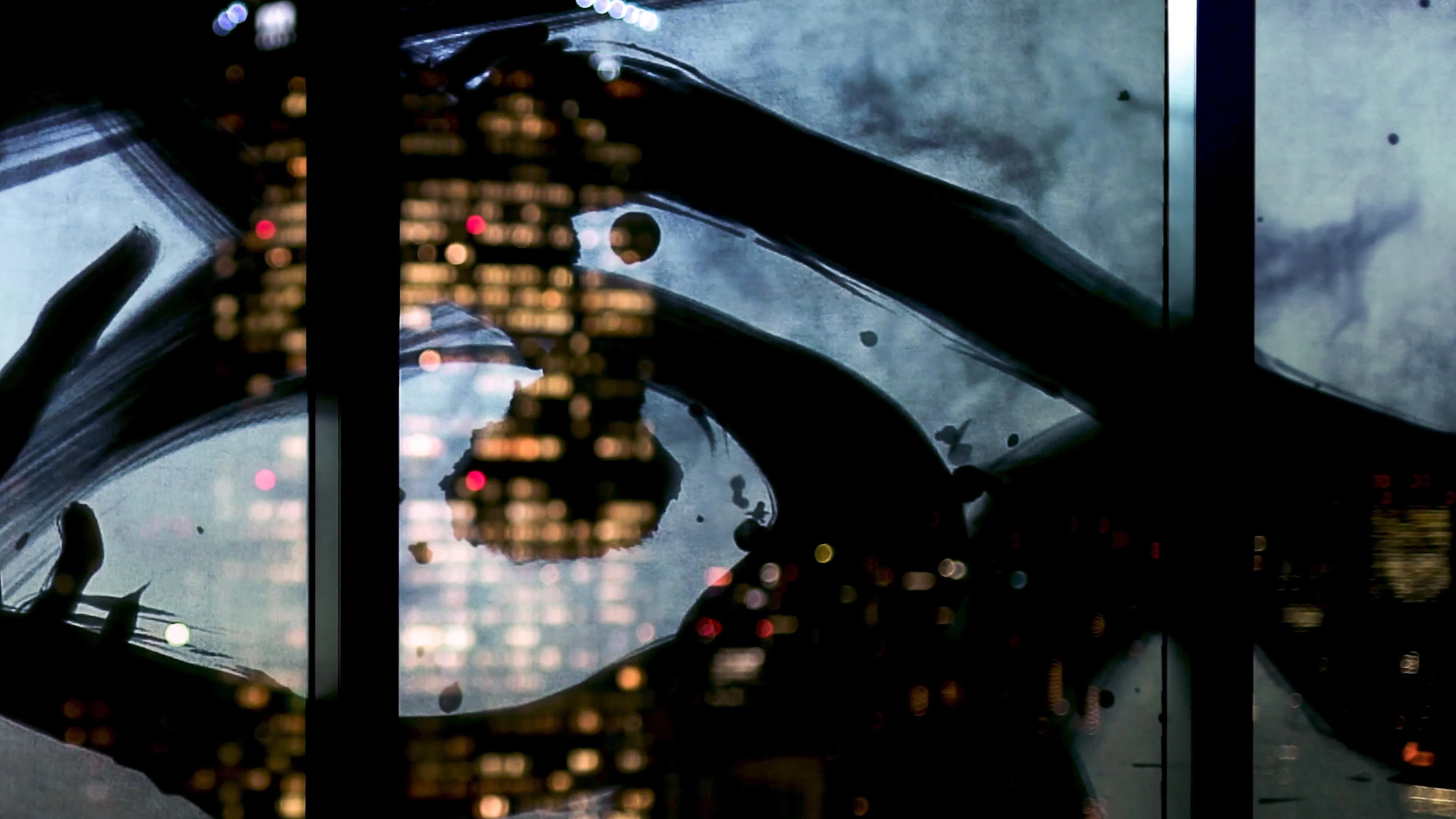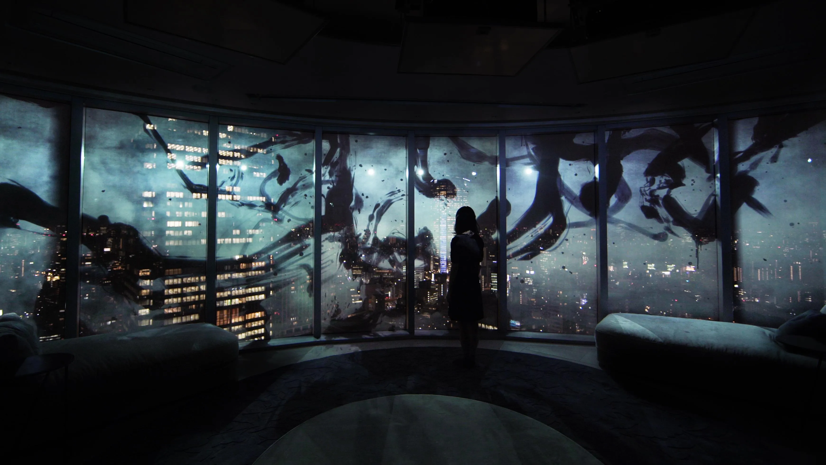 This artwork incorporates the nighttime skyline of Tokyo. The light that draws the calligraphy is black, meaning there is no light. When visitors get close, they can only see the night scenery through this calligraphy.