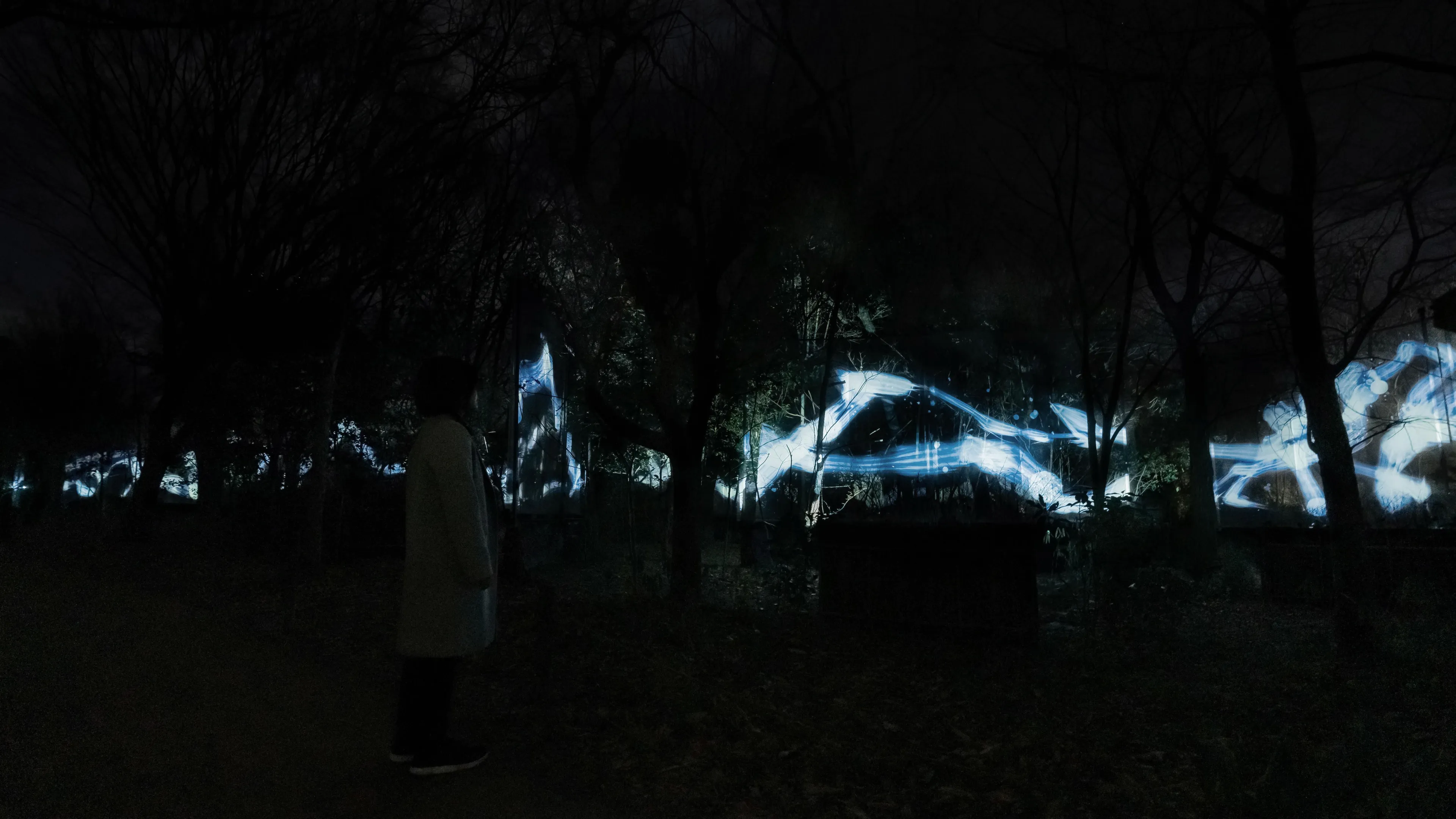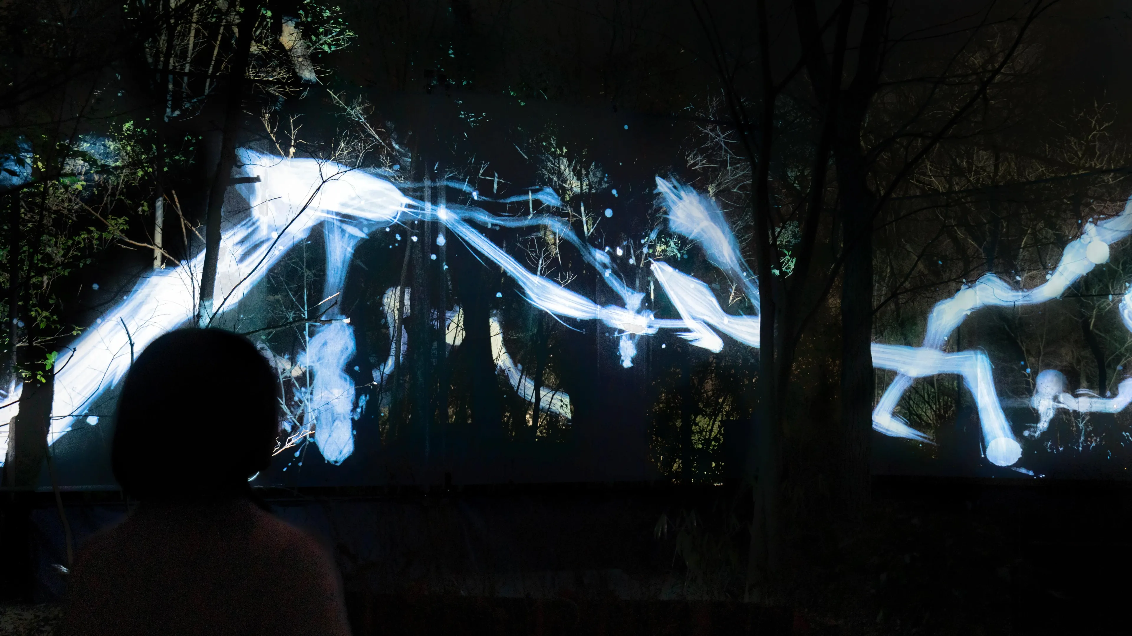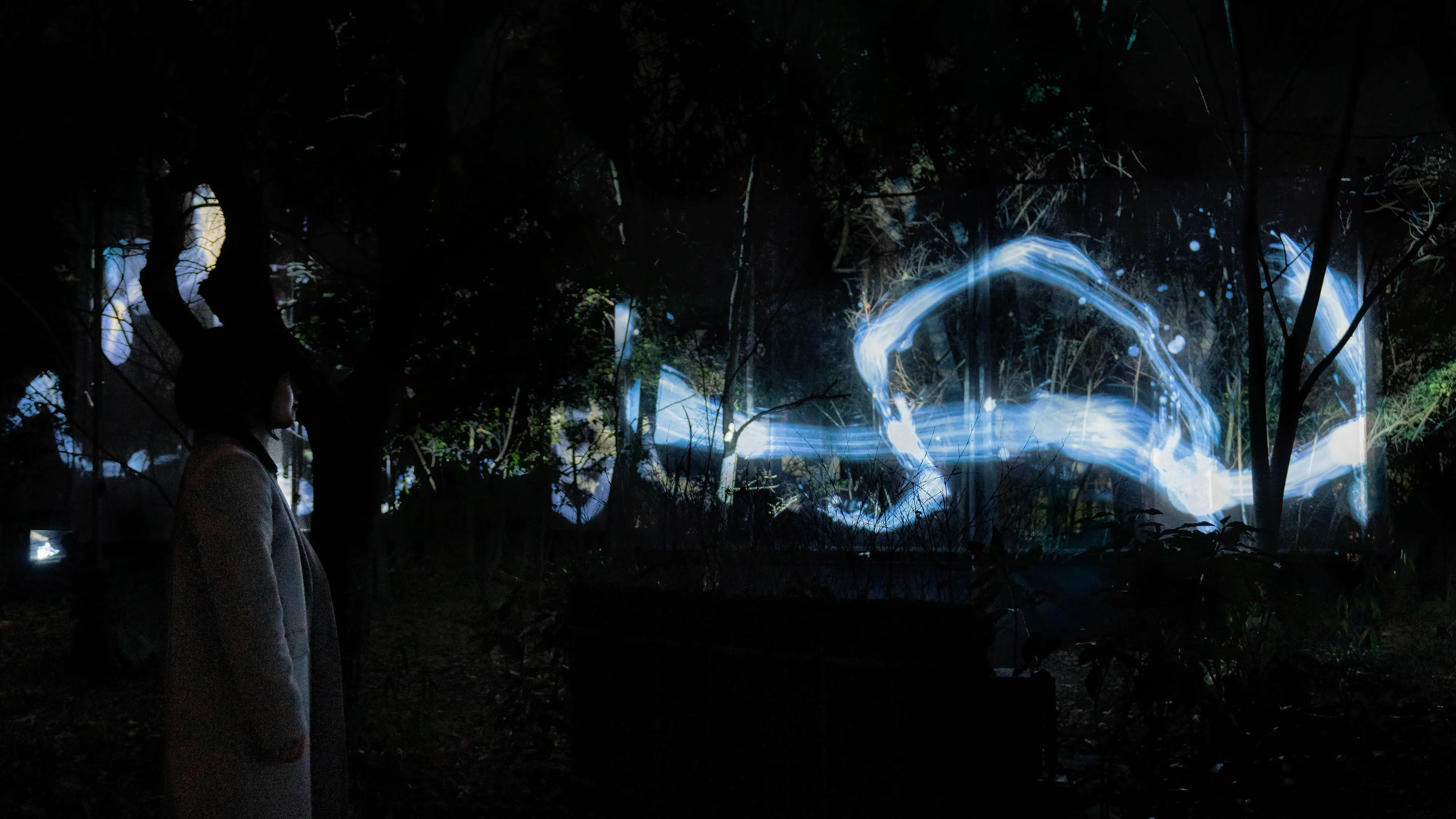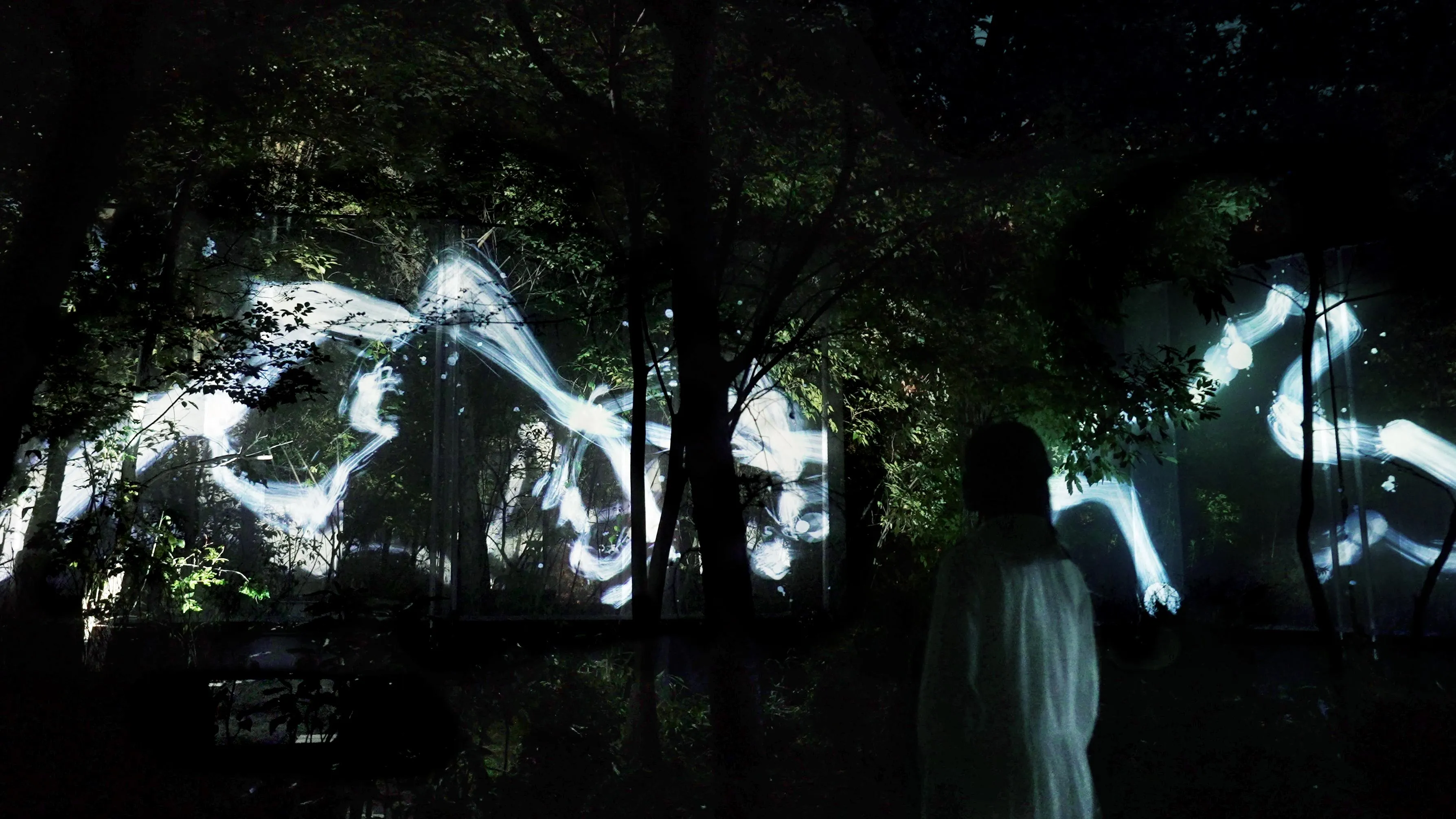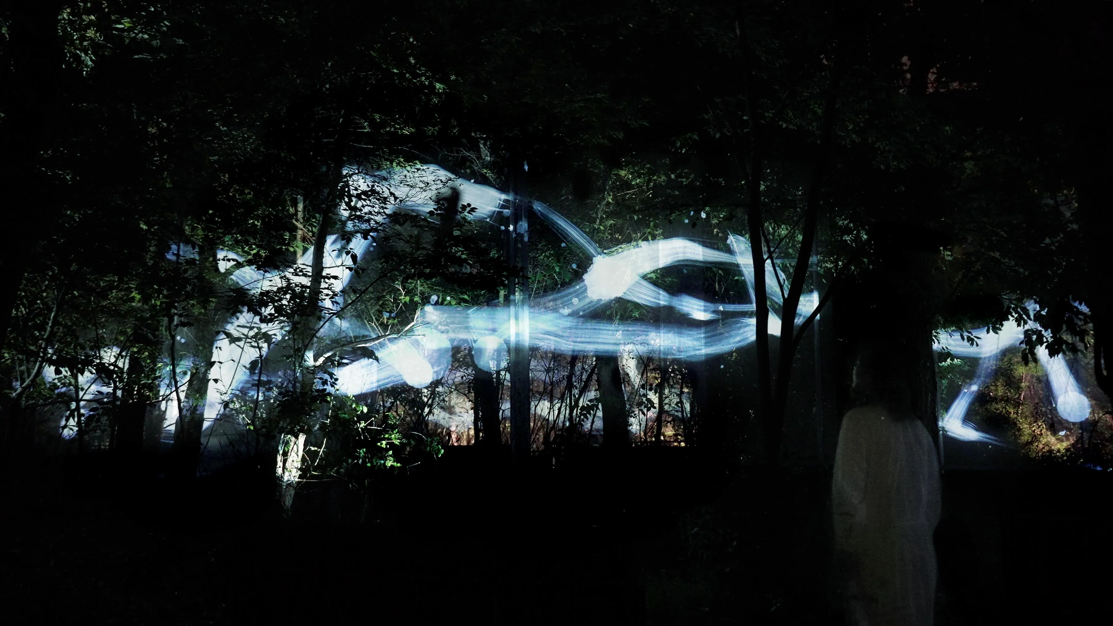 A continuous and unicursal Spatial Calligraphy drawn in the forest. The Spatial Calligraphy intersects and rotates in multiple layers, and eventually disappears.