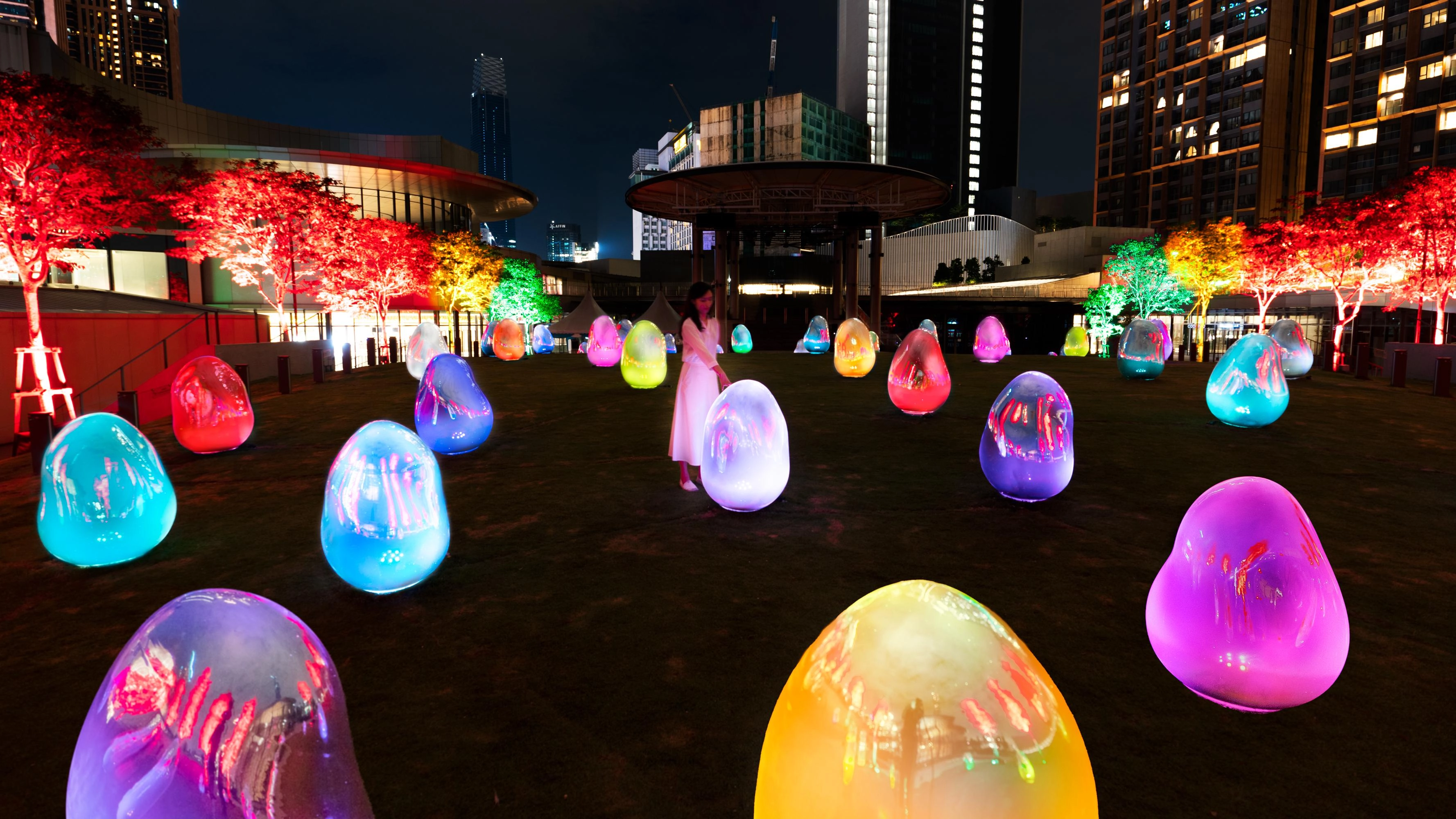 teamLab is experimenting with the concept of color. The ovoids can change into a total of 57 newly-defined Liquified Light Colors.