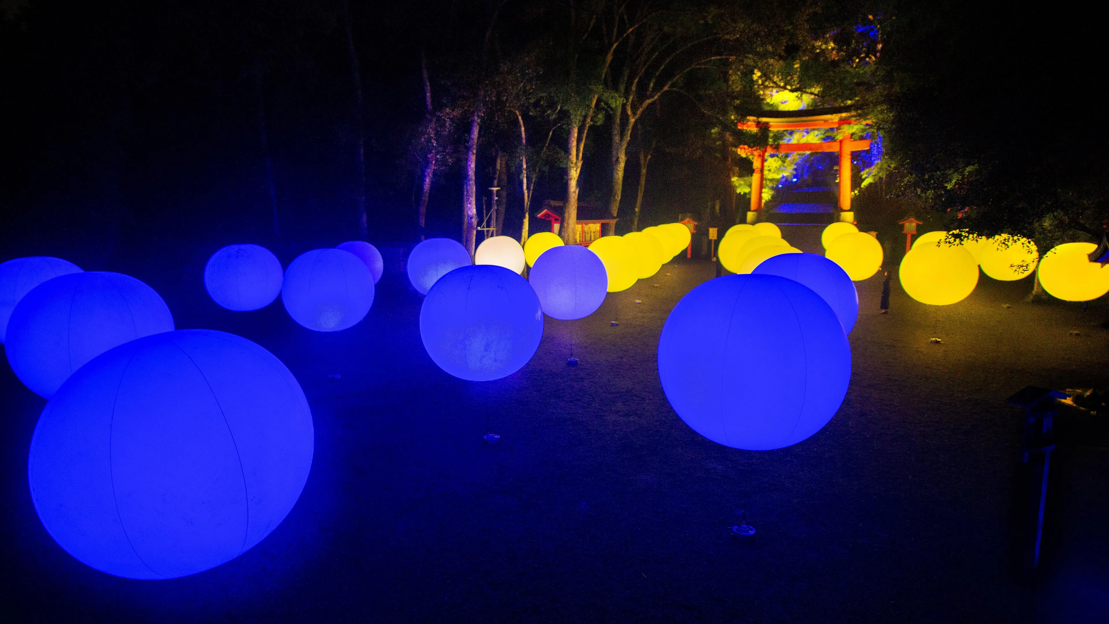 「宇佐神宫 光之祭典 Art by teamLab」中将展示「飘浮的呼应球体」及「呼应之树」。宇佐神宫的参道与森林,将因为人们的存在而变化为一个互动的光之数字艺术空间。