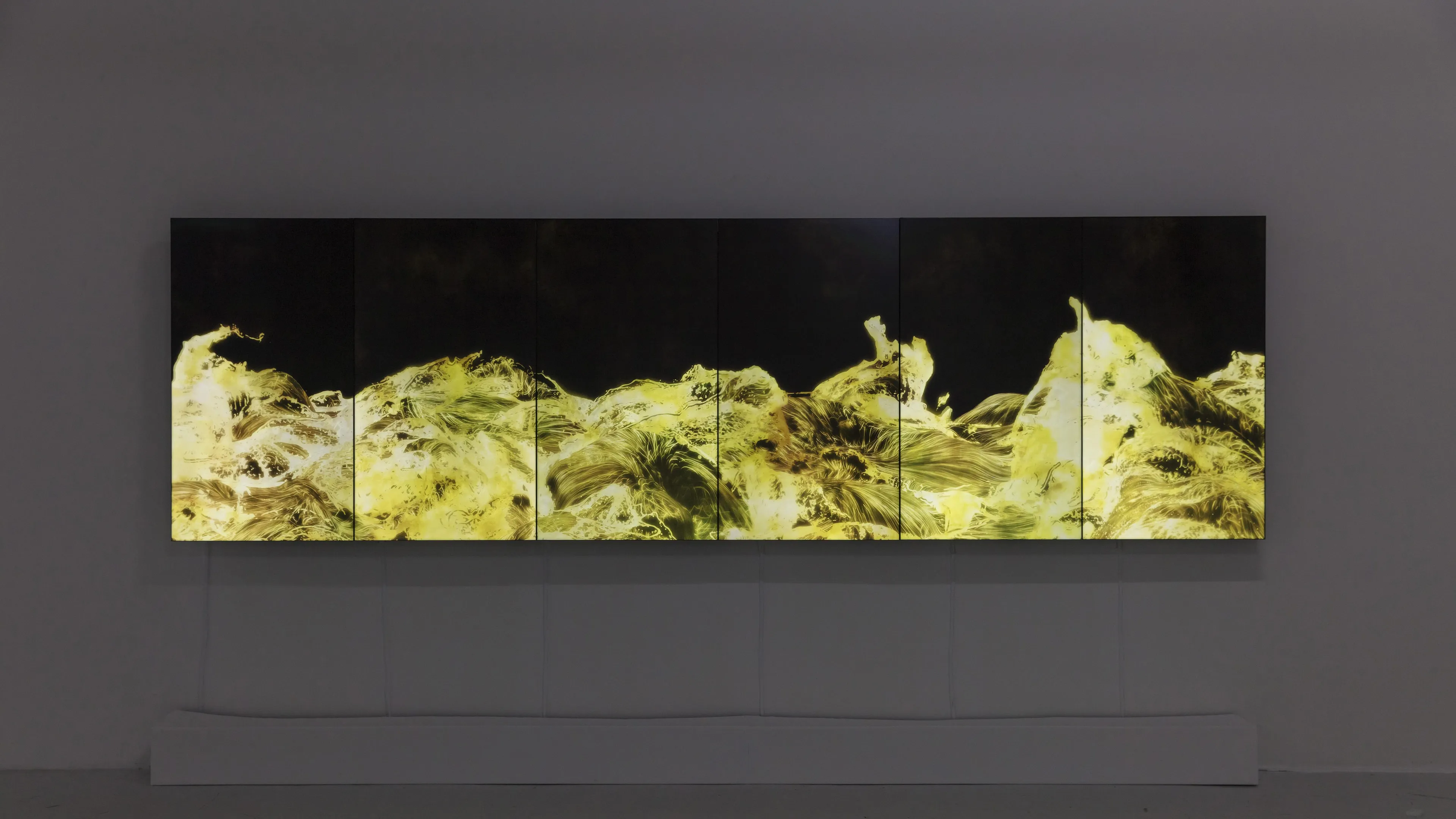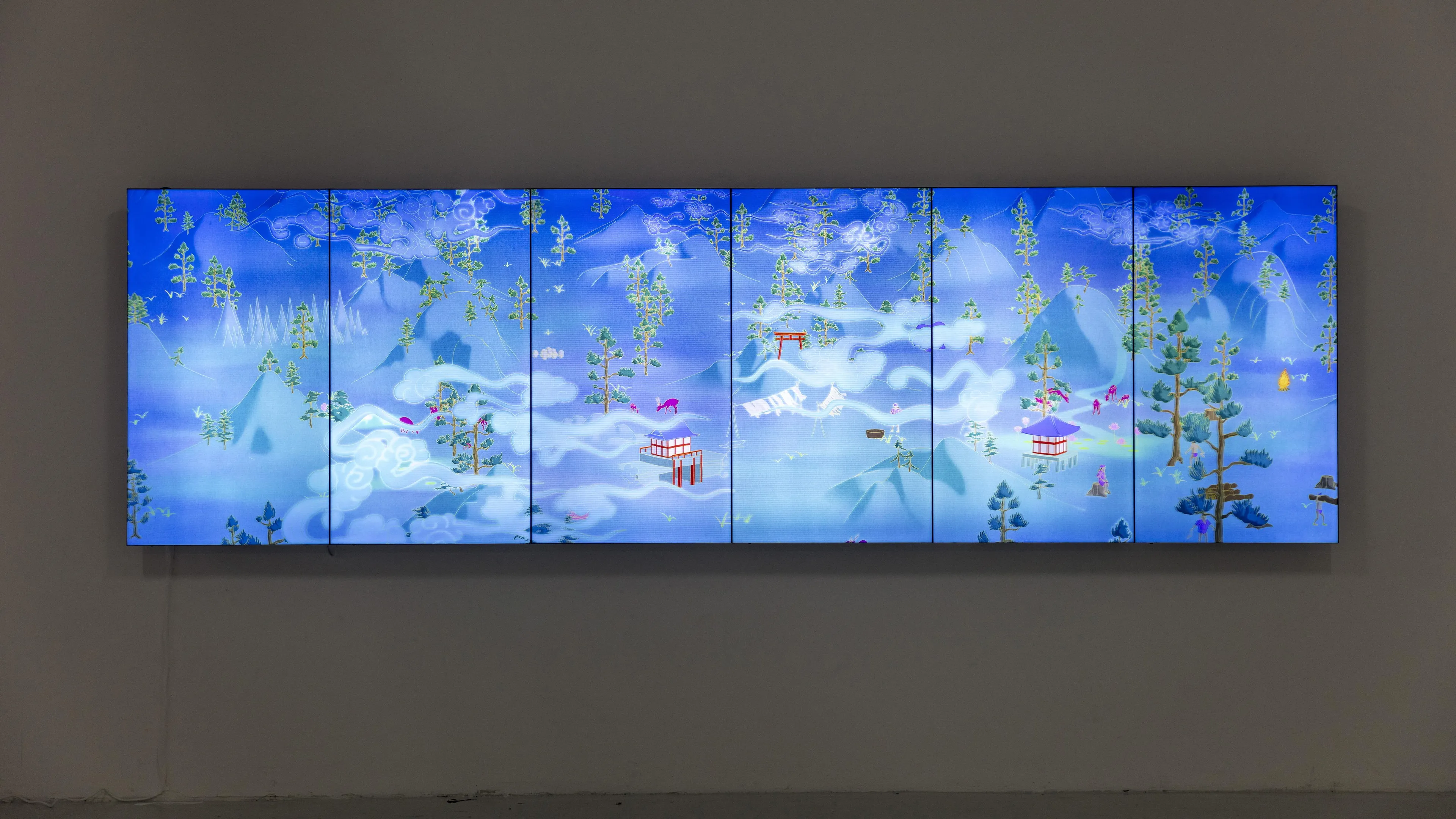 The movement of waves in water is simulated in a computer-generated three-dimensional space. The water is expressed as a continuous body after calculating the interactions of hundreds of thousands of particles. To visualize the waves, the behavior of the particles of the water was then extracted and lines were drawn in relation to the movement of the particles. The wave created in a 3-D space is then turned into an artwork in accordance with what teamLab refers to as ultrasubjective space.