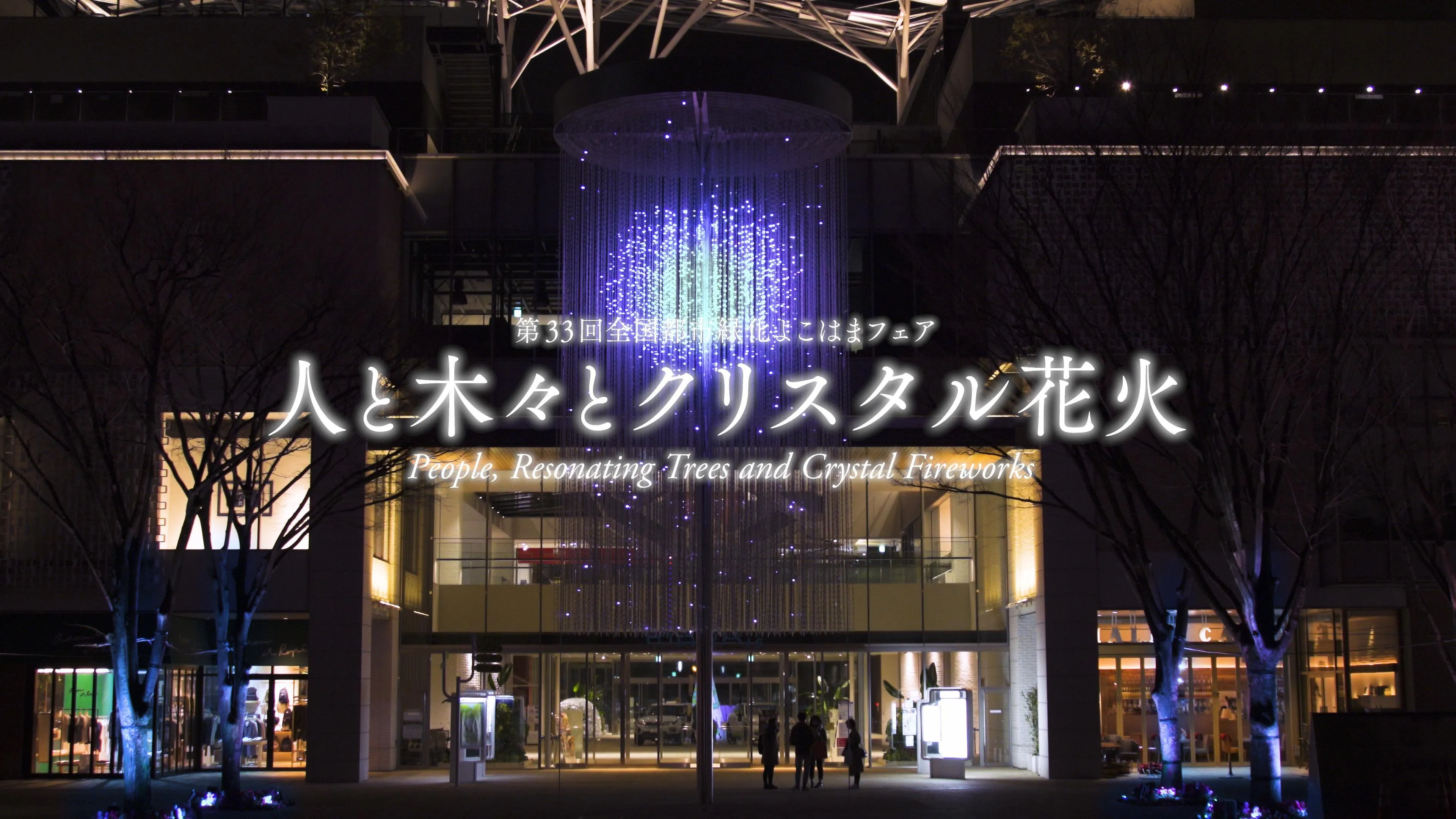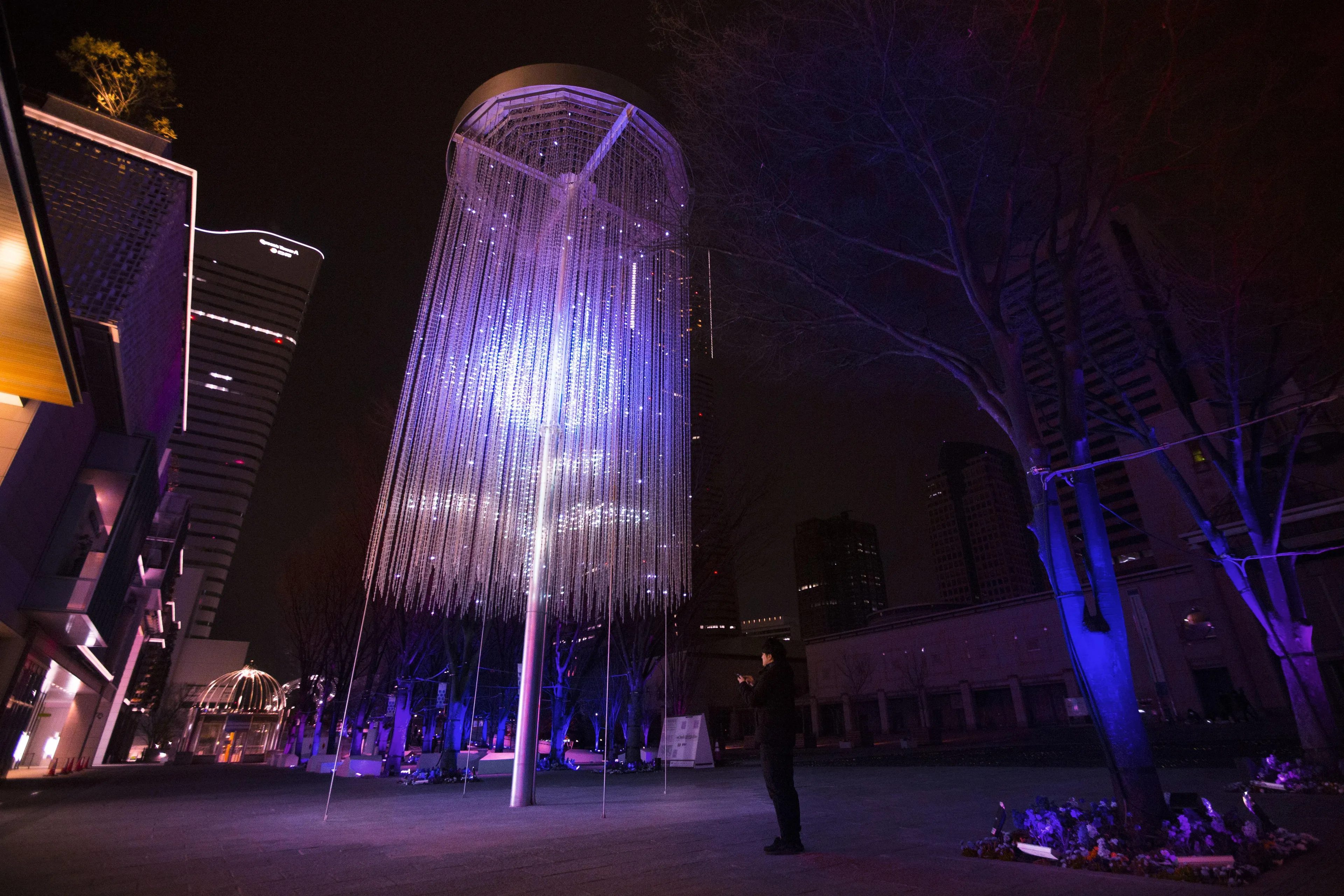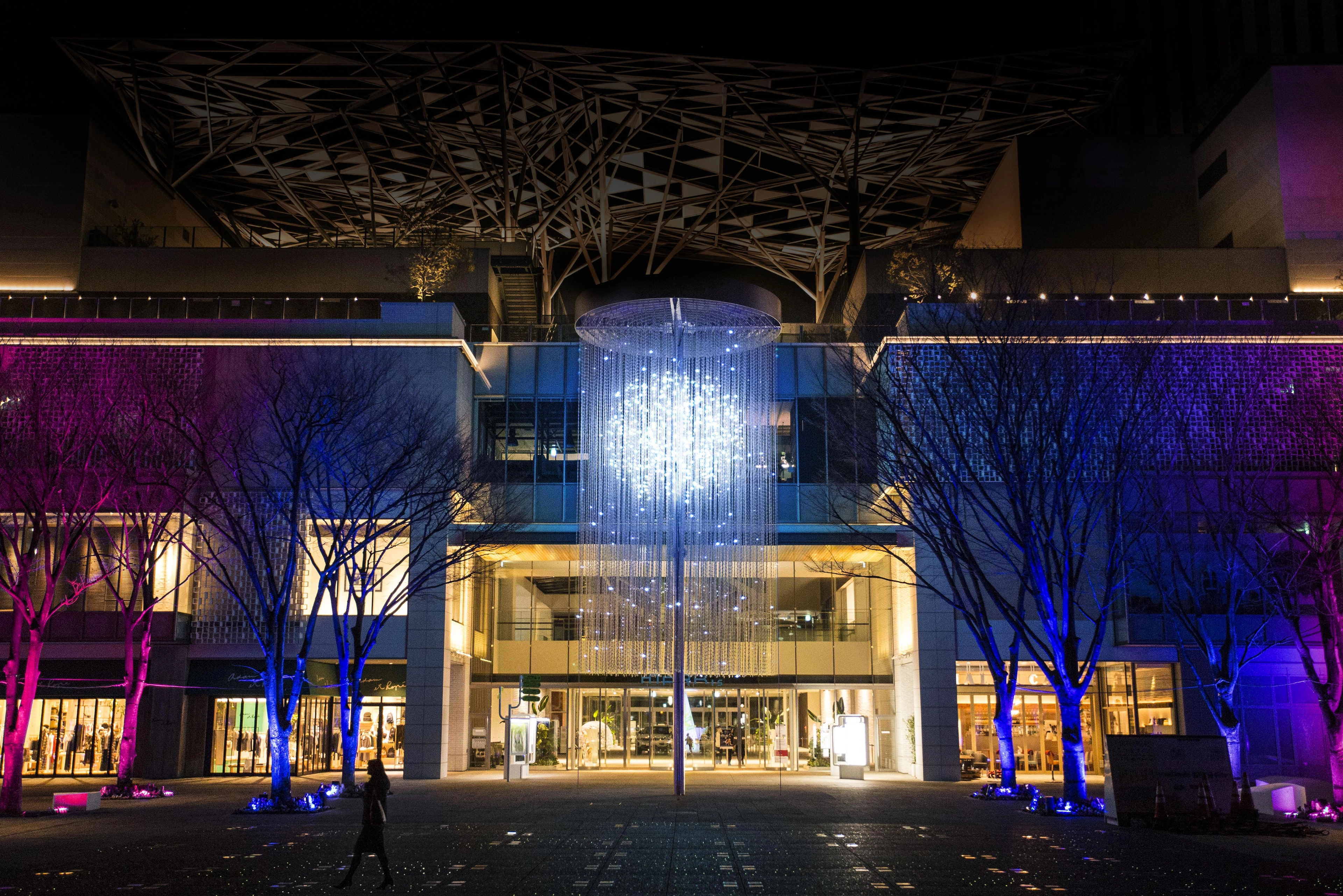 14m high 'teamLab Crystal Fireworks' - by selecting a firework on your smartphone, you can set off three-dimensional fireworks composed of numerous light points. In association with 'National Urban Greenery Fair Yokohama', there will in addition to fireworks, be three types of flowers; cherry, rose and tulip - gigantic blooming three-dimensional flowers composed of lights. 210-meters-long 'Resonating Trees' - the trees change their light and tone color which resonates out when people pass close to them in the Grand Mall Park. 'teamLab Crystal Fireworks' and 'Resonating Trees' are interconnected and when you select and set off a firework, it's color will be spread out to the surrounding trees in the park. The park becomes an interactive space of light.
