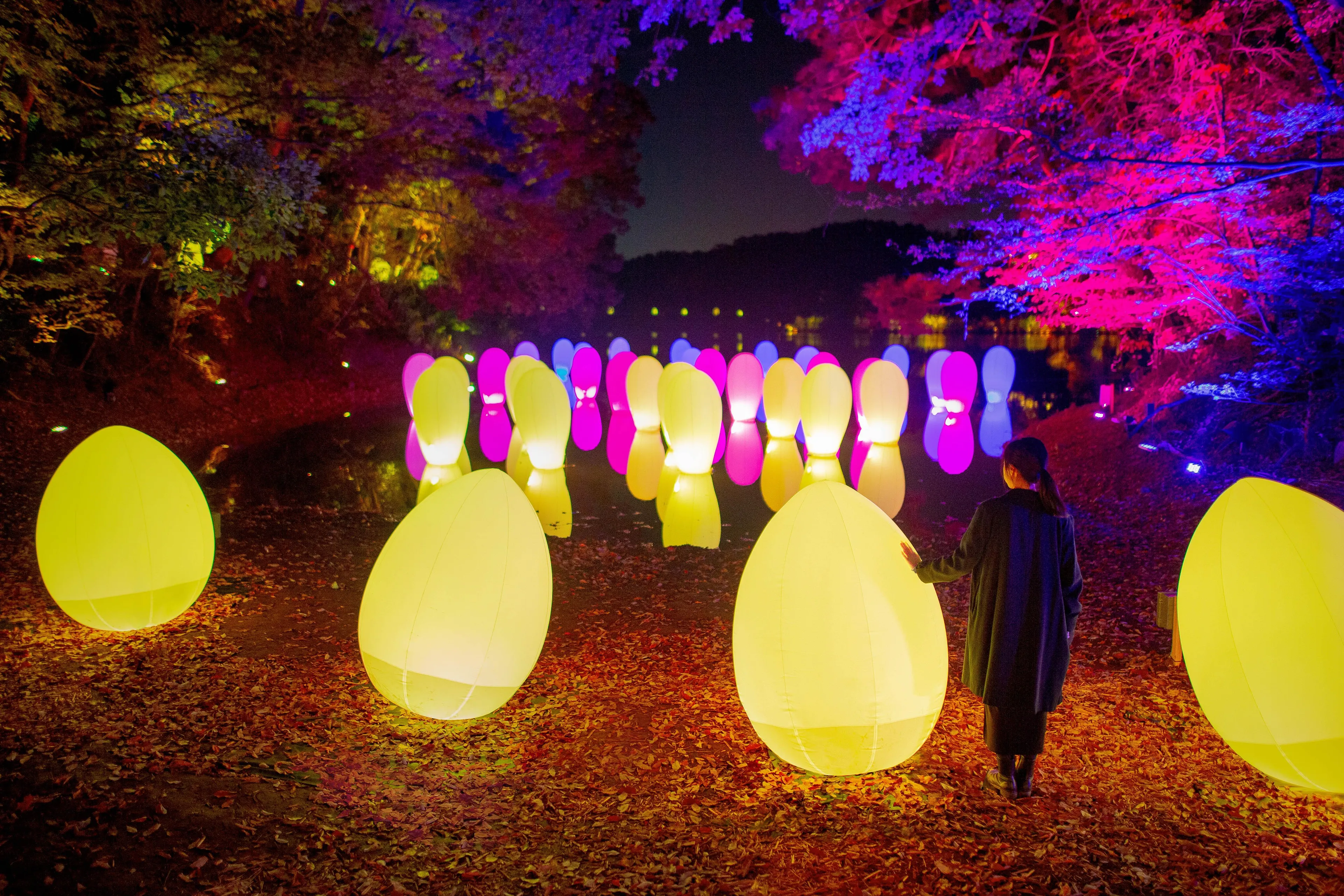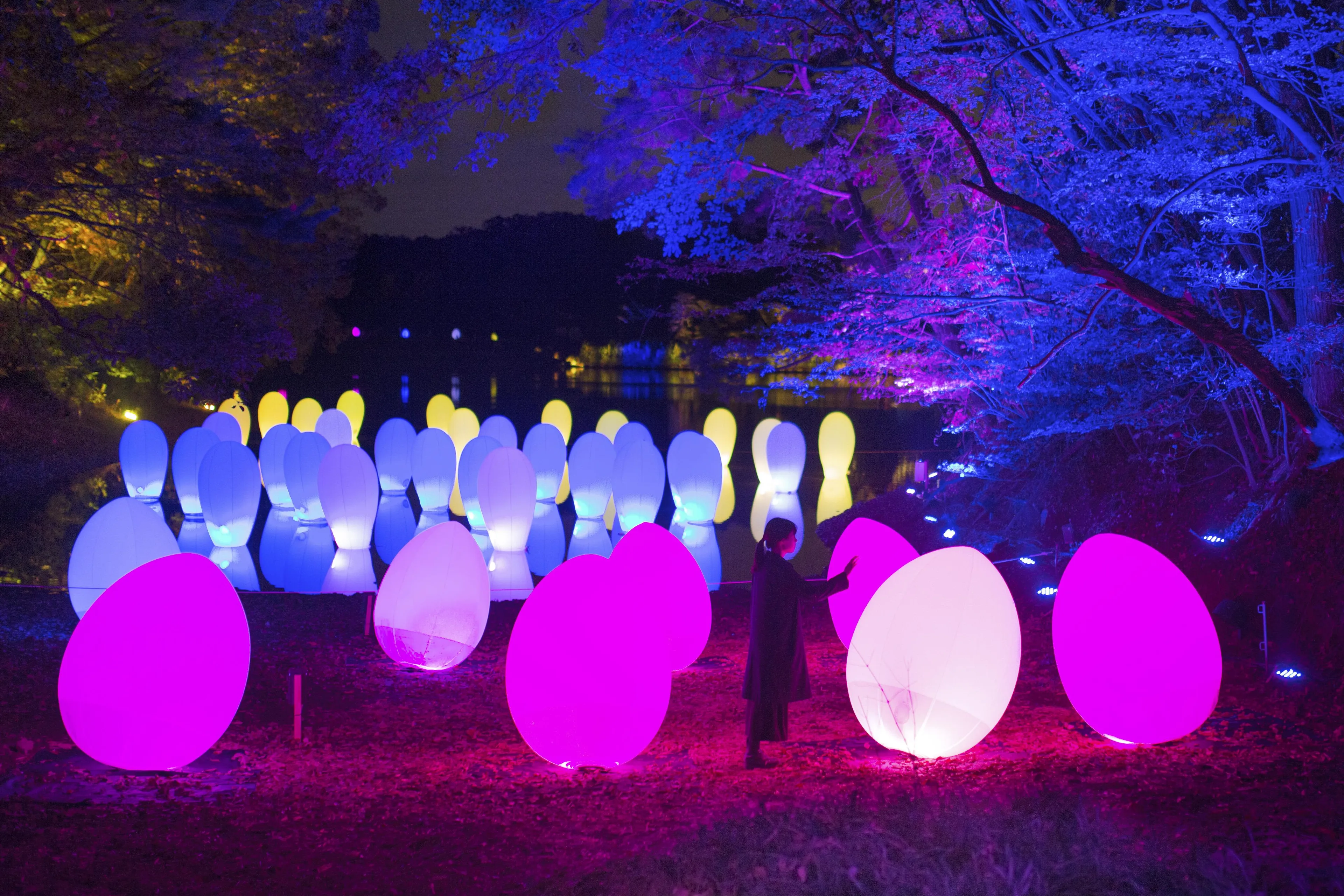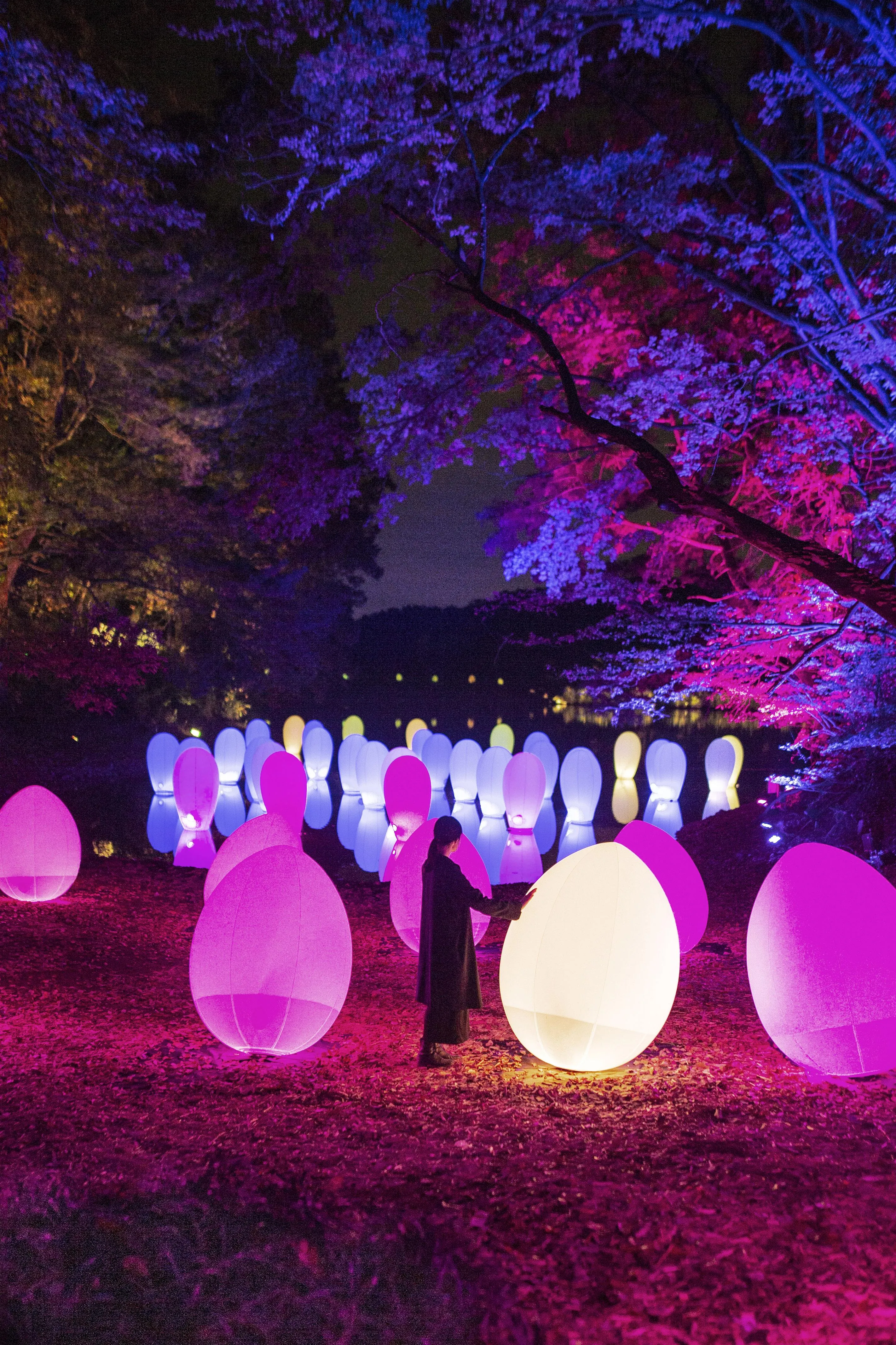When an ovoid of light is blown by the wind and tilts, the color of it’s light changes and it emits a sound tone specific to the color. The light resonates out radially to light objects nearby. The resonating light is transmitted to the next object one after another, spreading the color tone in the same way continuously.