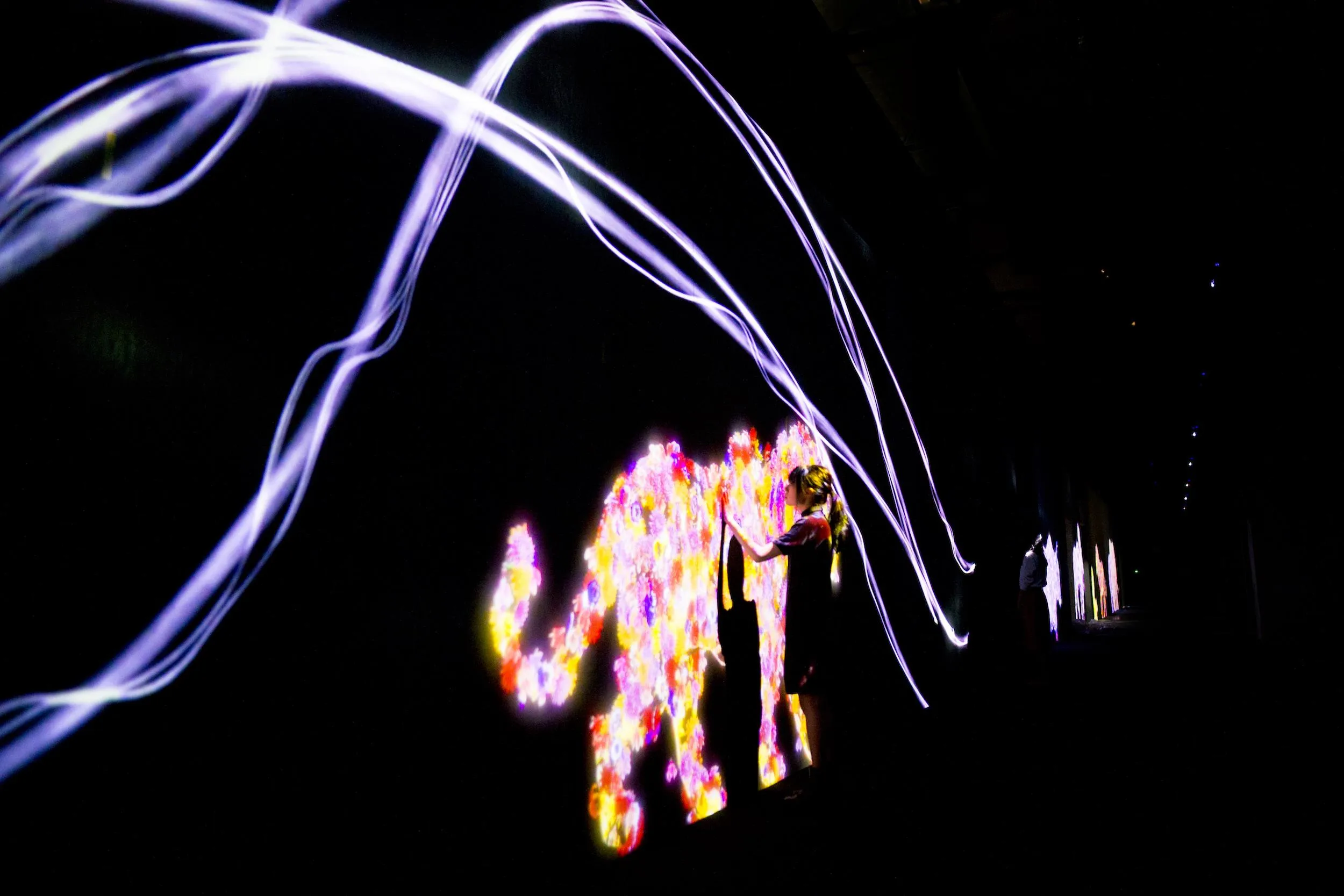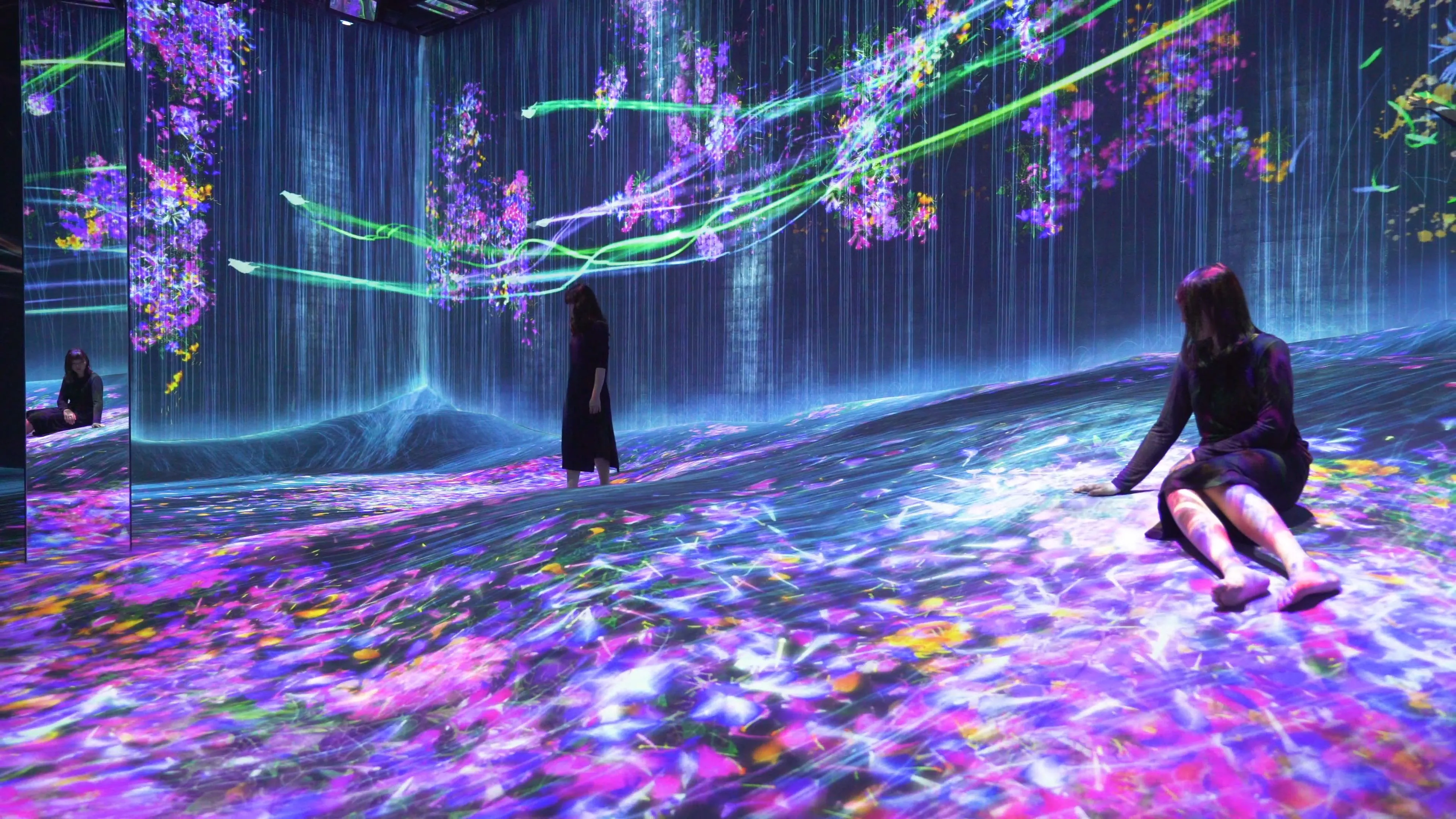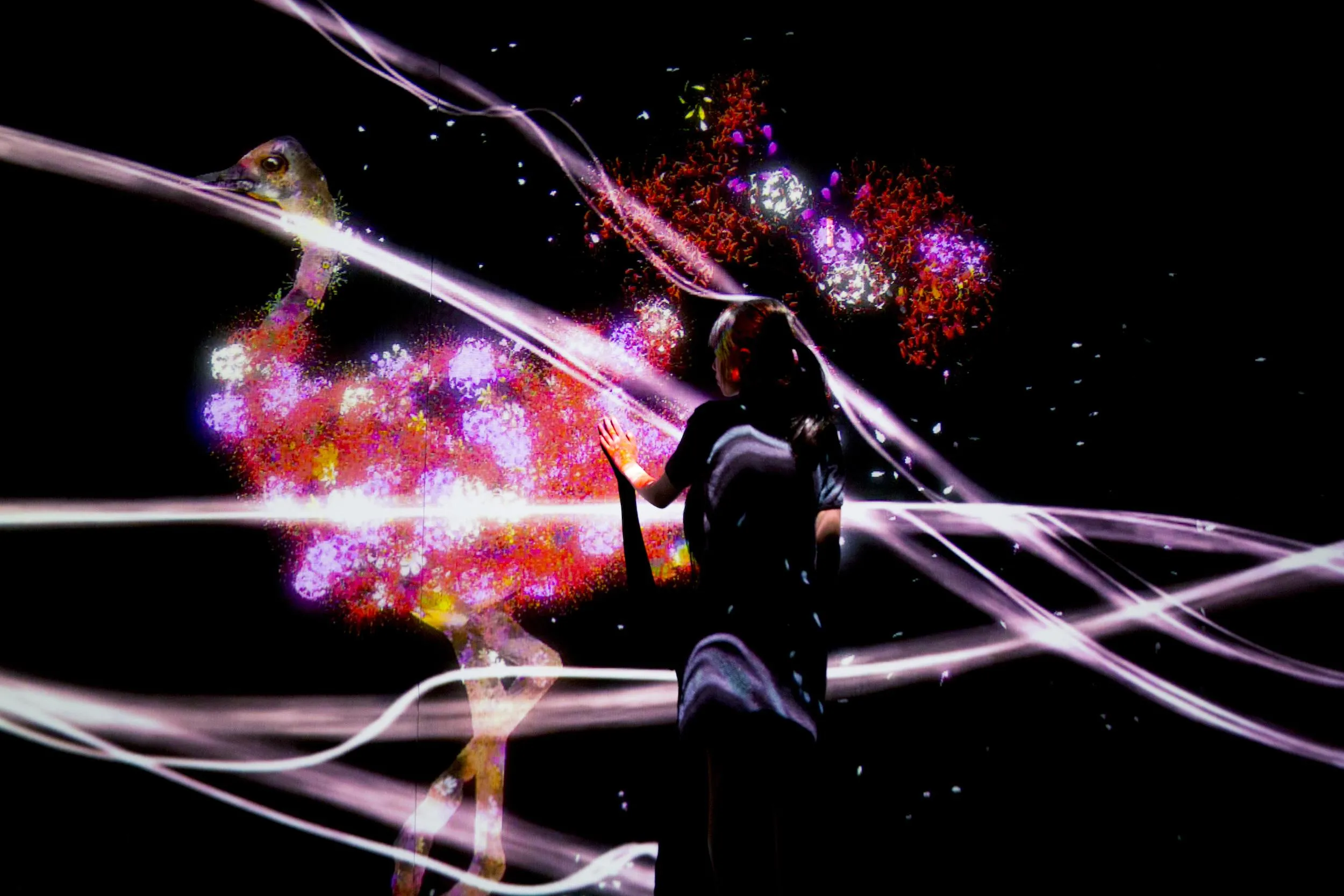 Crows are rendered in light as they fly around the space, leaving trails of light in their paths and creating spatial calligraphy. The crows chase one another and in turn become chased themselves. When the chased crows crash into one another, they scatter, turning into flowers. The crows attempt to fly around people in the space, but when they crash into a viewer, they scatter, turning into flowers in the same way.