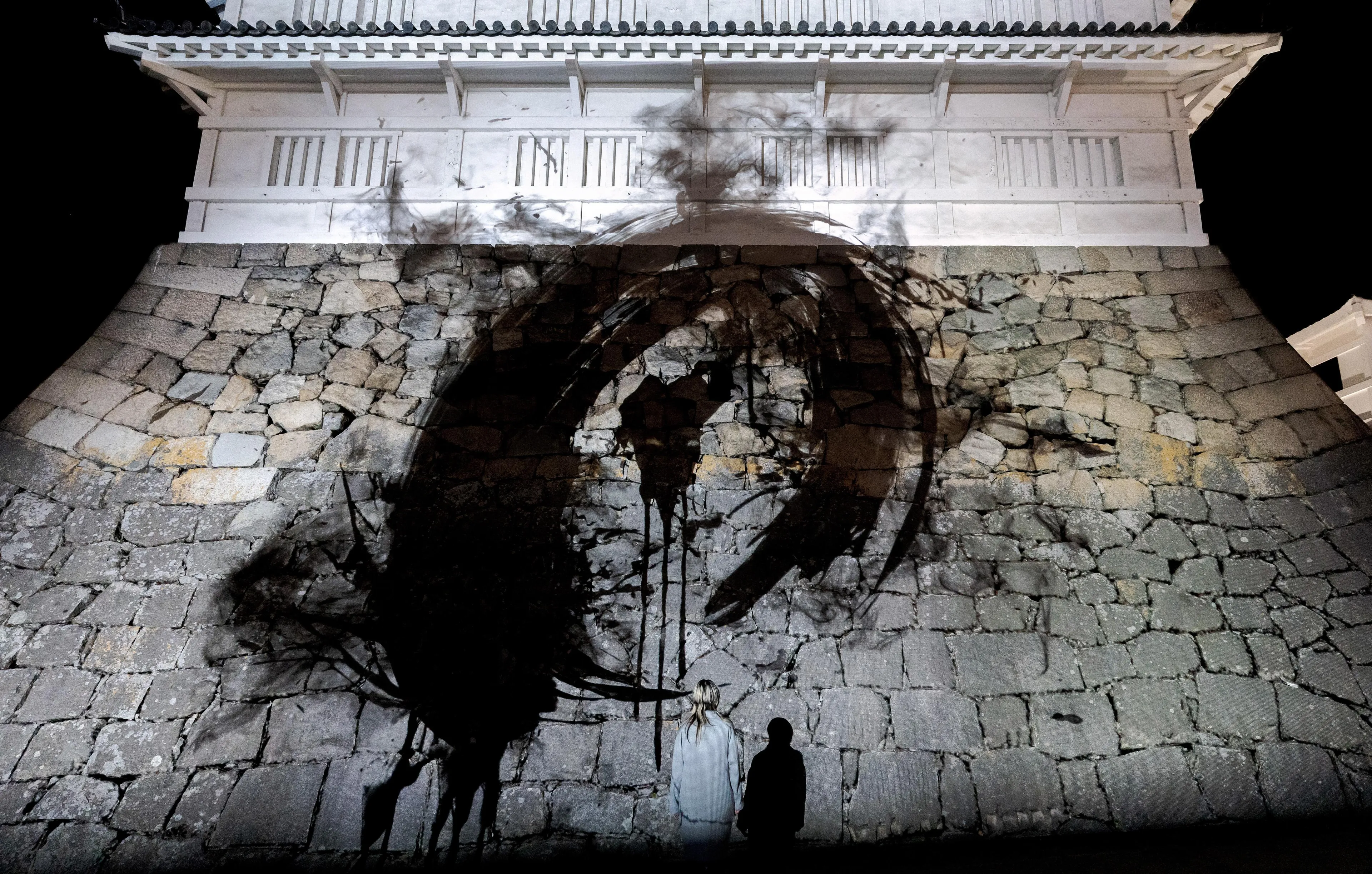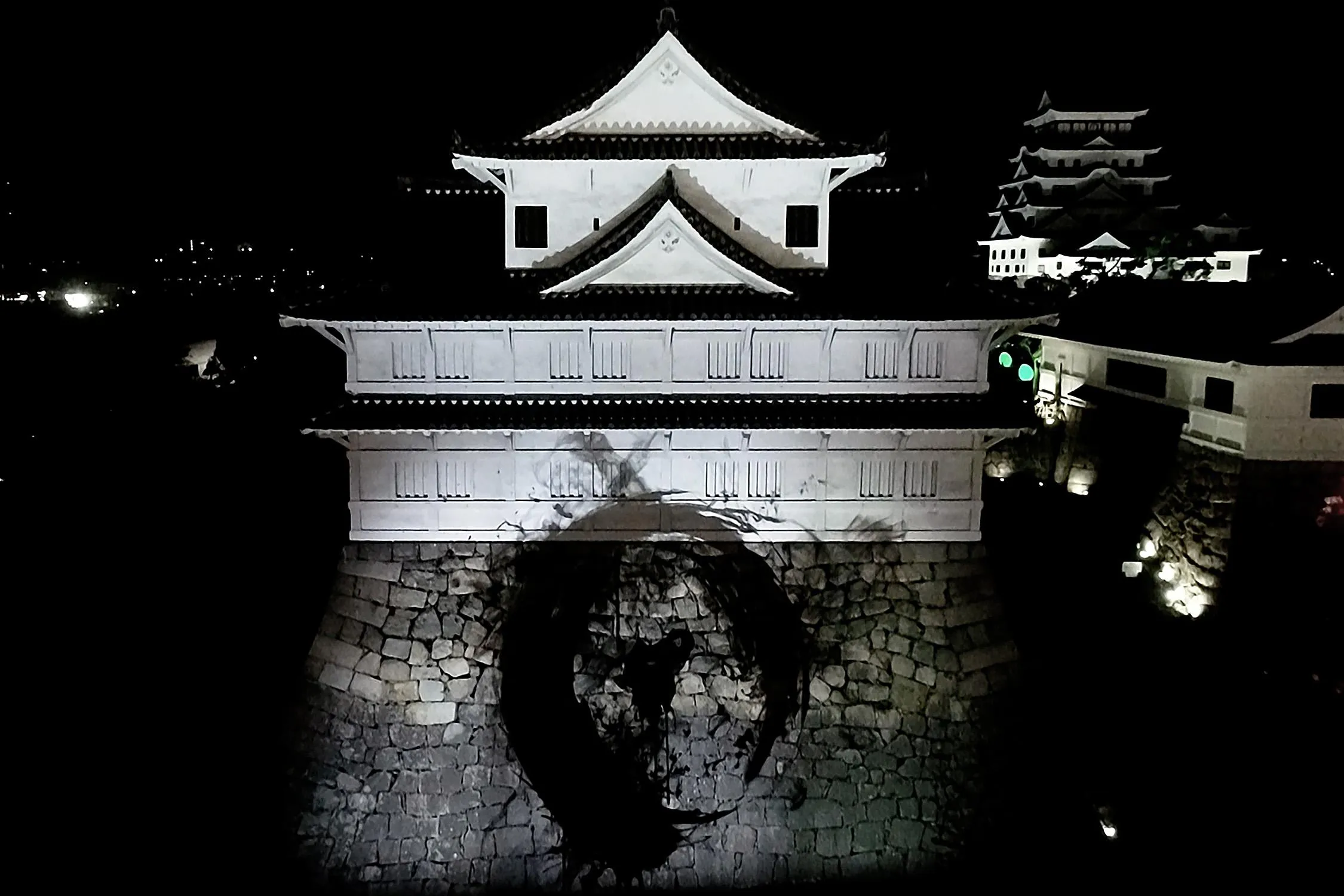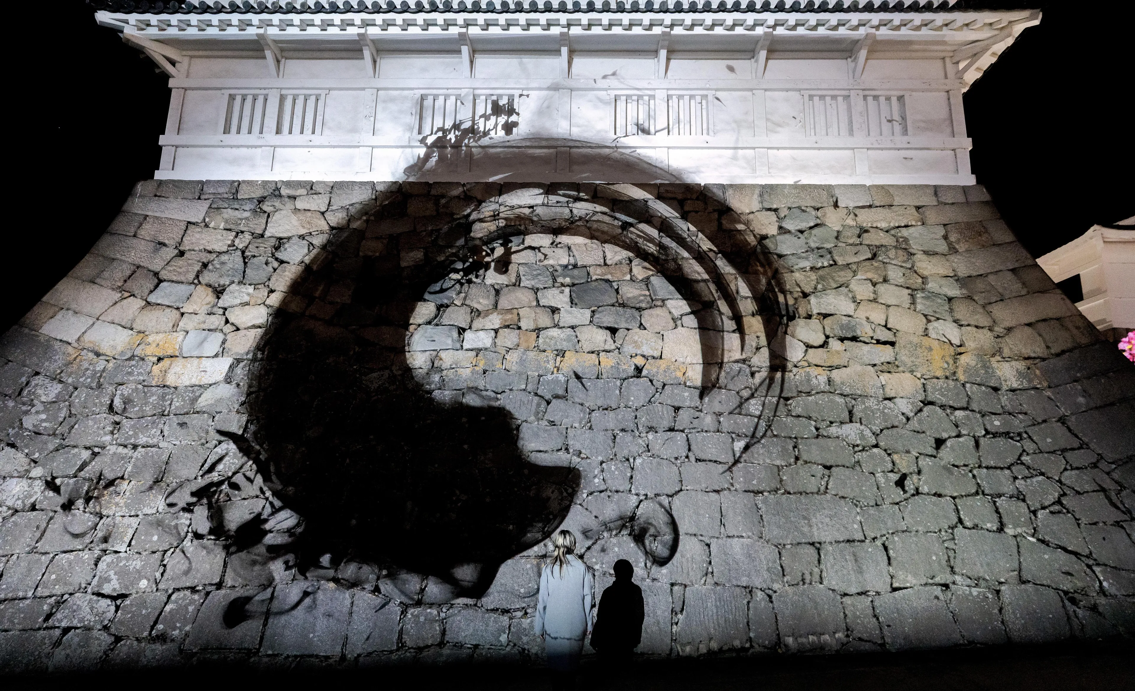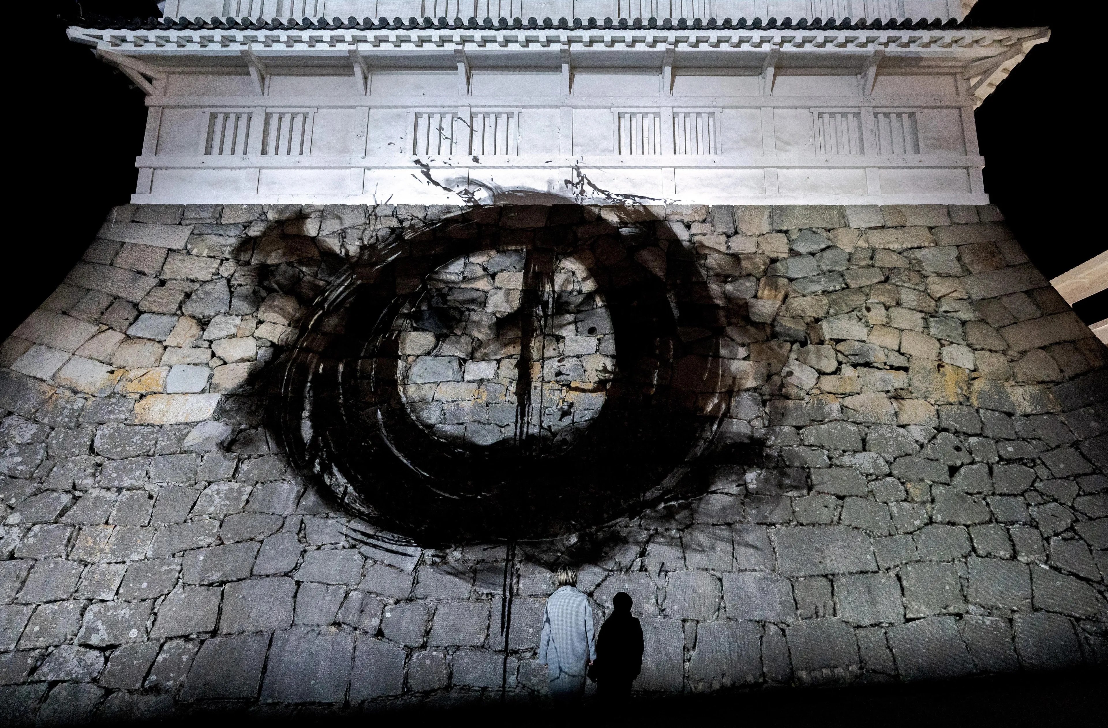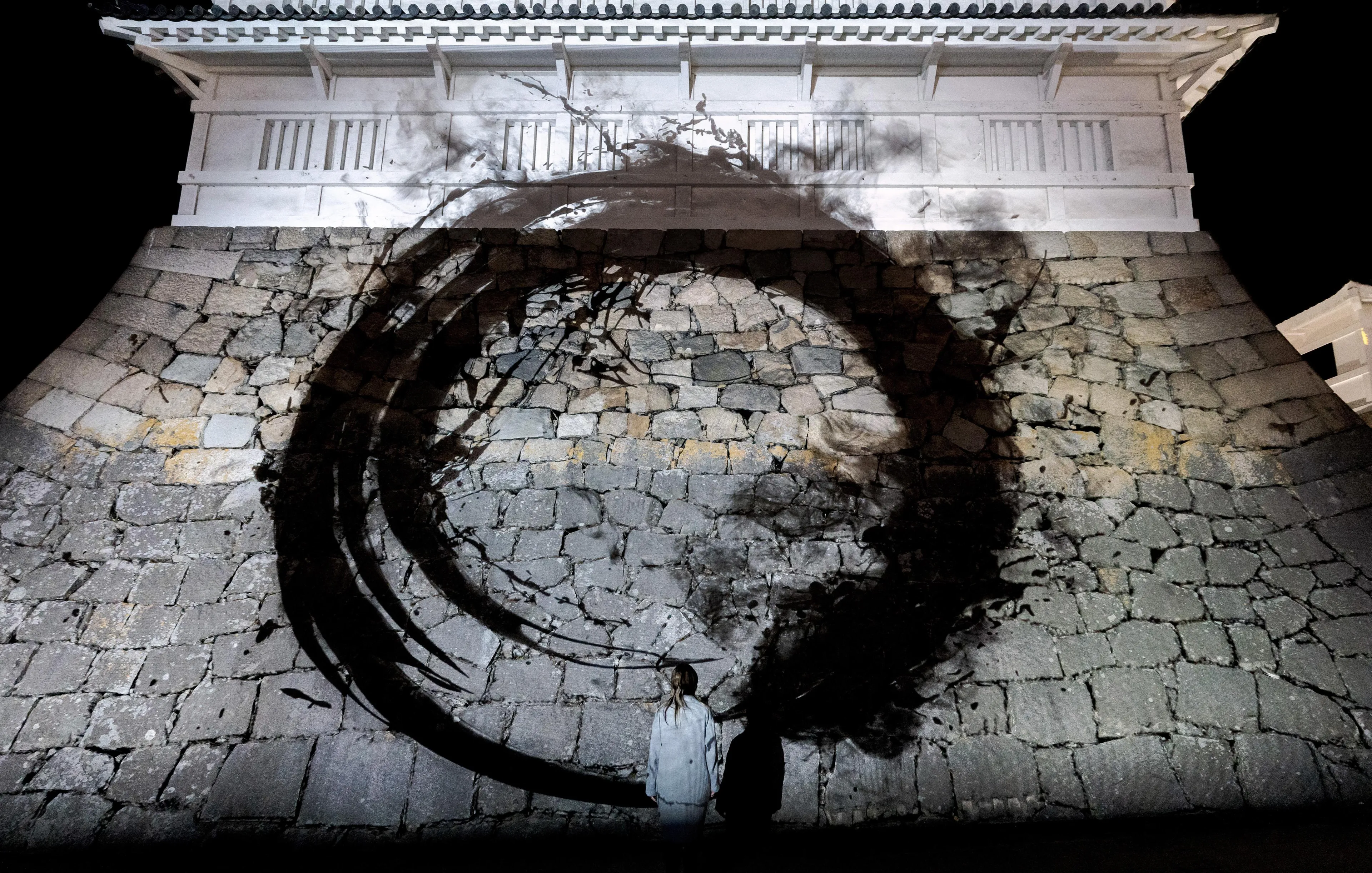 The black lines drawn with light express the absence of light, and cannot be distinguished from the shadows of the stone walls that have been weathered over the past several hundred years. The black calligraphy and the black shadows created by the long passing of time become one, infinitely drawing Enso on the stone walls.