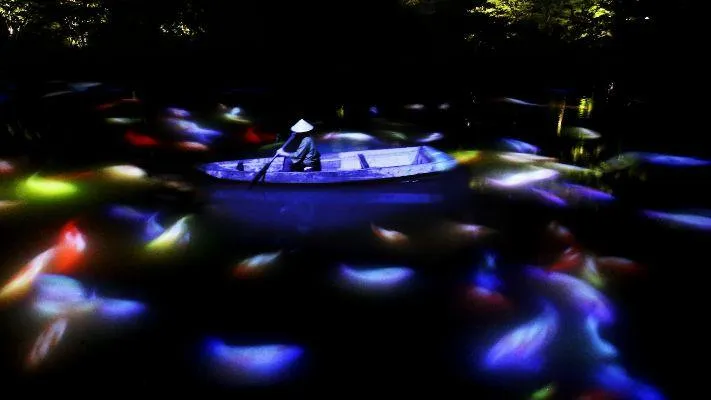 Drawing on the water surface with Lotus Flowers, Created by the Dance of Koi and small boats - Mifuneyama Rakuen Pond