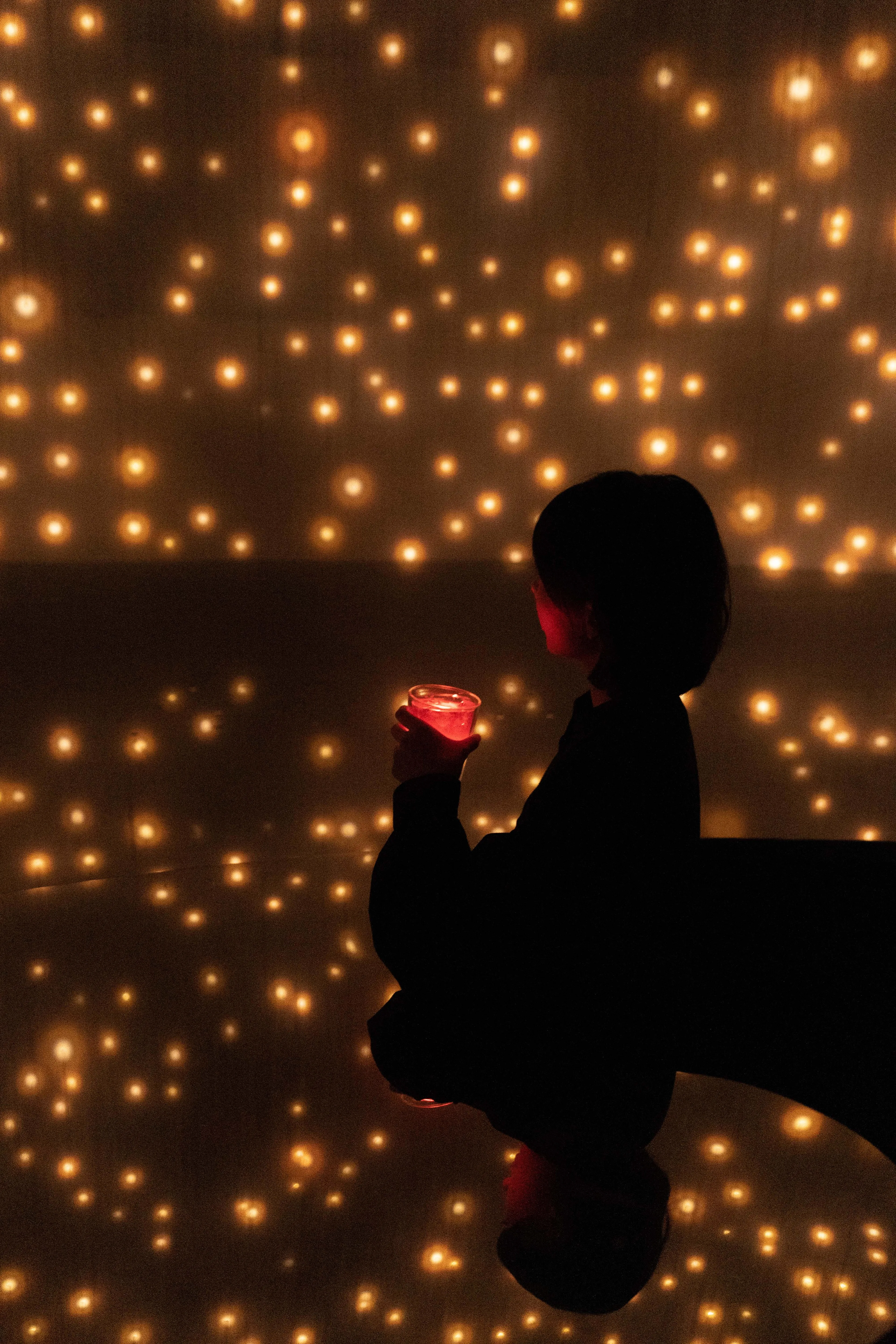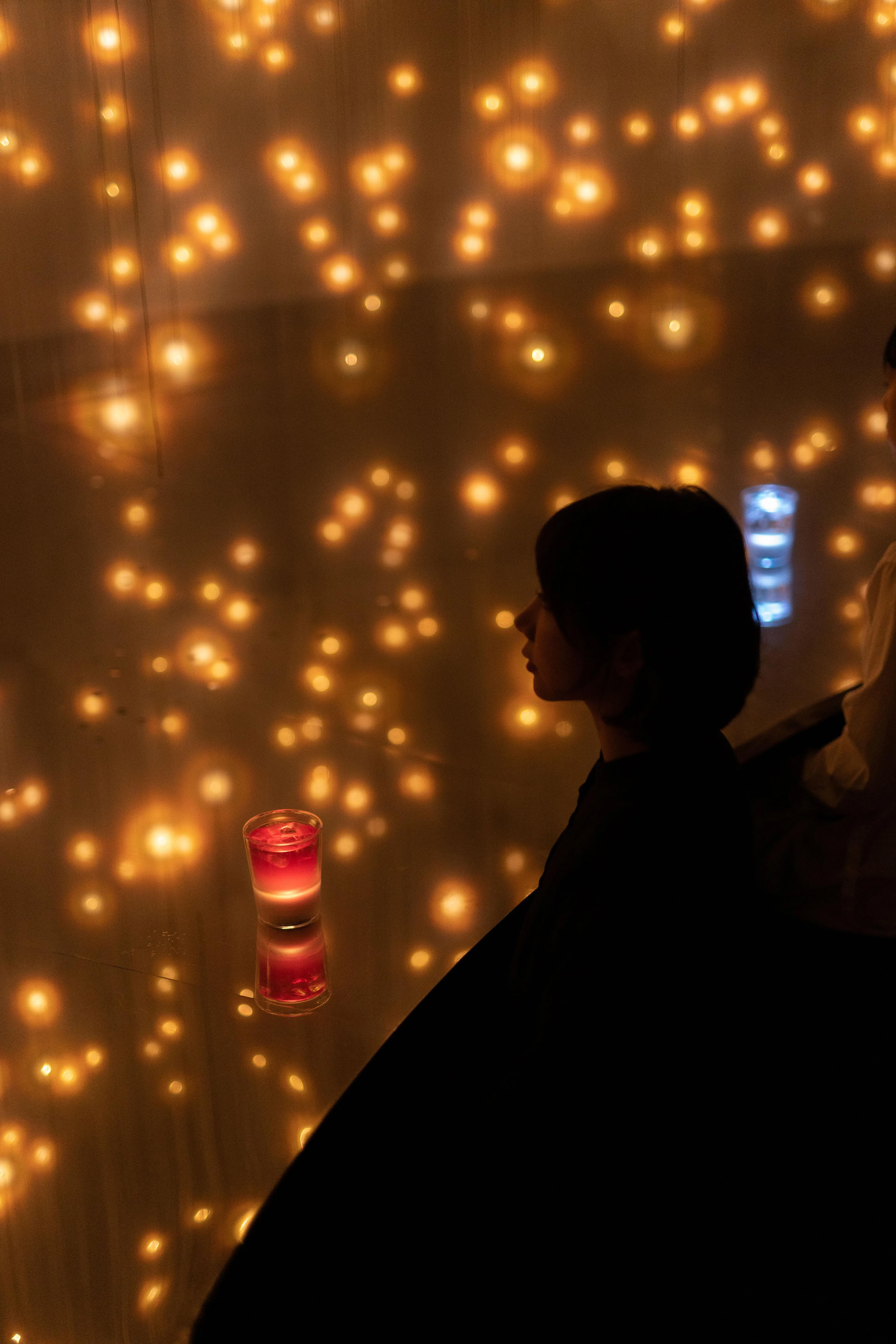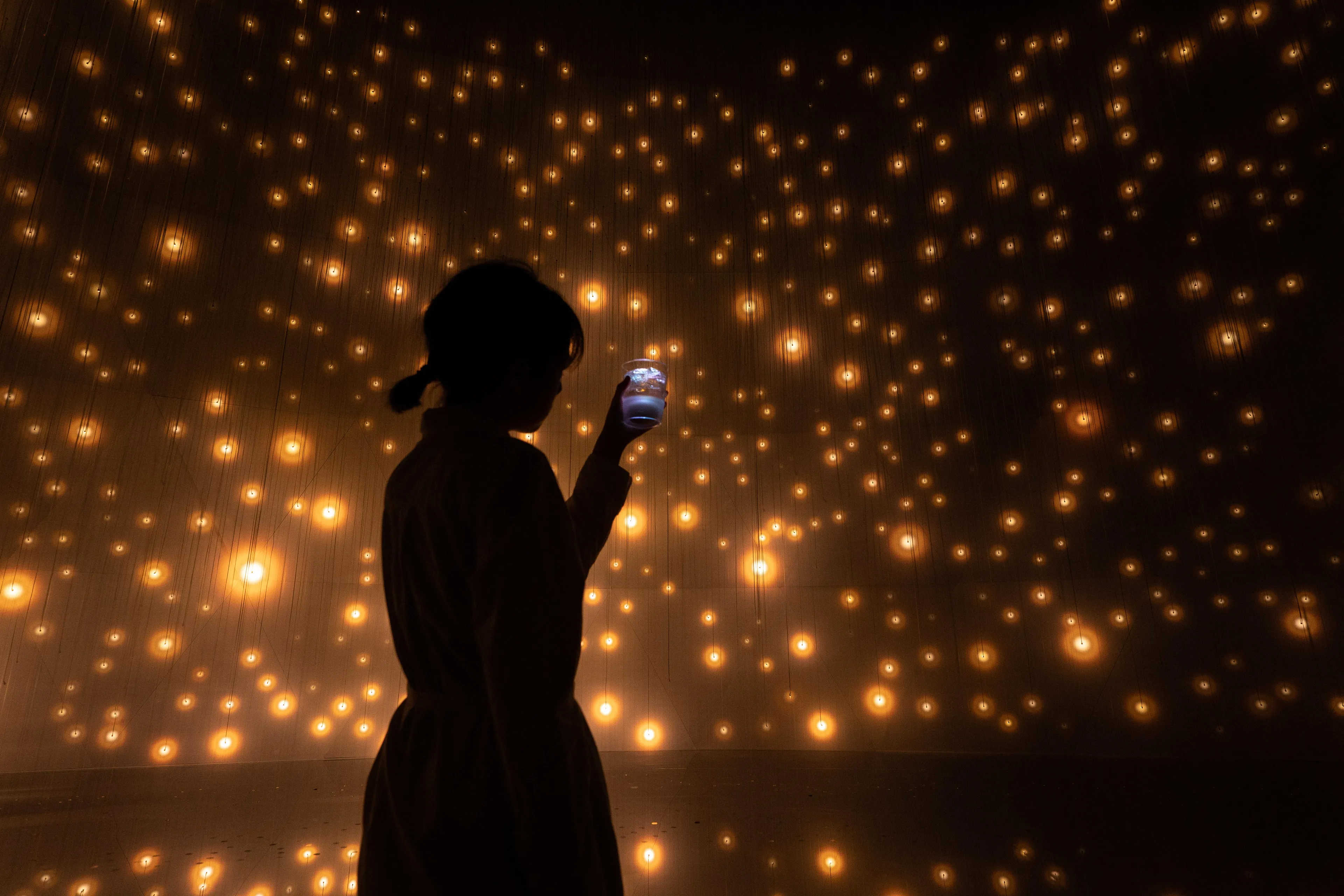 The light color of the tea is Dynamic Equilibrium Color, a new color concept by teamLab. When a person sees the tea in the cup from a distance, taking in its entirety, the color of the light does not appear to change; but when they look closely, observing the miniscule, the color of the light is actually continuously changing, and creating a new sense of time.