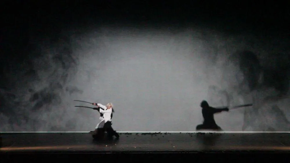 A Sword Battle unfolds between Taichi Saotome and his own shadow. Taichi Saotome expertly matches his performance with an amazing shadow video animation.