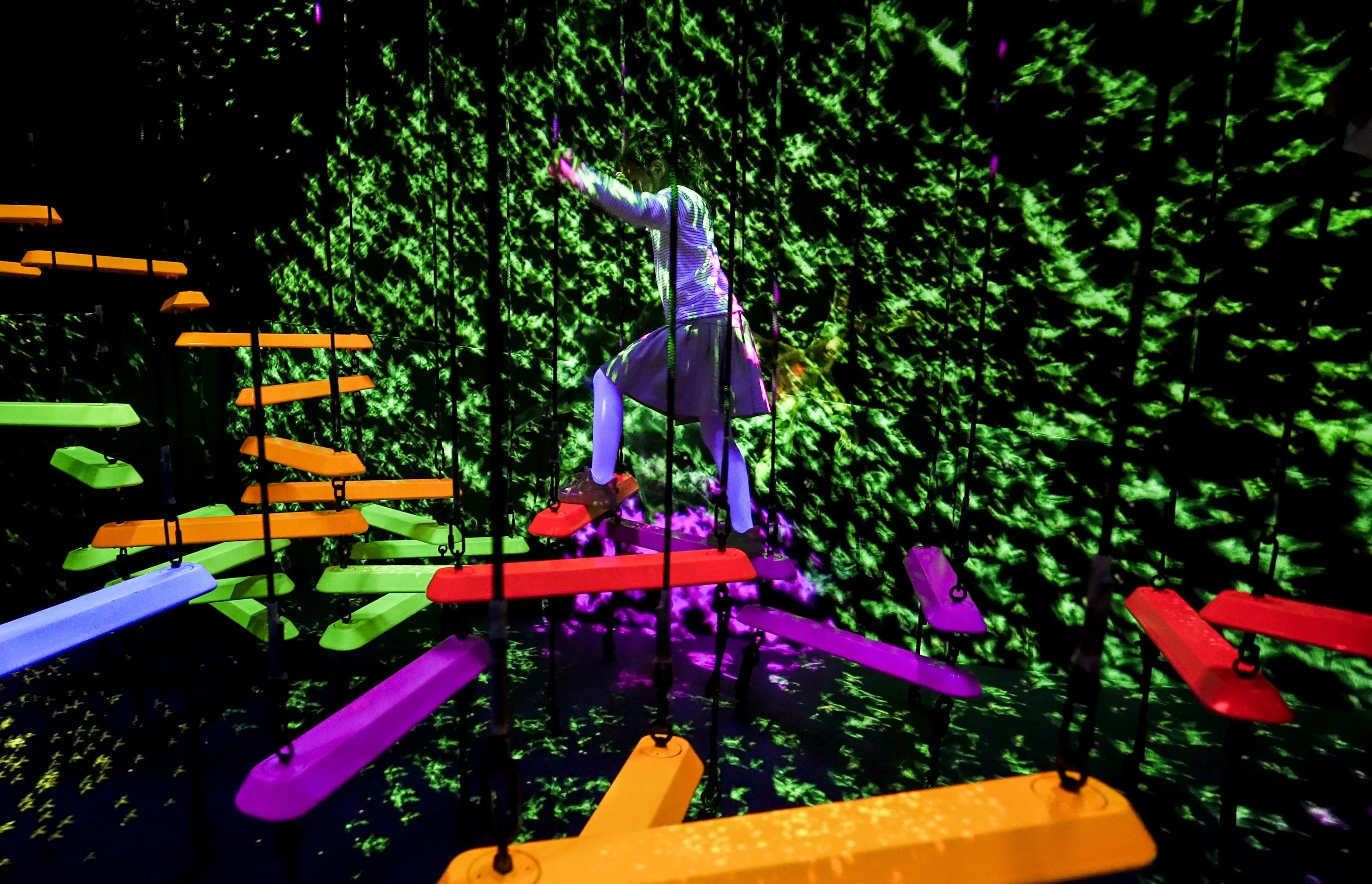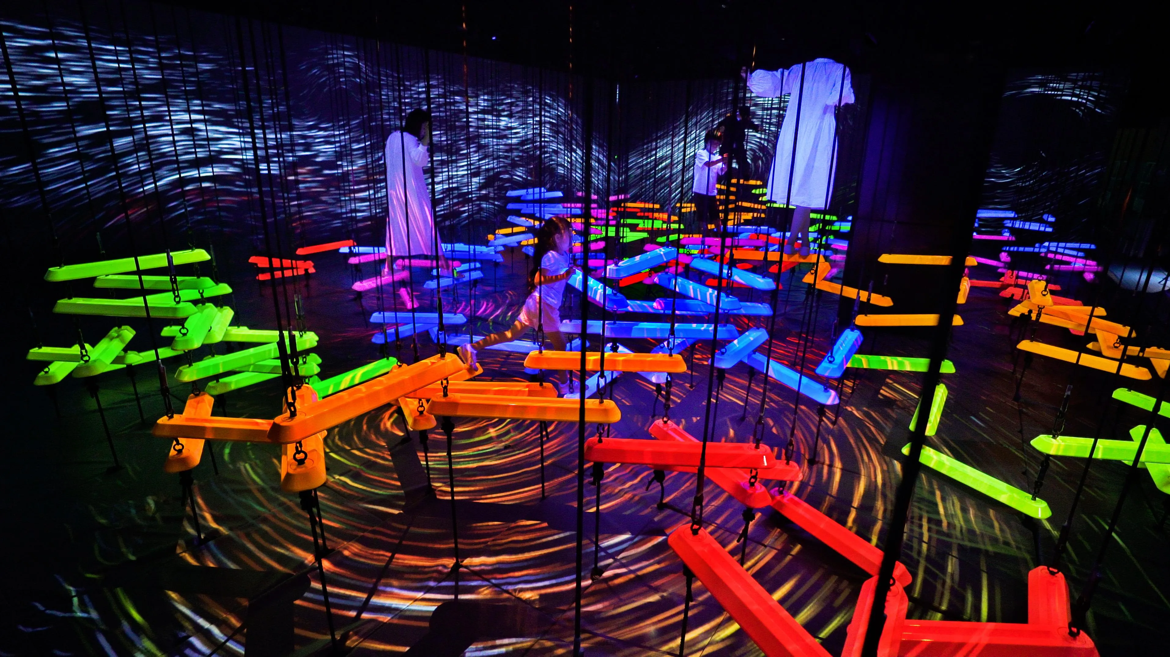 Aerial Climbing is a space where bars are suspended by ropes and float three-dimensionally in the air. When a person climbs on one of the bars, it affects the other bars because they are connected to each other. When a person crosses the bars, they affect the space.