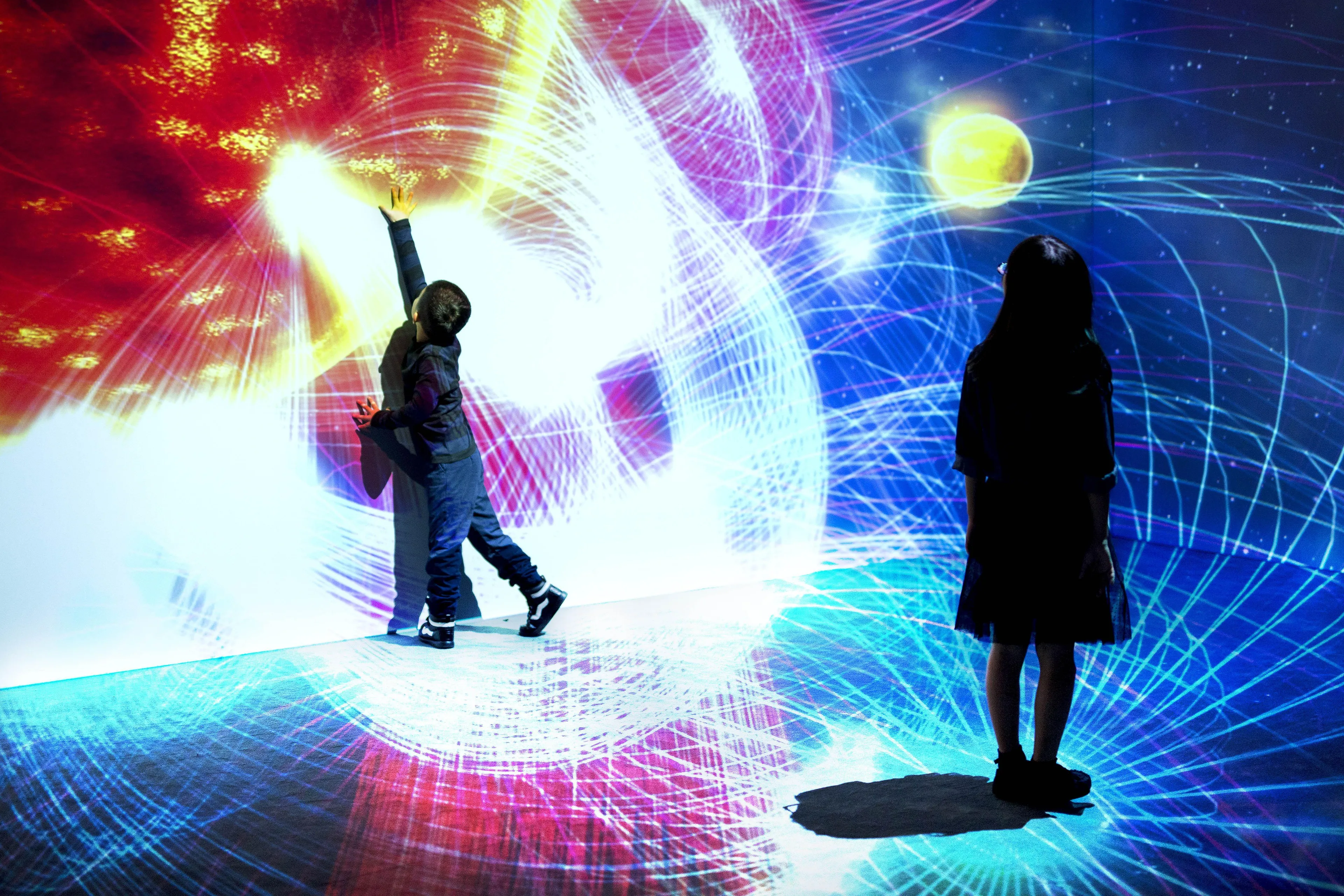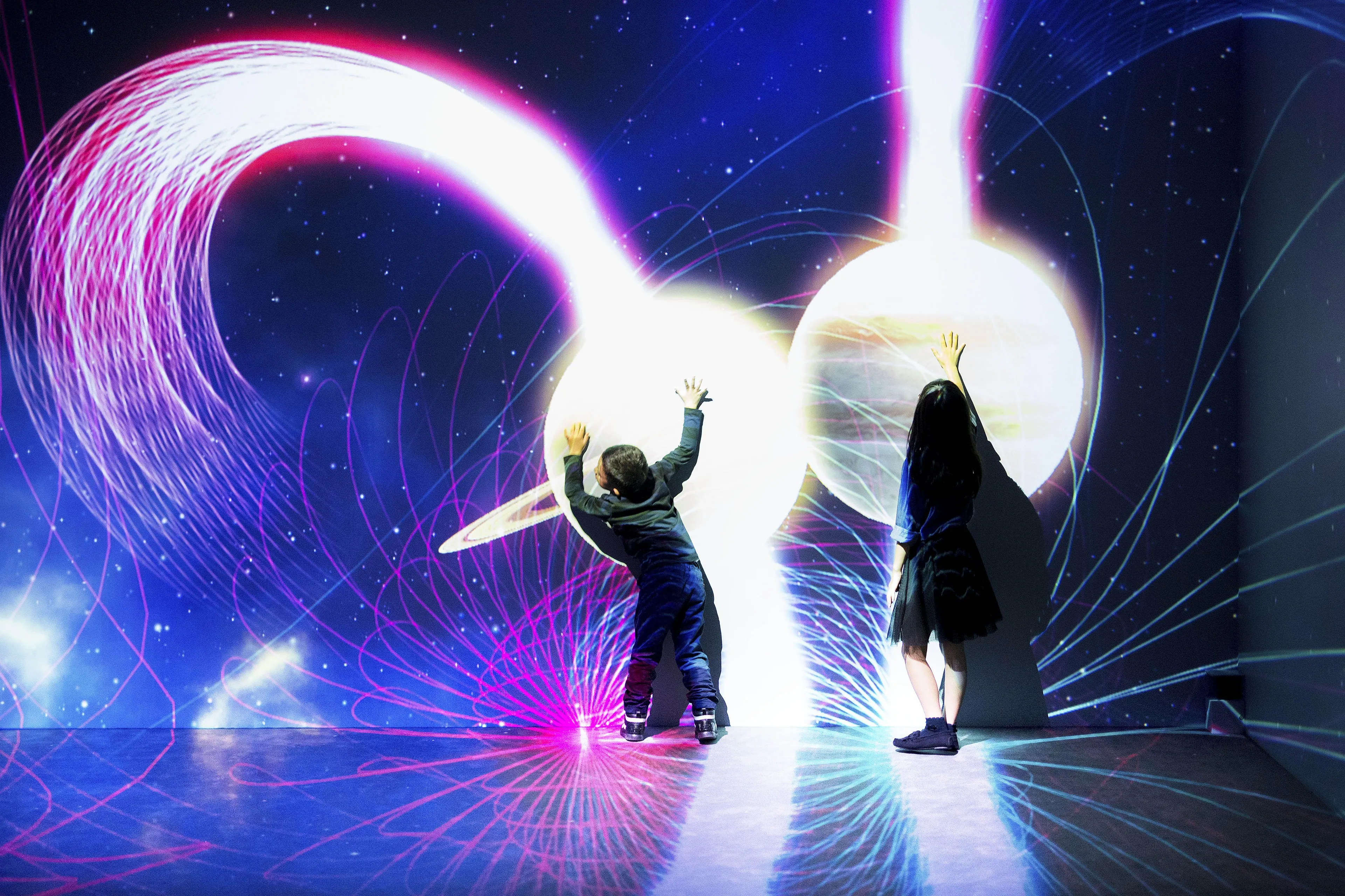 The artwork is divided into three worlds: Space, Earth, and Electrons. When viewers touch the projected floating objects (earth, planets, aurora, and free electrons), they are taken to that world.
