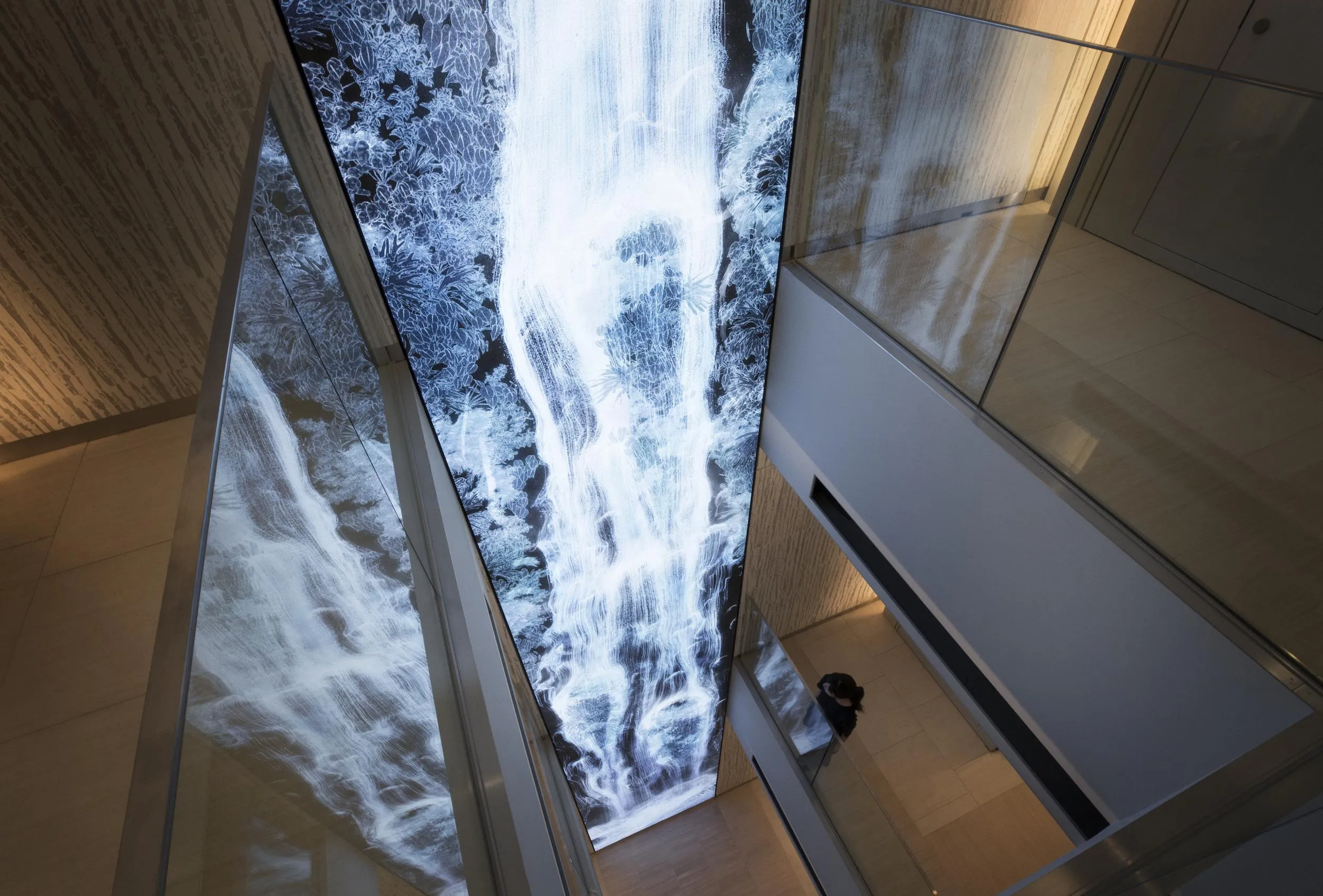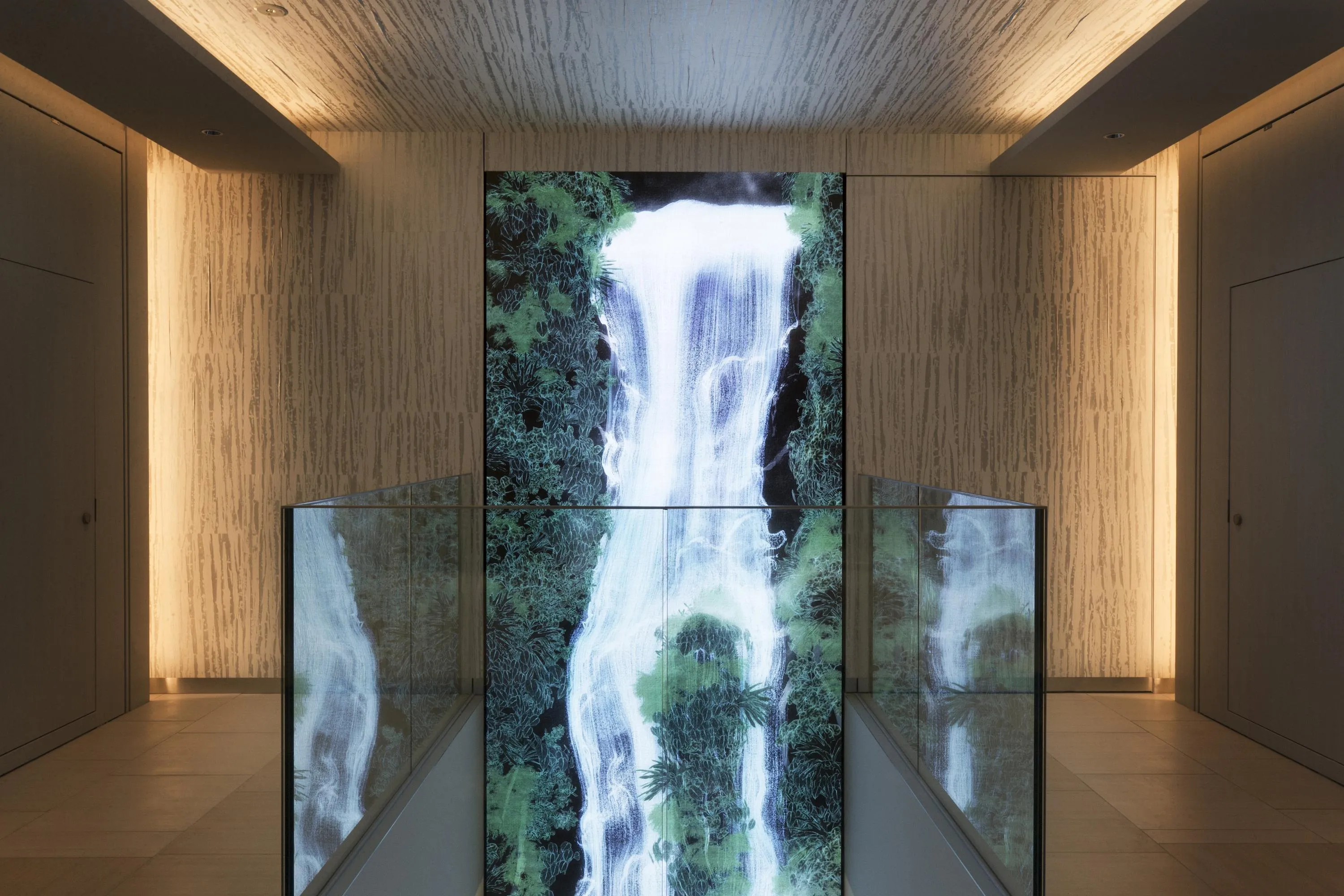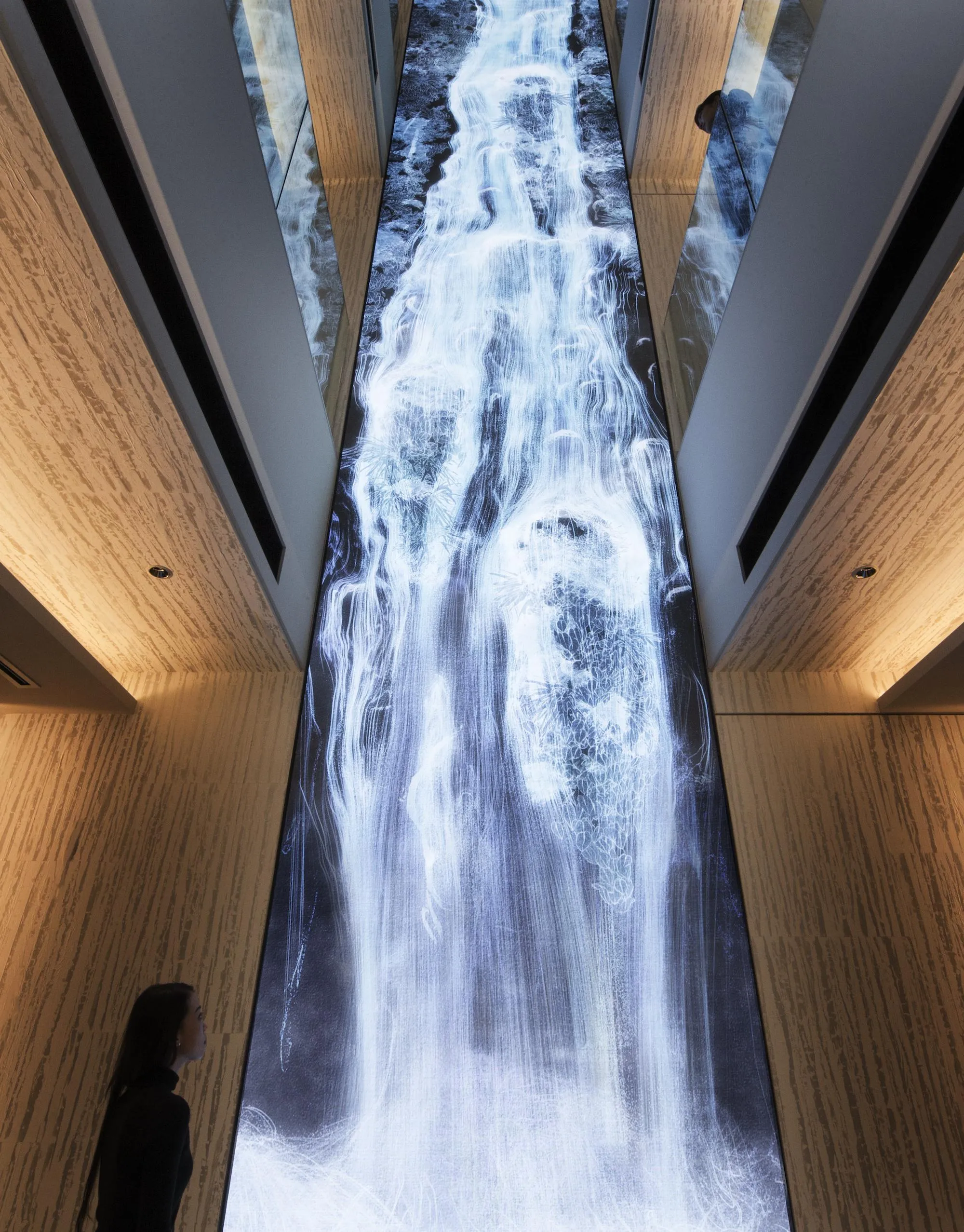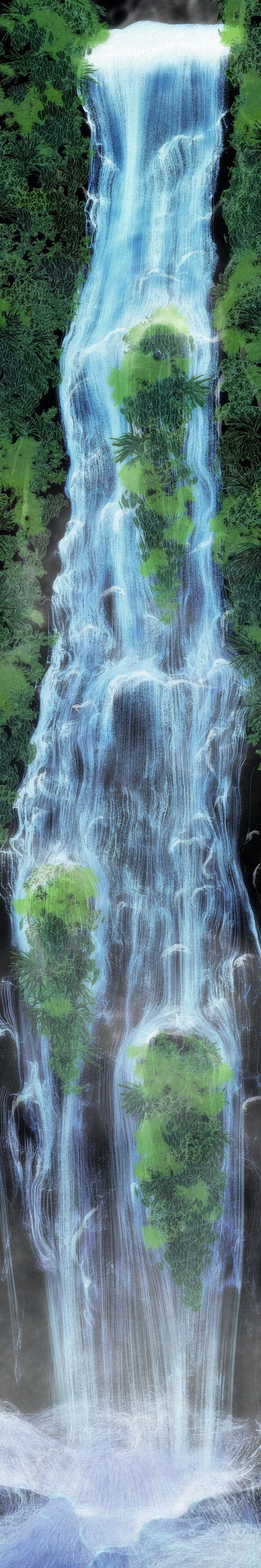Universe of Water Particles is a virtual waterfall created in a virtual 3-D space using teamLab’s concept of ultrasubjective space, a term that refers to the depiction of space found in premodern Japanese painting.