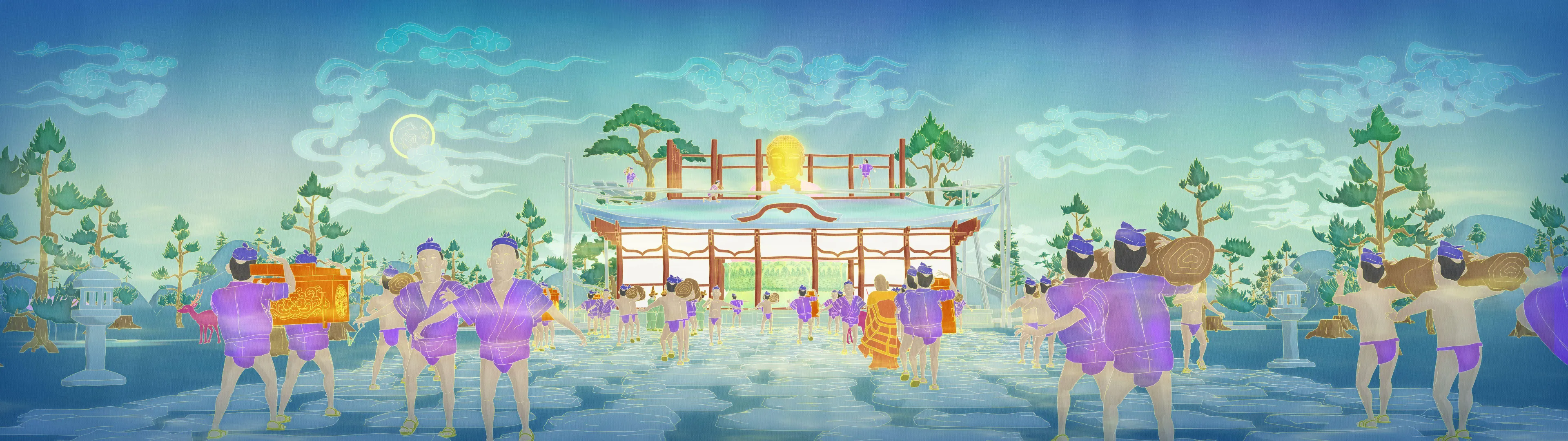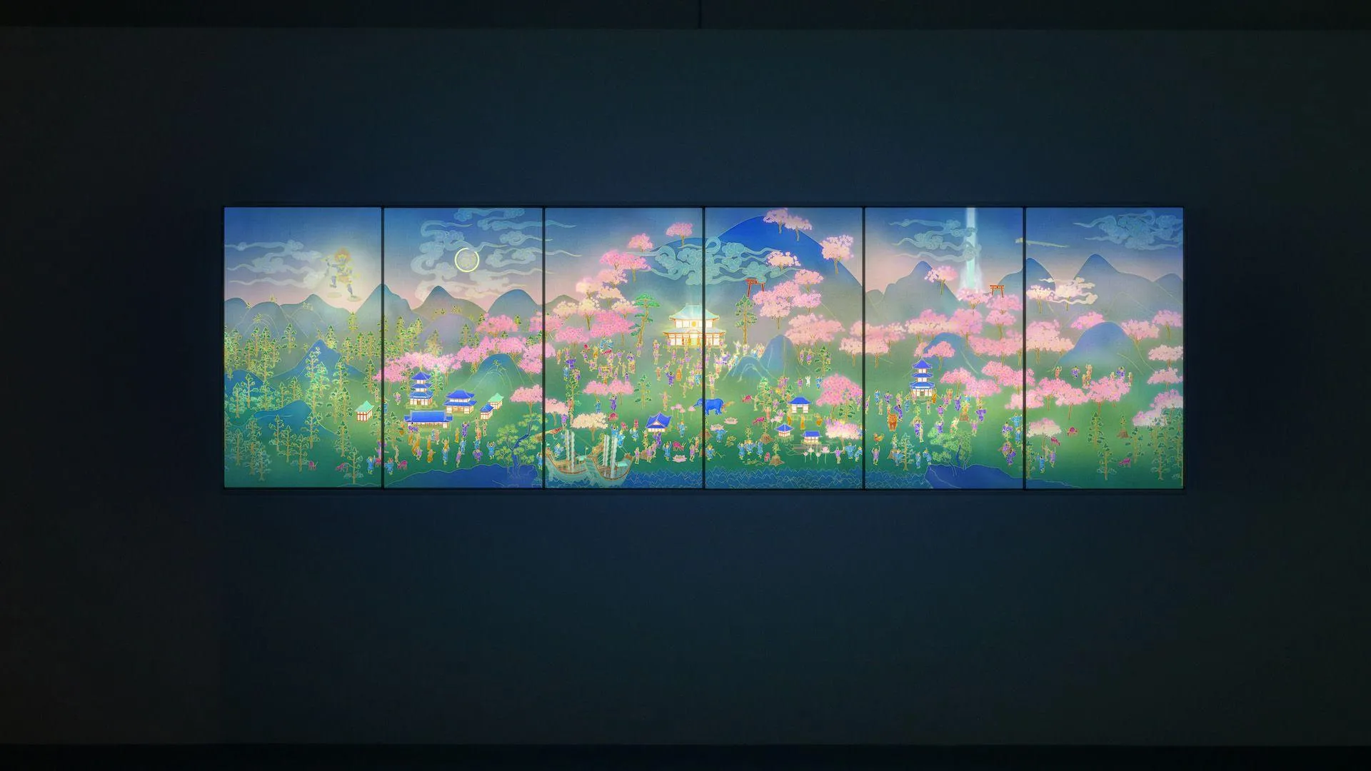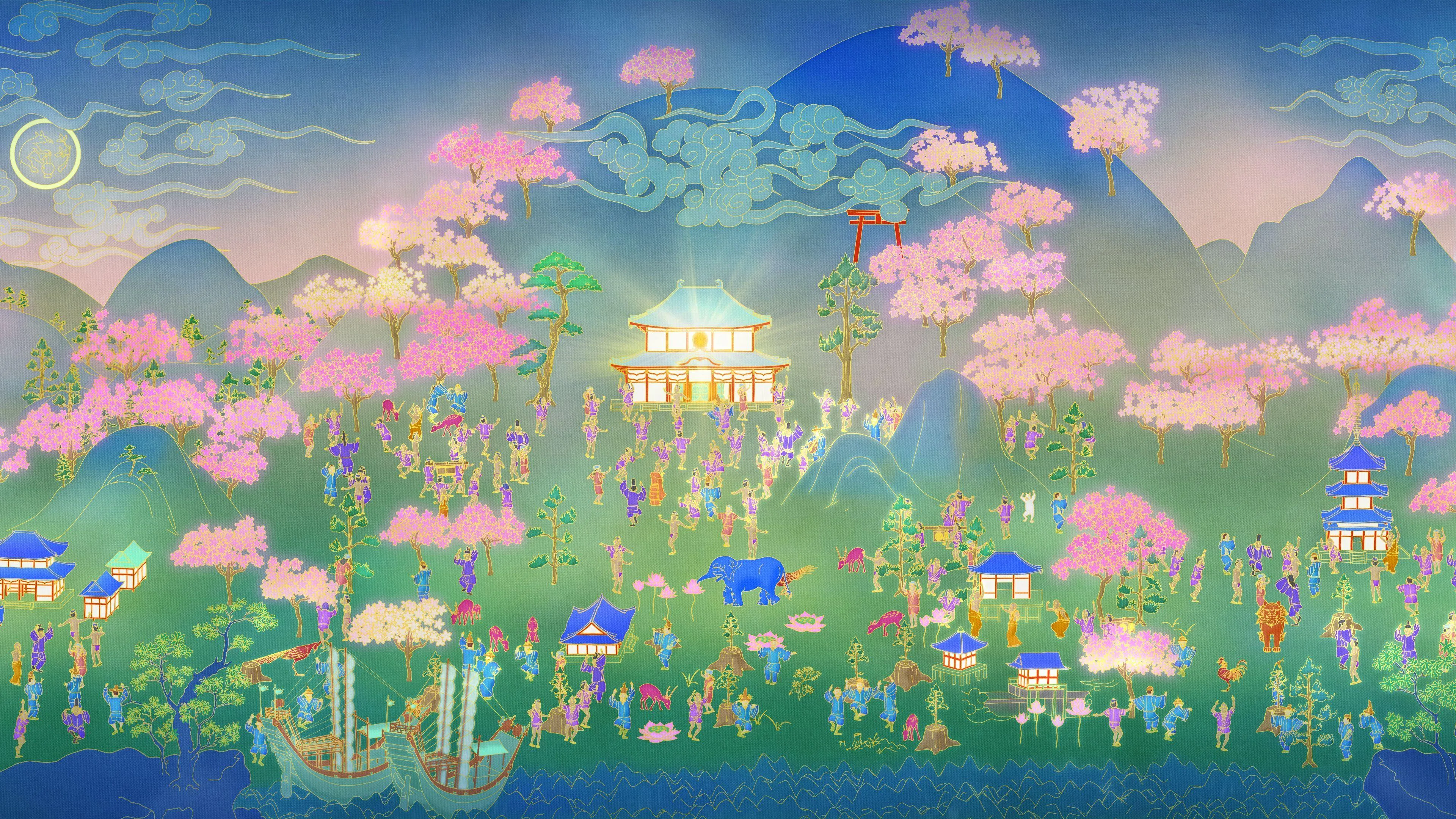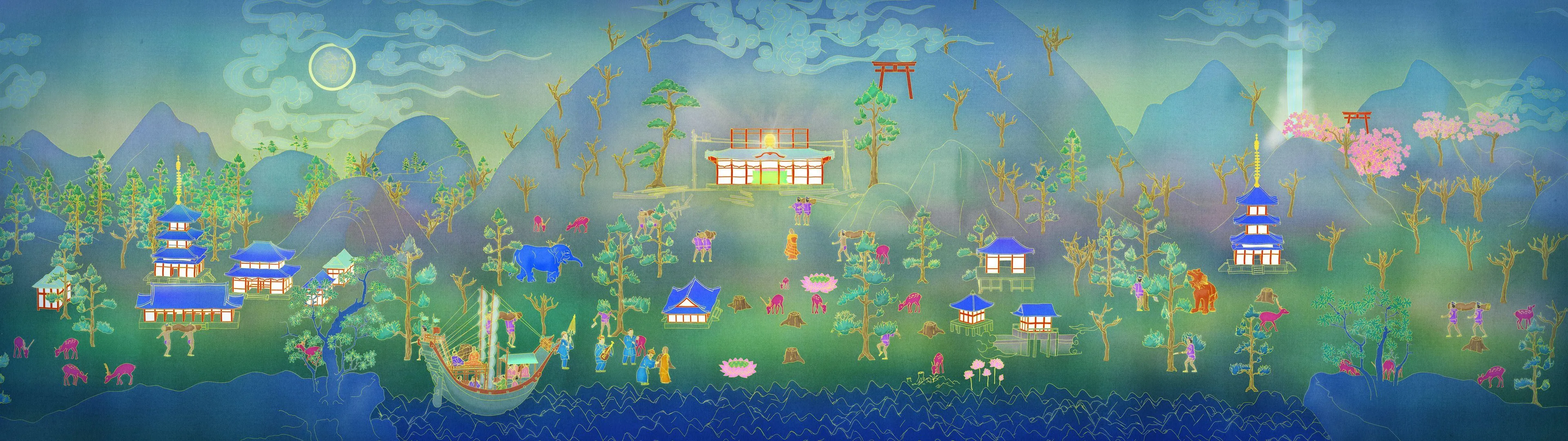 As a new capital city is being built, various people make appearances and their stories unfold in parallel in this picture scroll. The landscape of the city under construction is created on a computer in three-dimensions, in a three-dimensional space. The work comes to life as our viewpoint travels around the landscape. The lines of the work are expressed as Kirigane, an artistic technique which consists of cutting gold or silver leaf into fine lines and adhering them to the surface.