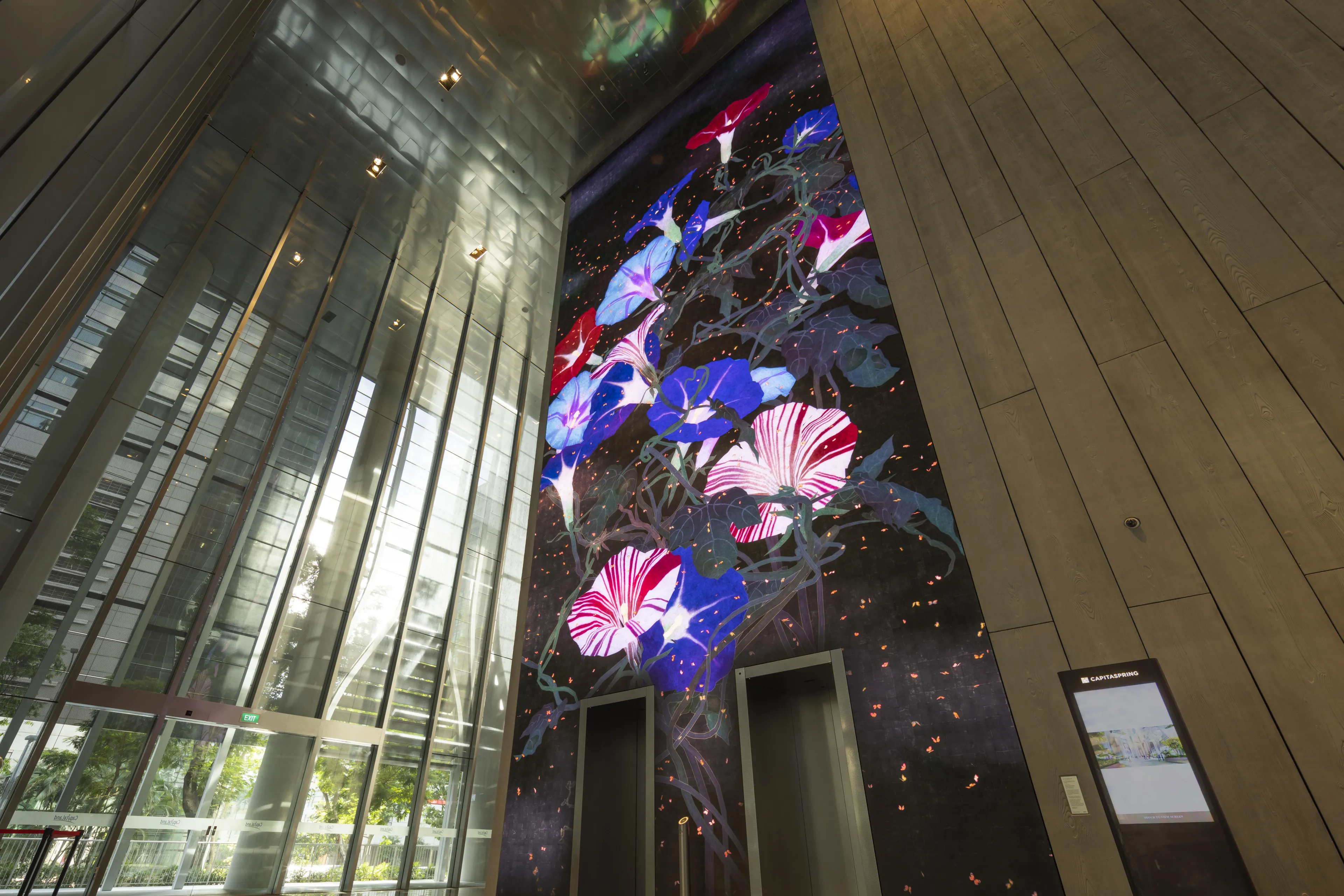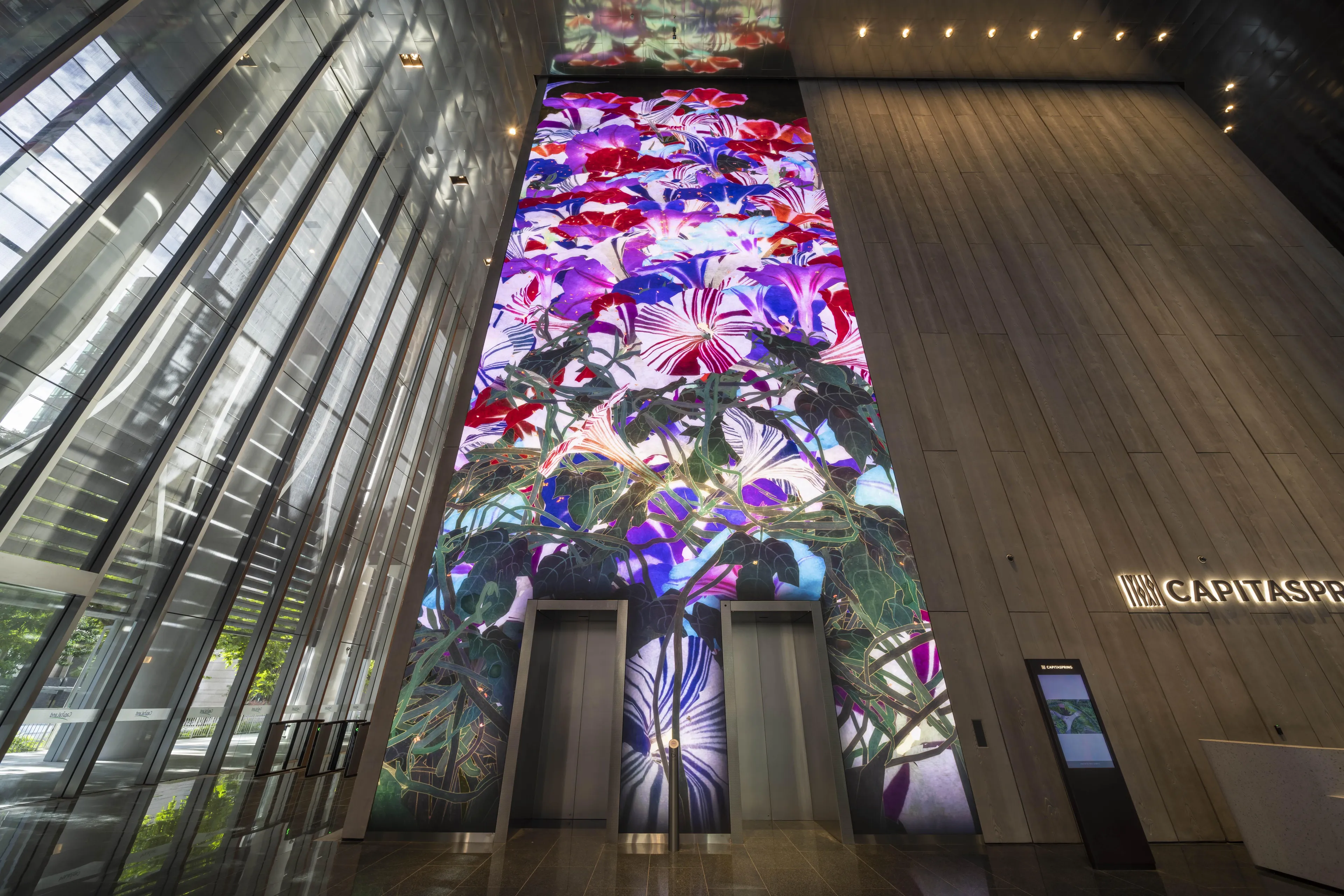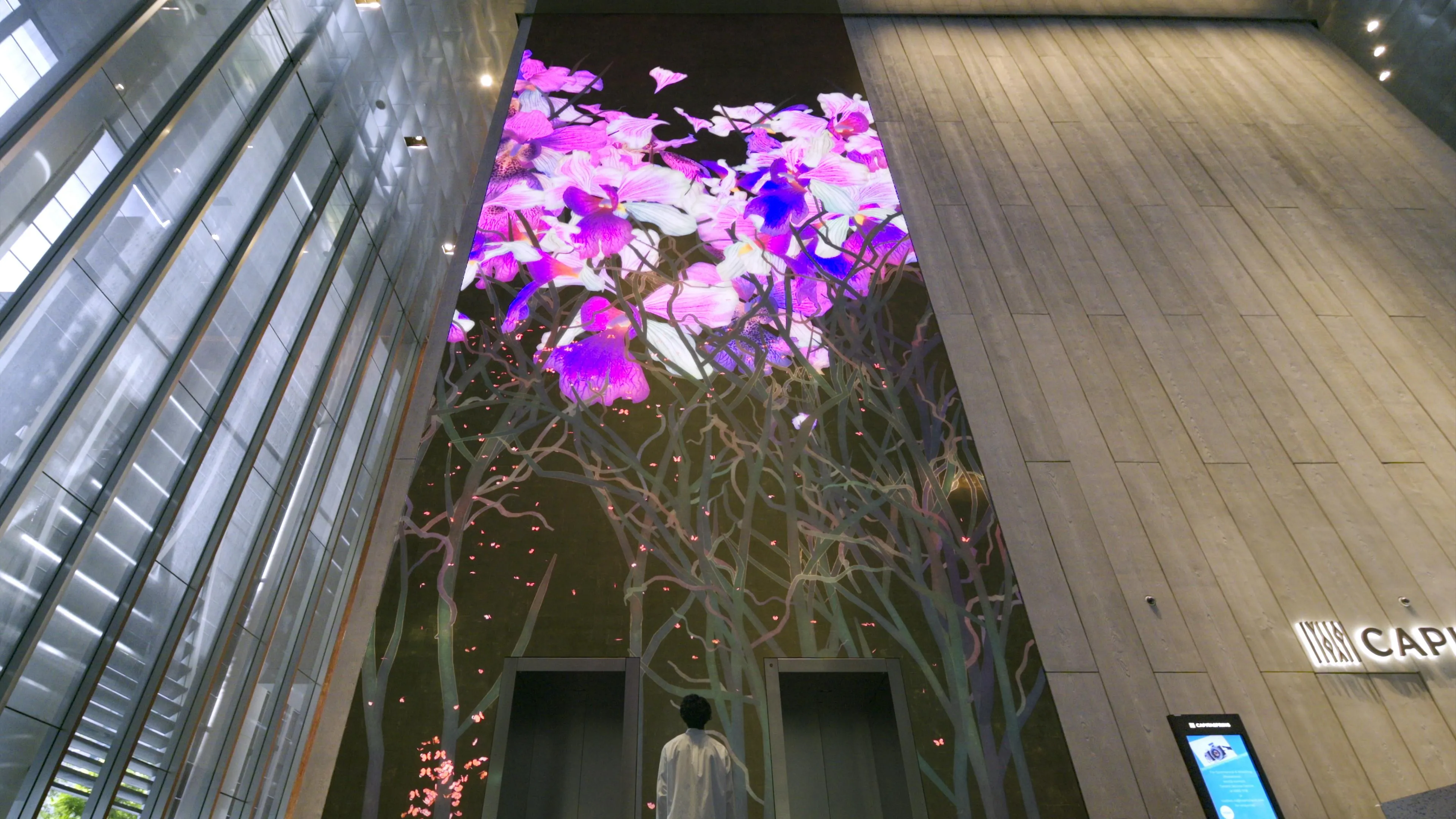 teamLab, 2022, Interactive Digital Installation, W7500 mm H17925 mm , Sound: Hideaki Takahashi