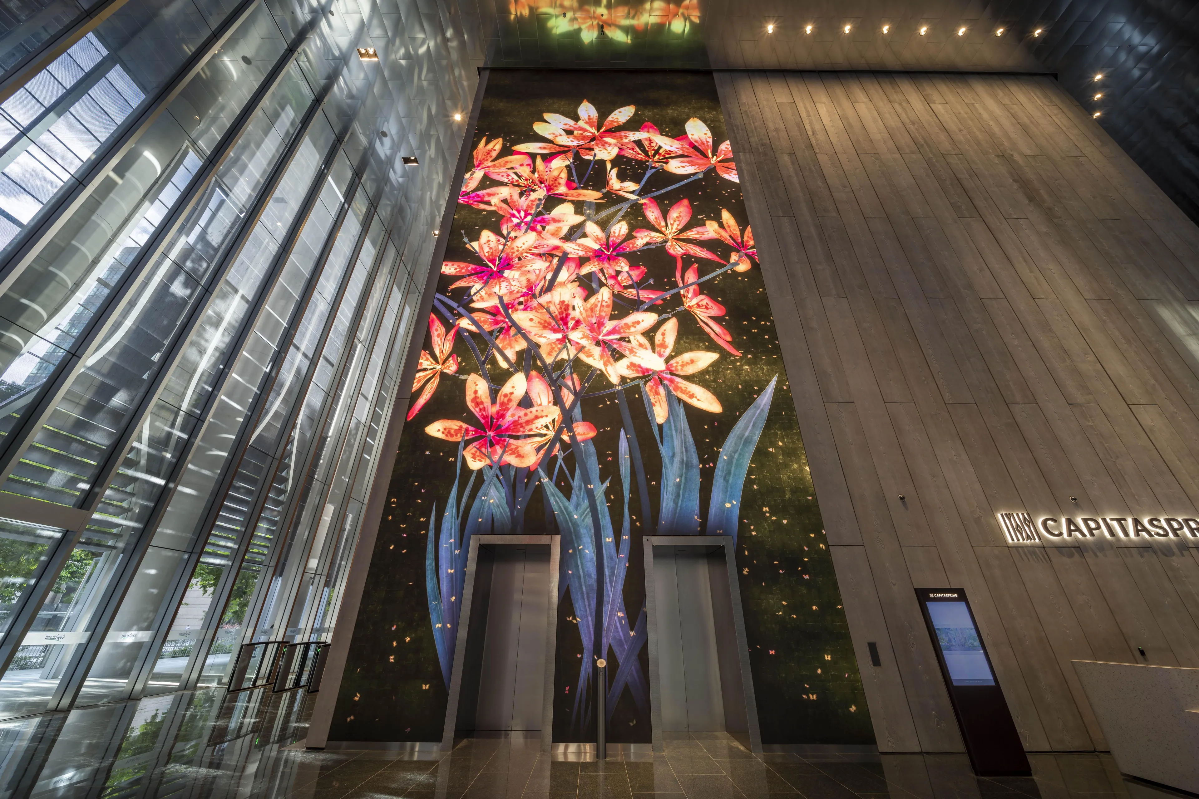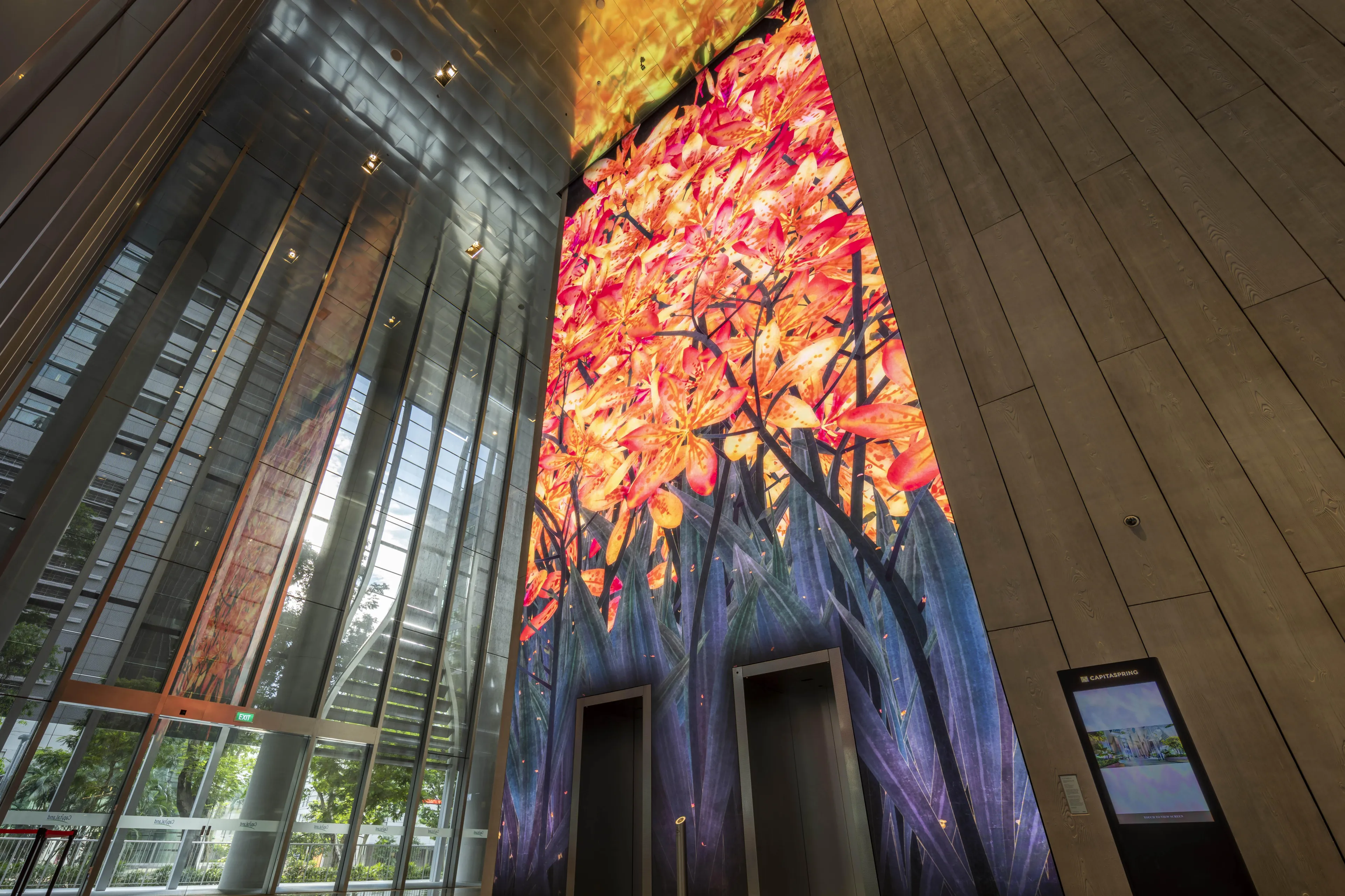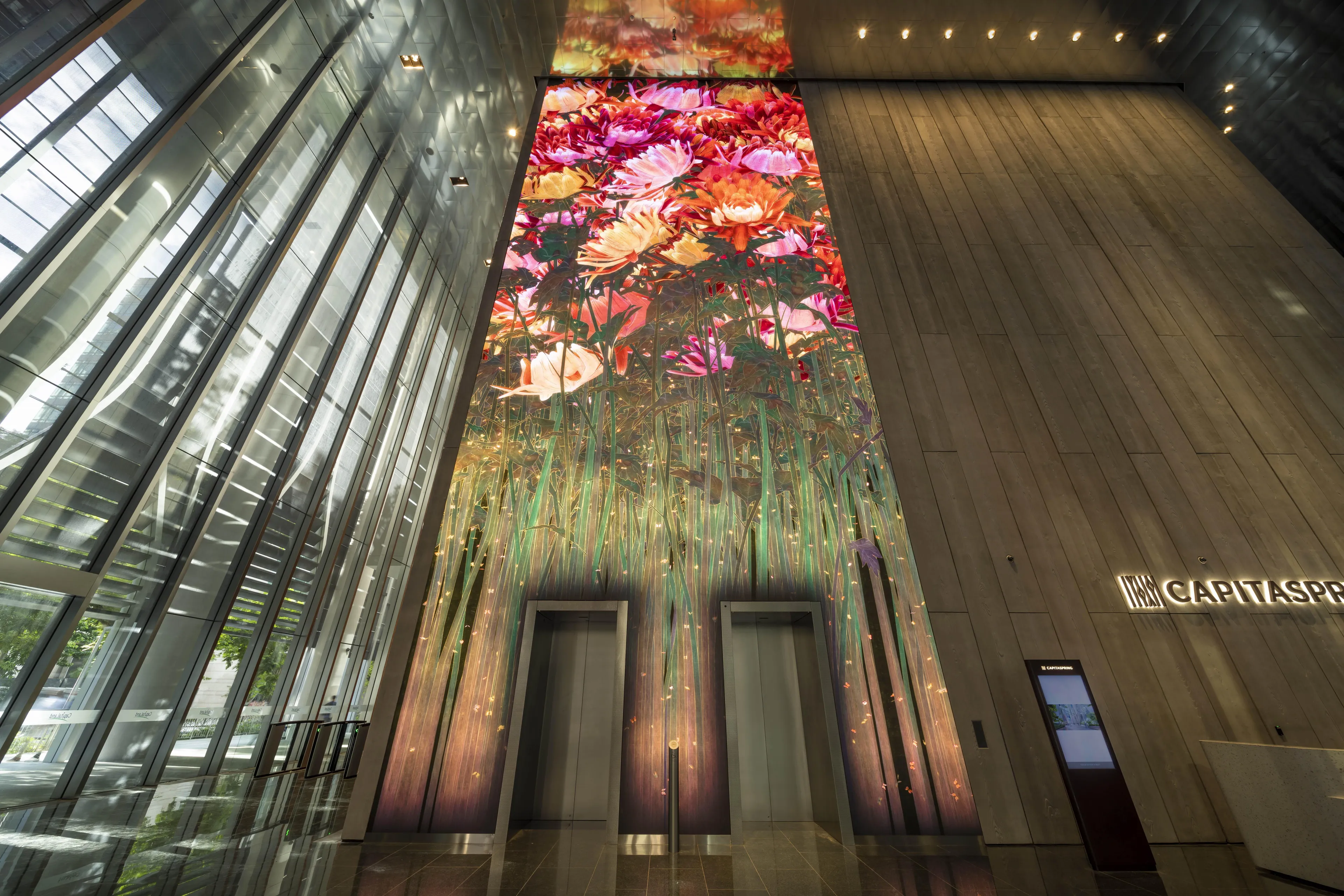 teamLab, 2022, Interactive Digital Installation, W7500 mm H17925 mm , Sound: Hideaki Takahashi