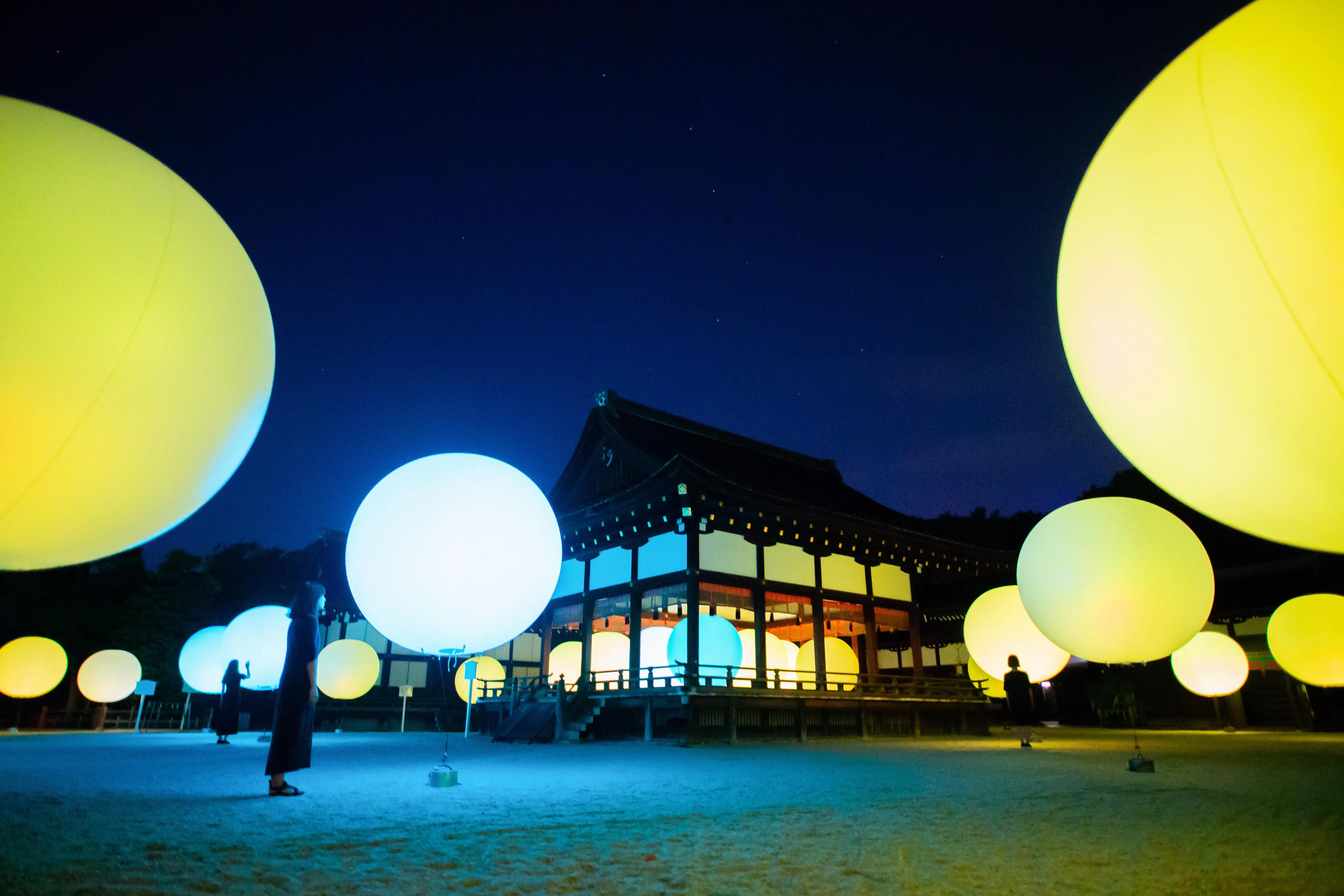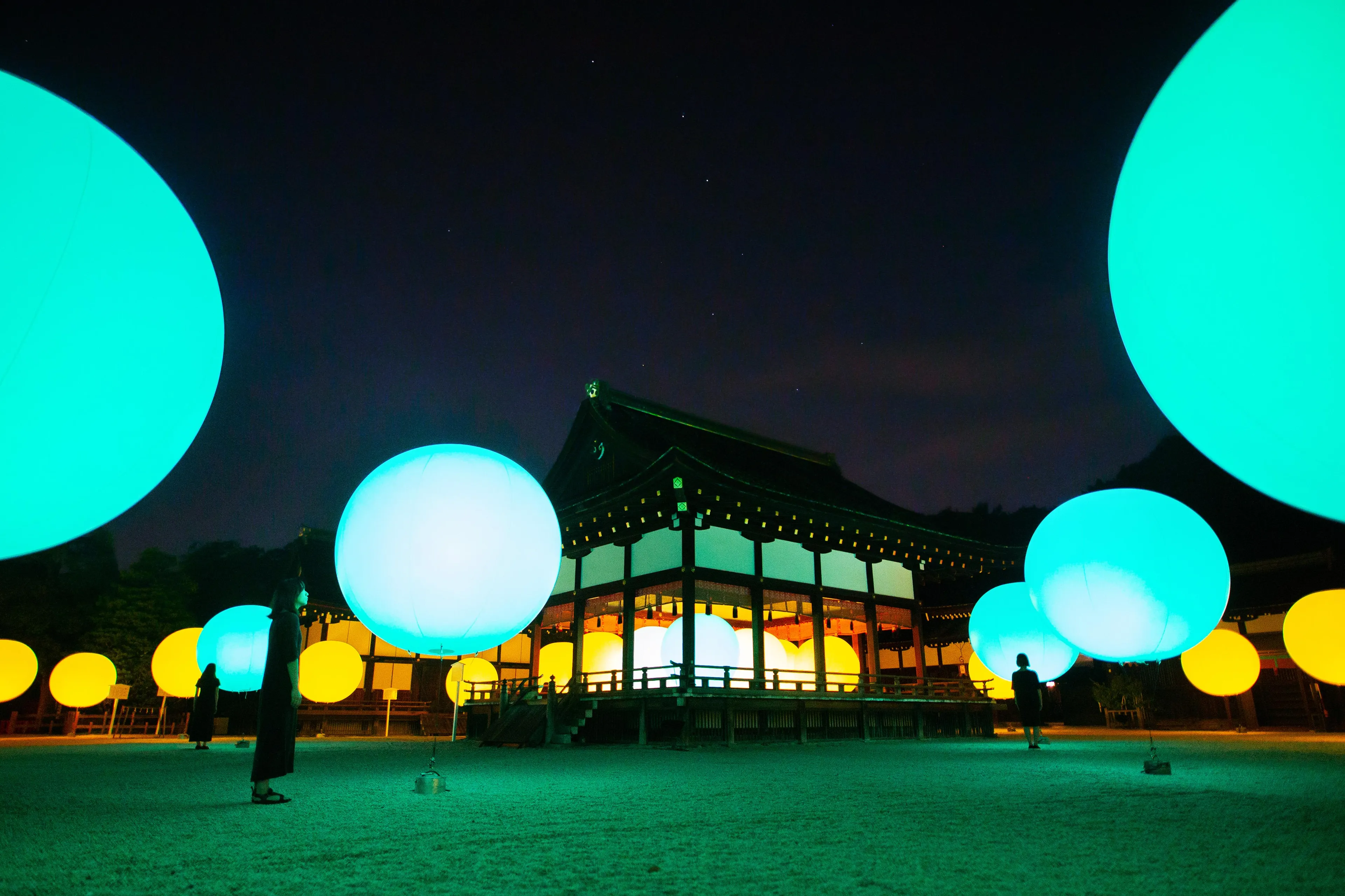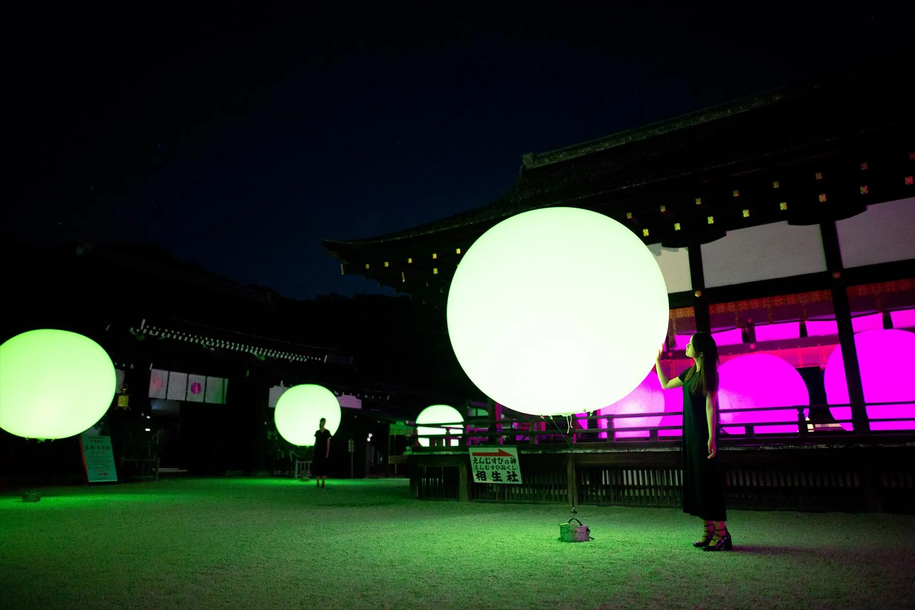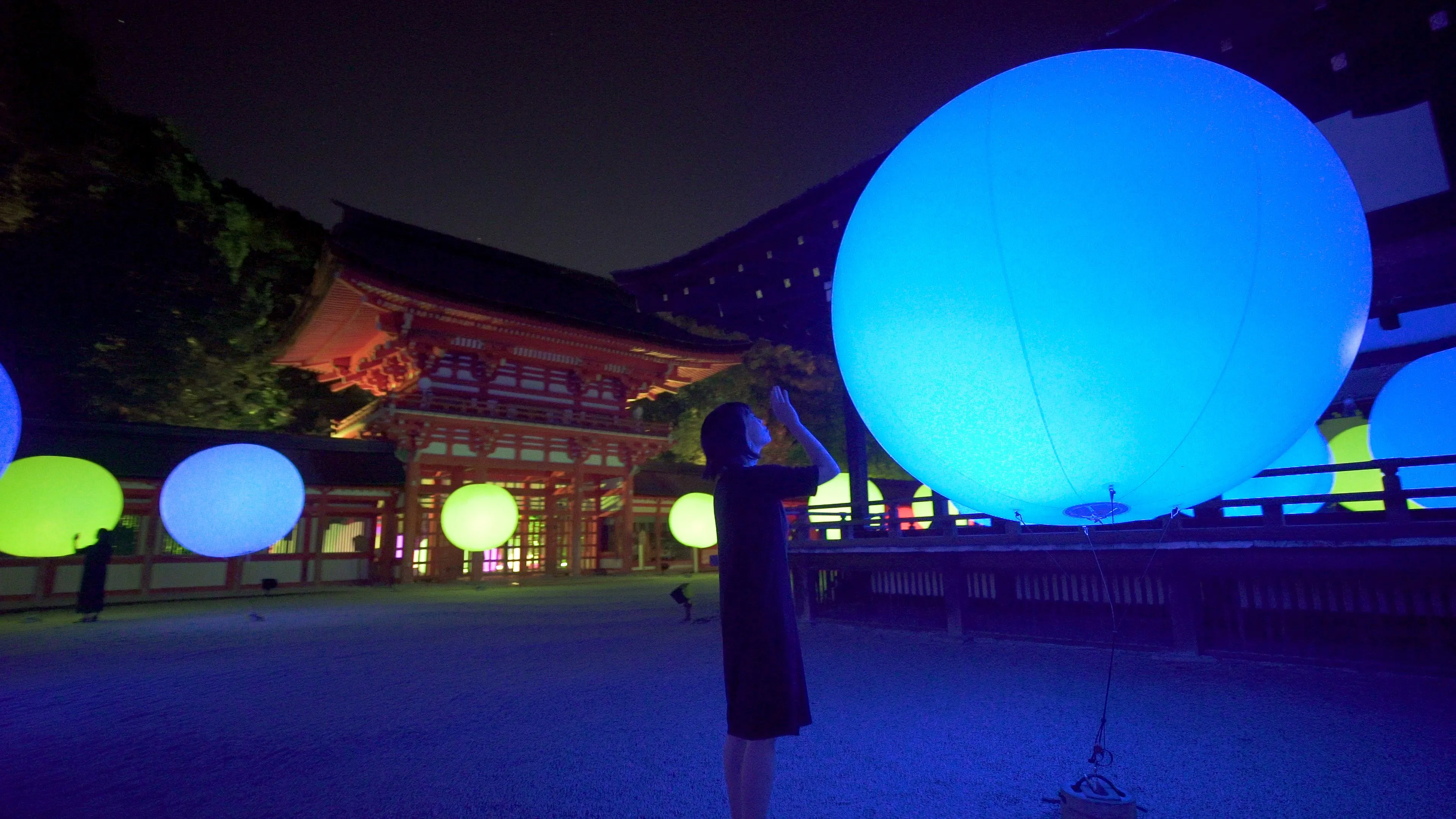 Spheres of light float in the space within the Sakura Gate of Shimogamo Shrine. They move on their own, shining brightly, then disappearing—as if they are softly breathing. When the spheres of light are touched by a person or receive an impact, the color of their light changes, and they emit a musical tone unique to their new color. They can also resonate with the spheres around them, changing to the same color and emitting the same tone, creating a chain reaction.
