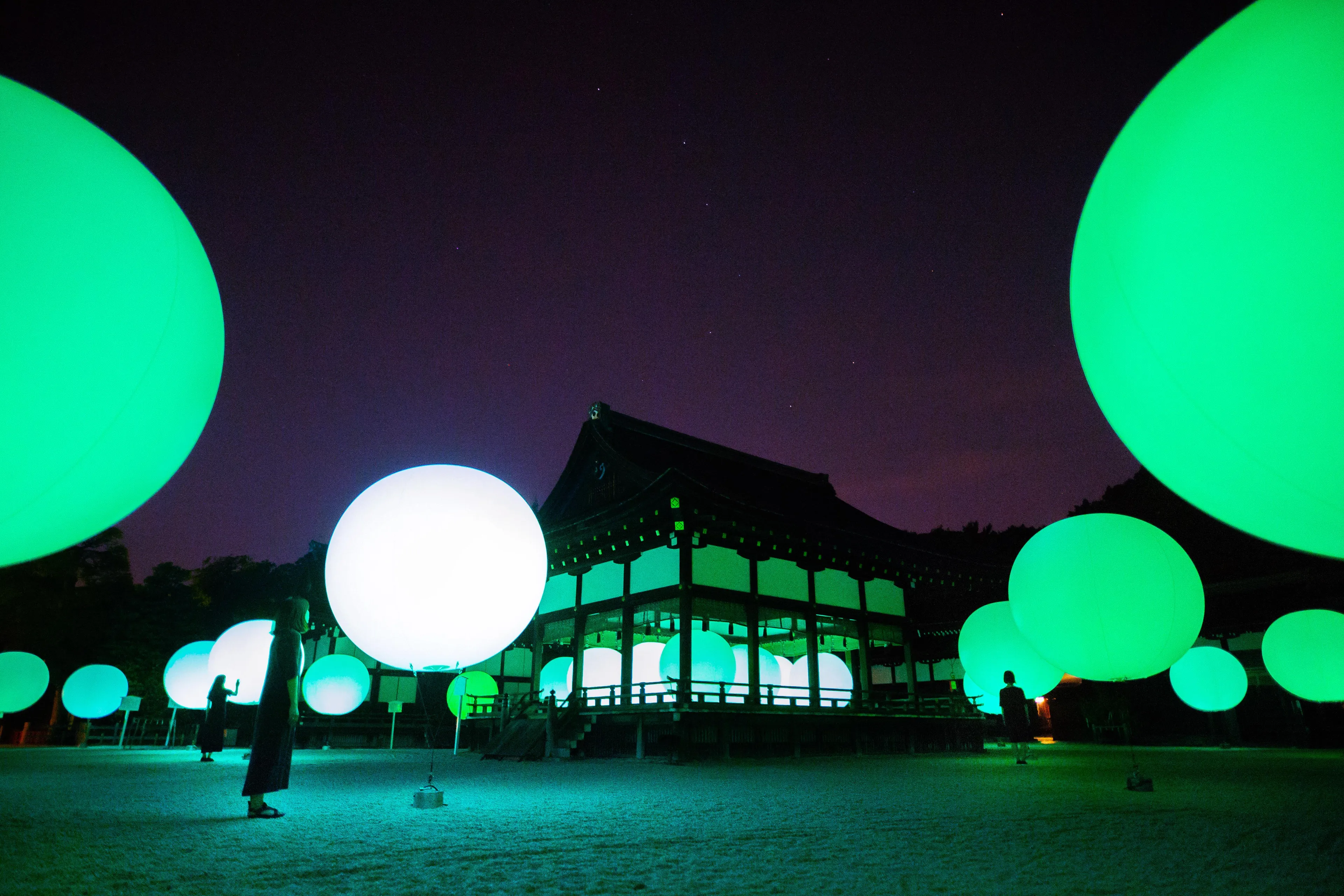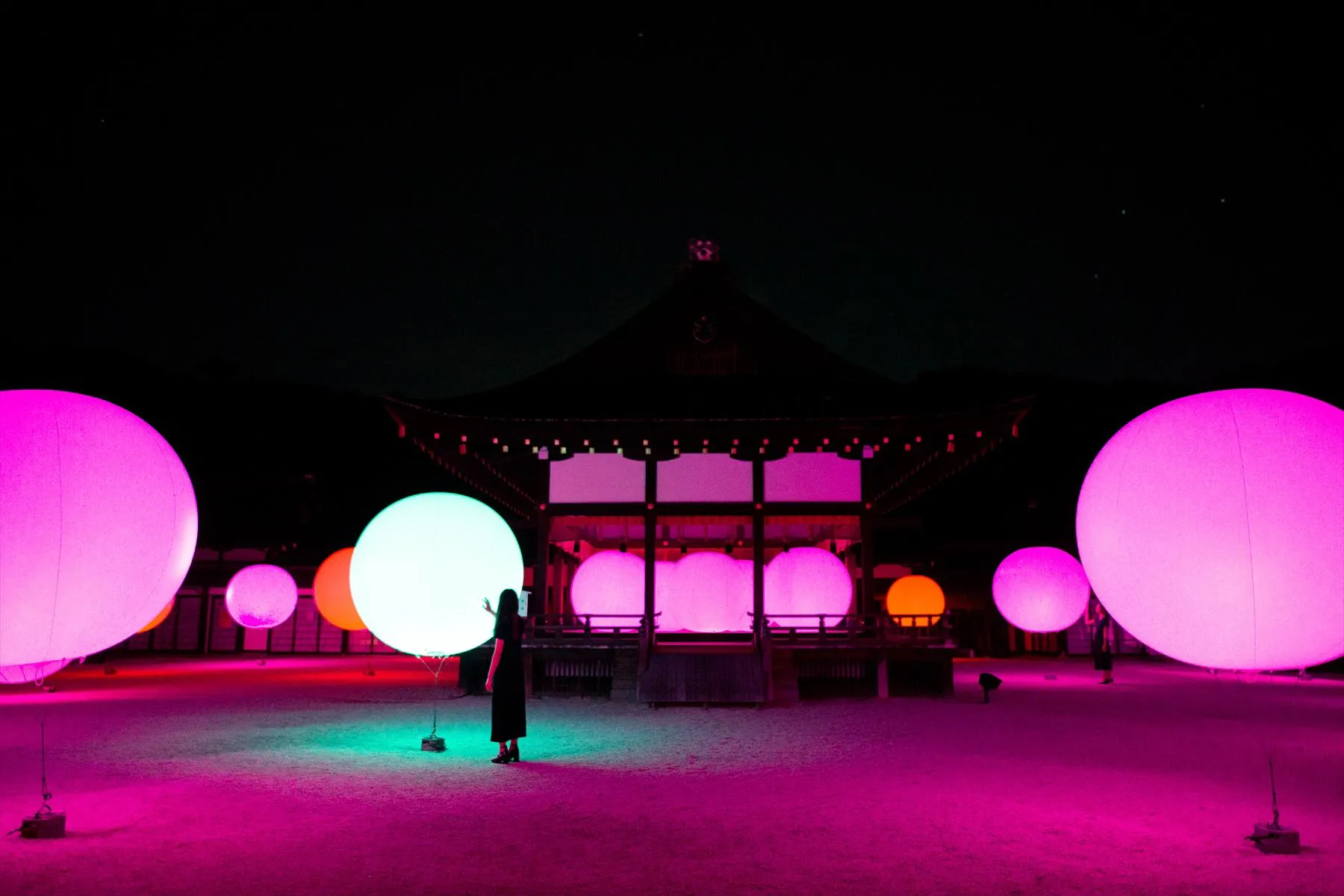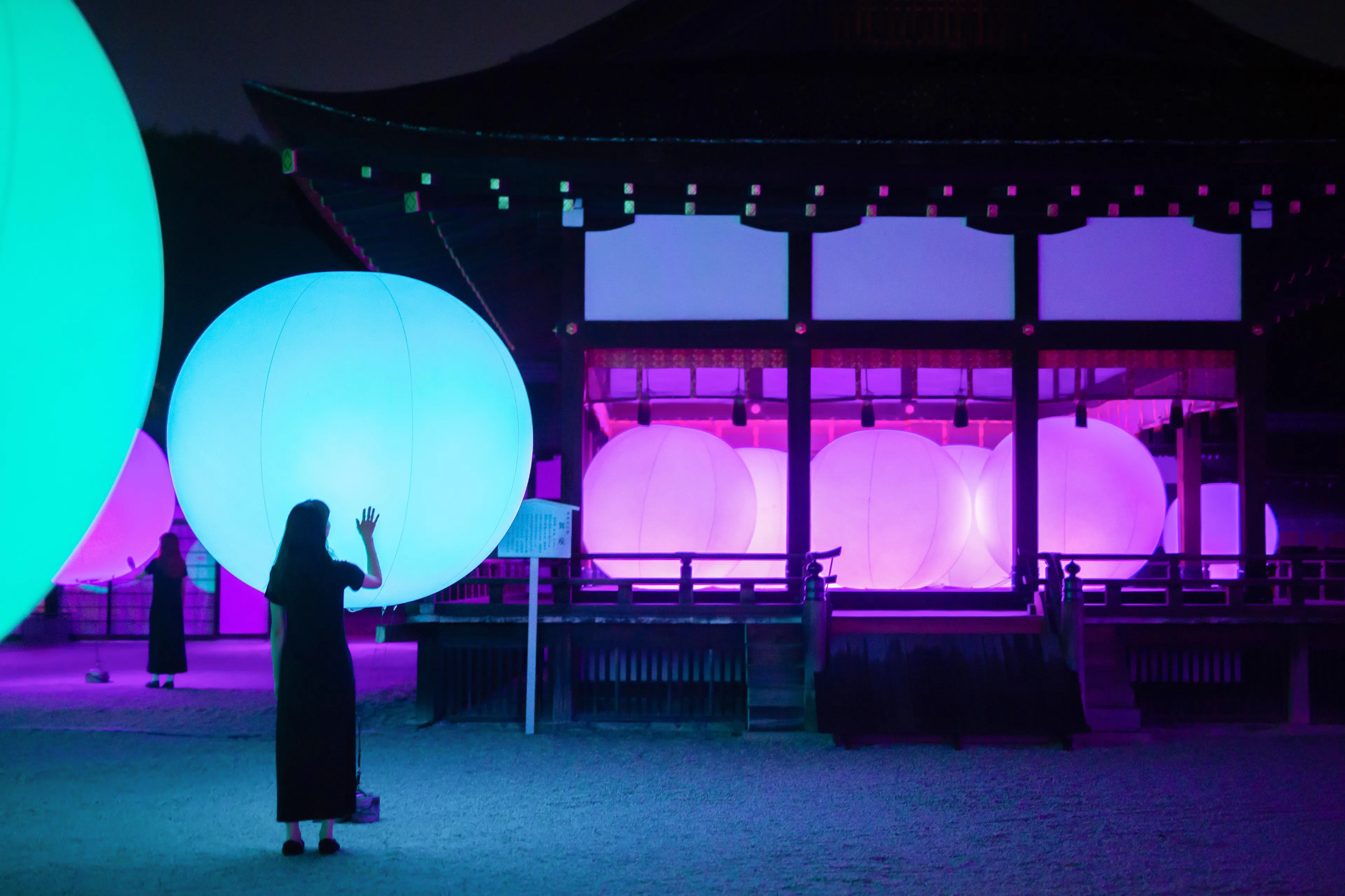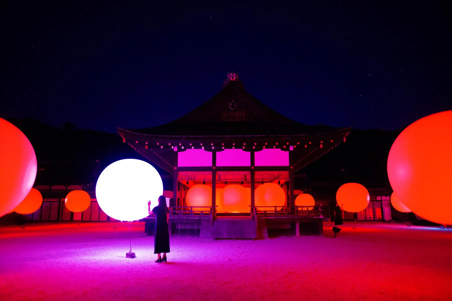 Spheres of light float in the space within the Sakura Gate of Shimogamo Shrine. They move on their own, shining brightly, then disappearing—as if they are softly breathing. When the spheres of light are touched by a person or receive an impact, the color of their light changes, and they emit a musical tone unique to their new color. They can also resonate with the spheres around them, changing to the same color and emitting the same tone, creating a chain reaction.
