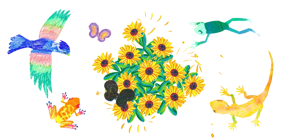 The salamanders eat the snakes, the snakes eat the lizards, the lizards eat the frogs, and the frogs eat the butterflies, each one propagating as they consume. Likewise, the butterflies multiply in places where flowers grow.