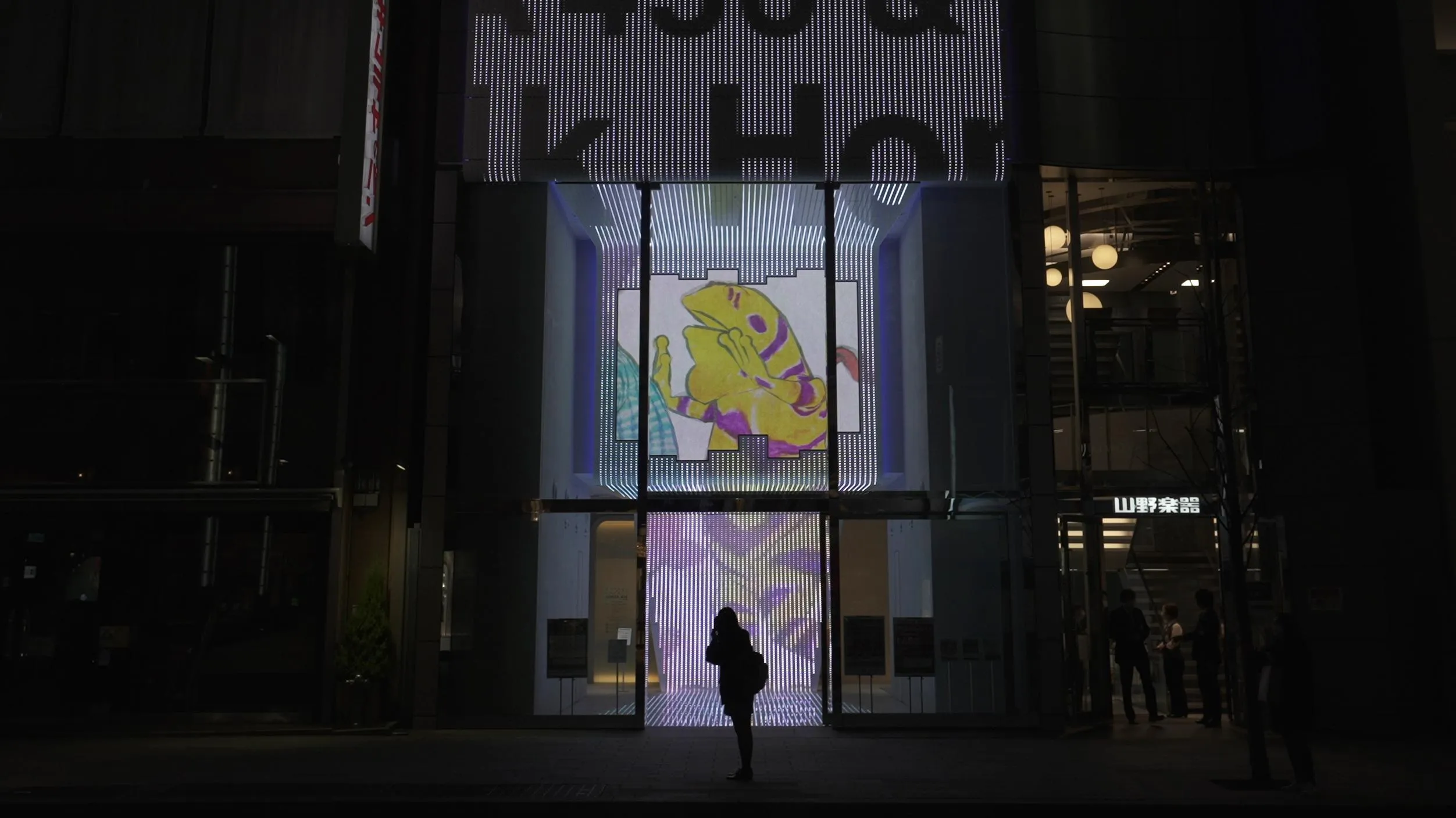 The characters you drew will walk in a line with the characters drawn by people all over the world, and they will start to walk around on TVs throughout the world. They will also walk life-size through the basement of GINZA 456.