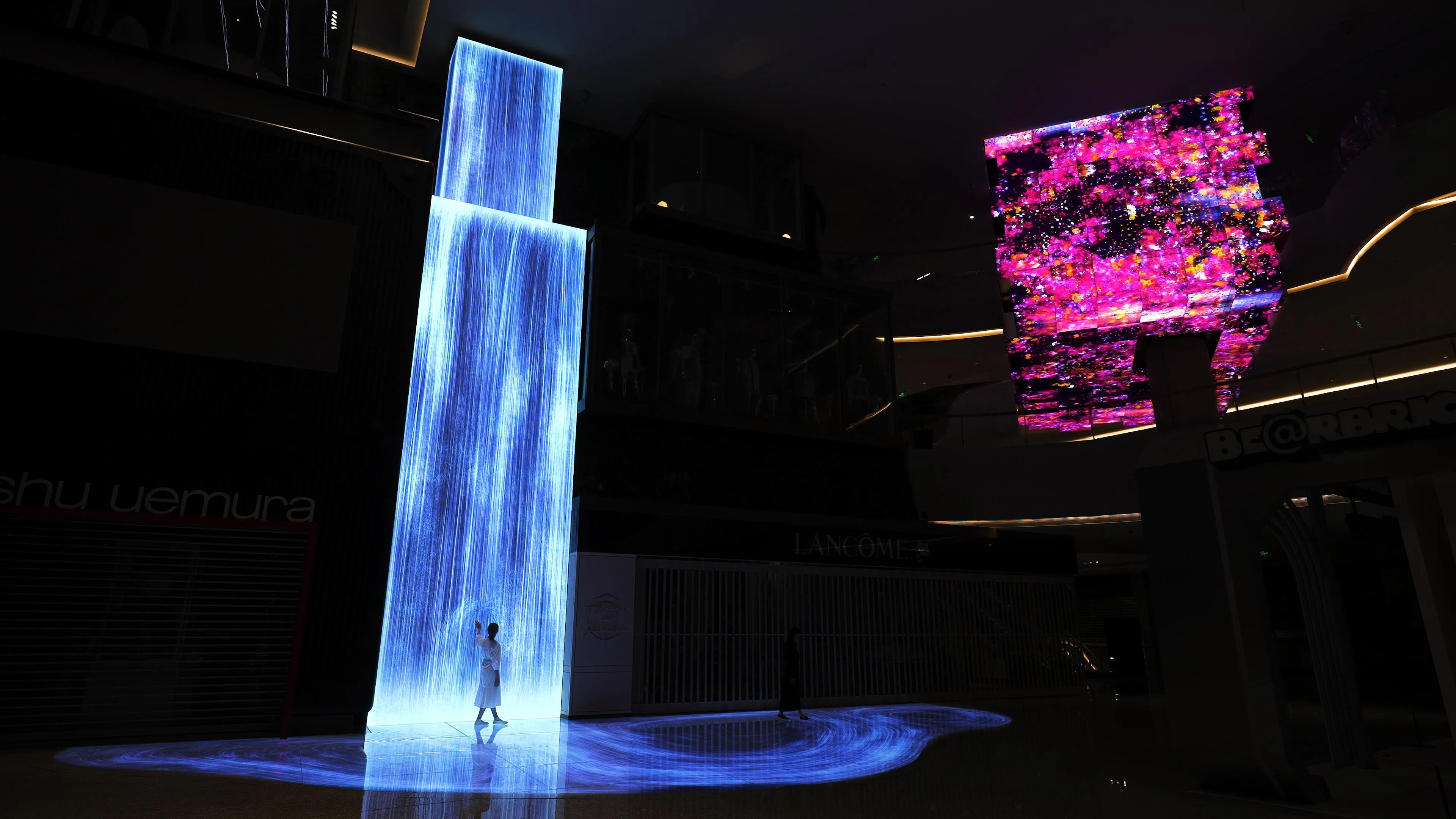 The waterfall was created by reproducing the space of C Future City in a three-dimensional space on a computer, letting water fall into it, and simulating the movement of water as influenced by the shape of the space. As people approach the waterfall, the flow of the water changes. It is a universe of water particles influenced by C Future City and the people there.