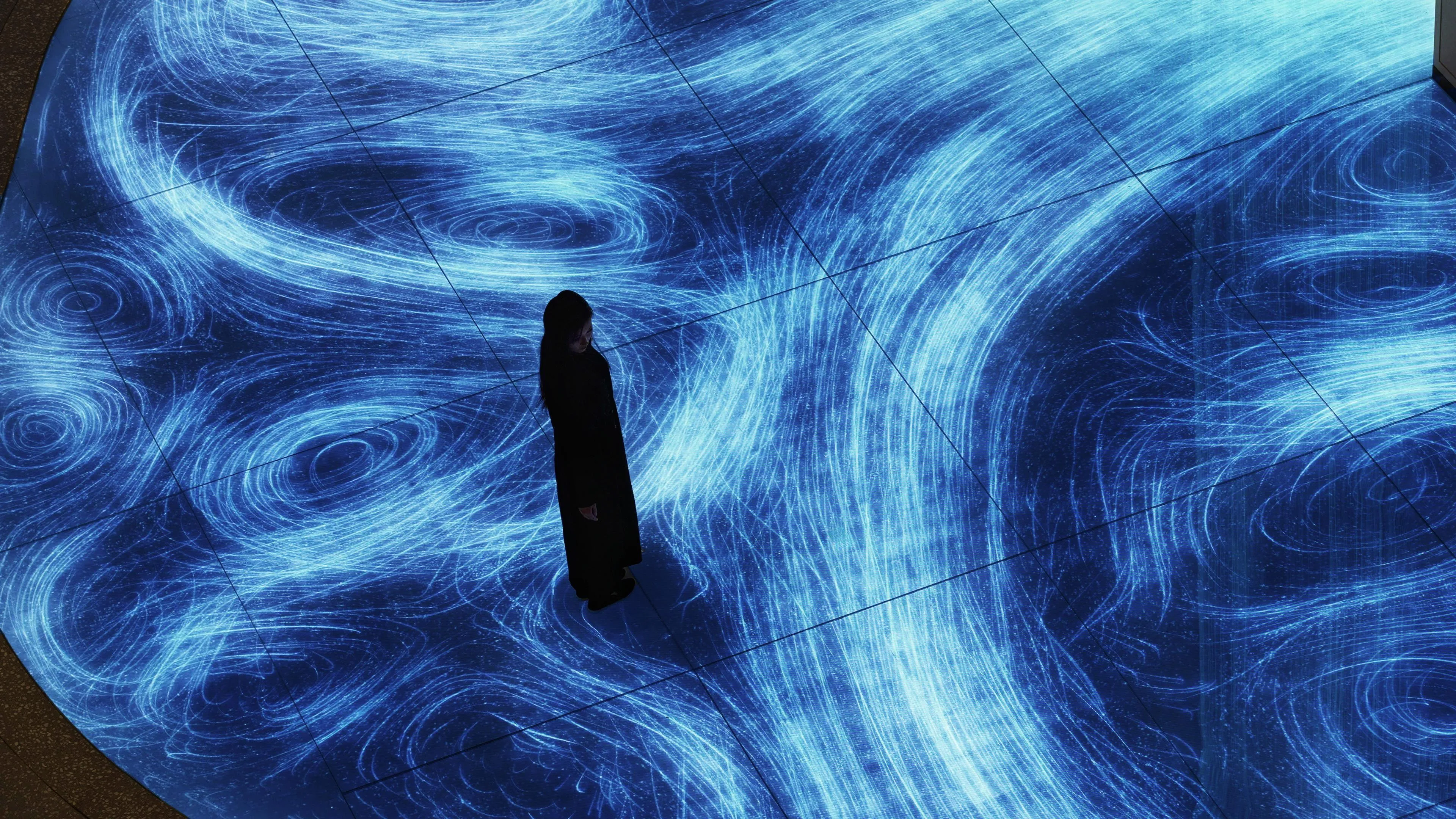 Water is represented as a continuum of numerous water particles. The interaction between the particles is calculated, and lines are drawn in relation to the behavior of the water particles. The lines are “flattened” using what teamLab considers to be Ultrasubjective Space.