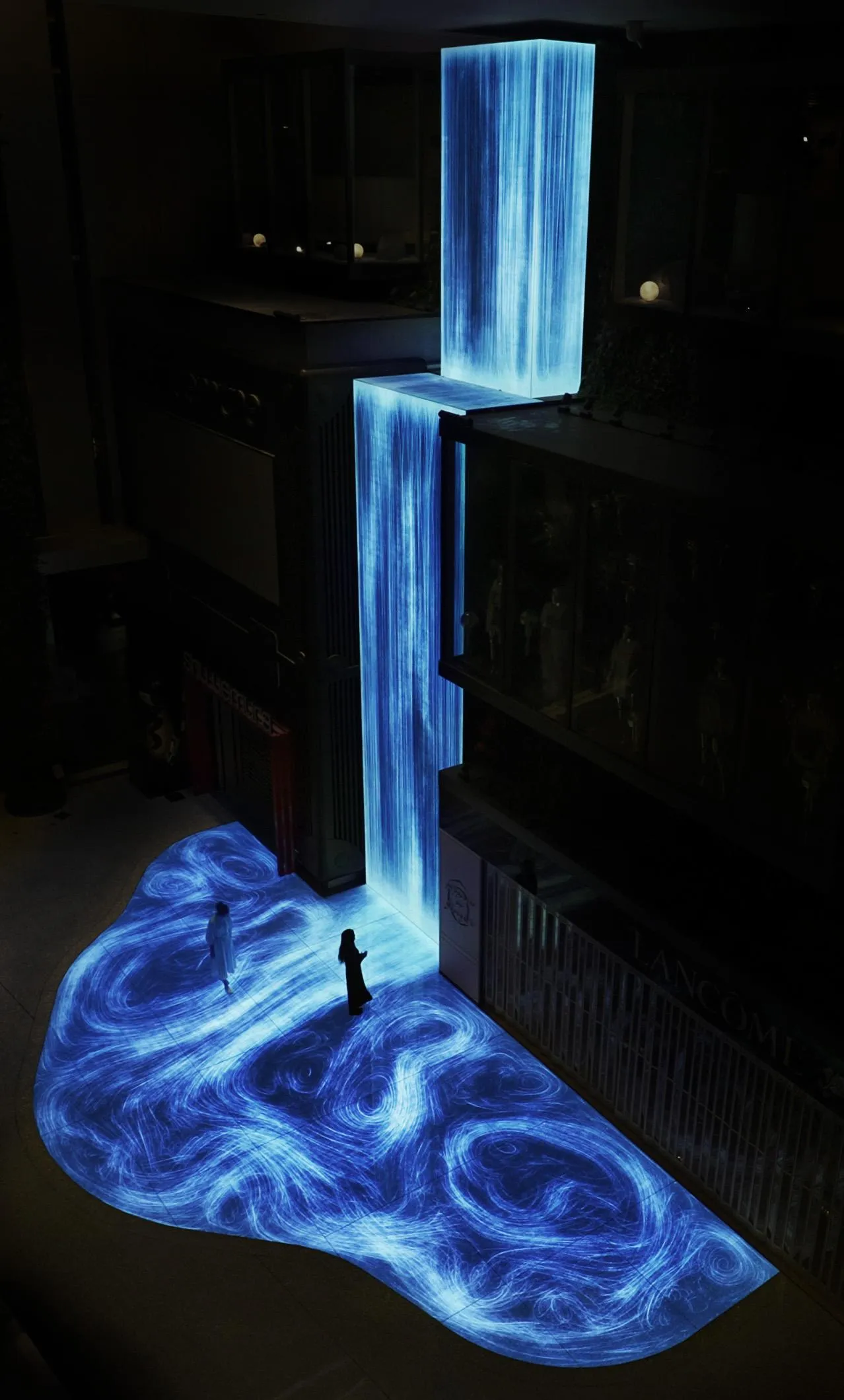 When a person moves, a force is applied in that direction, thereby generating a flow. The difference in the velocities of the flow and the surrounding area creates a vortex. Force is also applied by the cascading waterfall. The waterfall is changed by the presence of people, and vortices are born due to the movements of people.